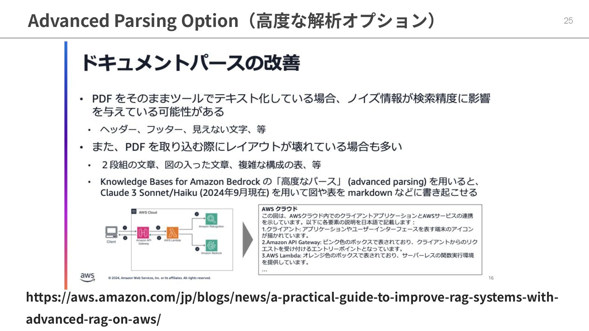 Advanced Parsing Option(⾼度な解析オプション) 25 https://aws.amazon.com/jp/blogs/news/a-practical-guide-to-improve-rag-systems-with- advanced-rag-on-aws/
