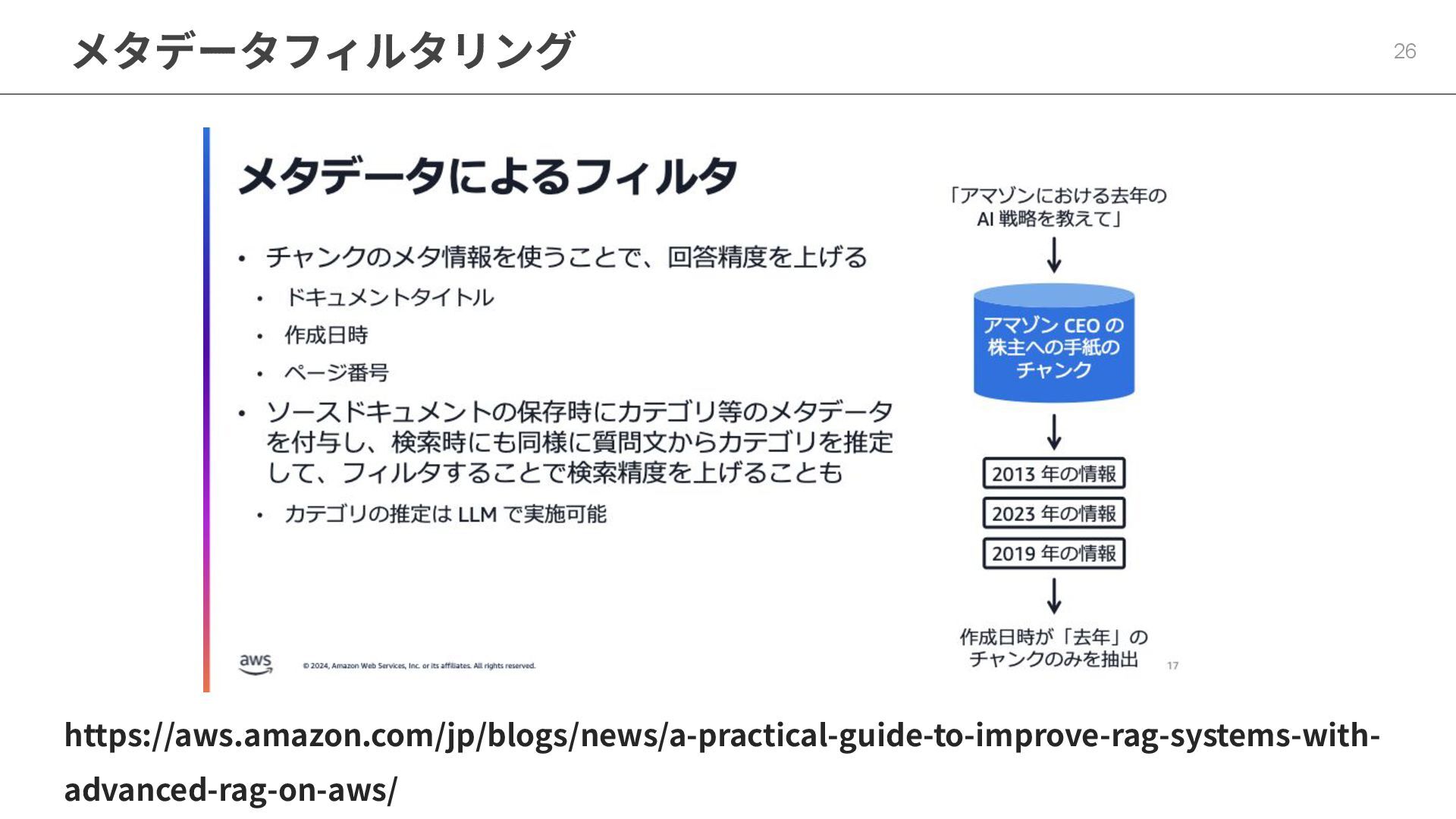 メタデータフィルタリング 26 https://aws.amazon.com/jp/blogs/news/a-practical-guide-to-improve-rag-systems-with- advanced-rag-on-aws/