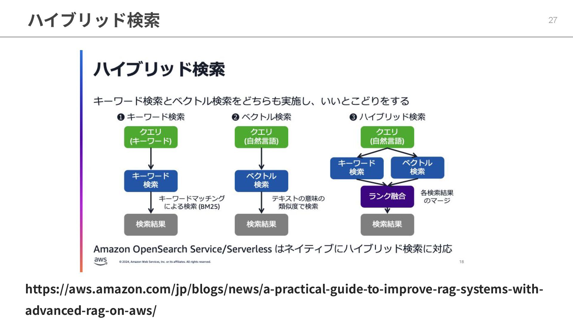 ハイブリッド検索 27 https://aws.amazon.com/jp/blogs/news/a-practical-guide-to-improve-rag-systems-with- advanced-rag-on-aws/