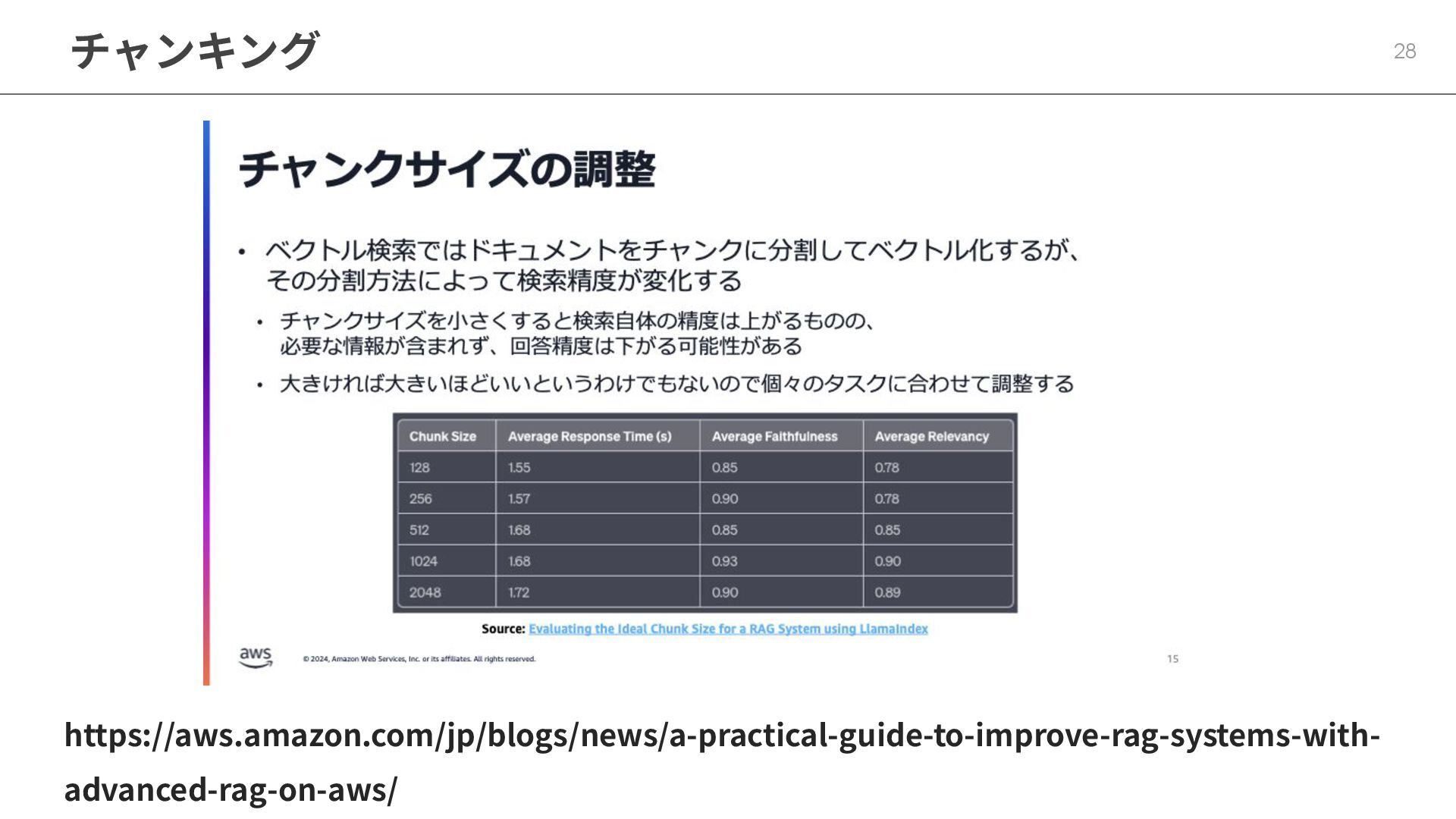 チャンキング 28 https://aws.amazon.com/jp/blogs/news/a-practical-guide-to-improve-rag-systems-with- advanced-rag-on-aws/