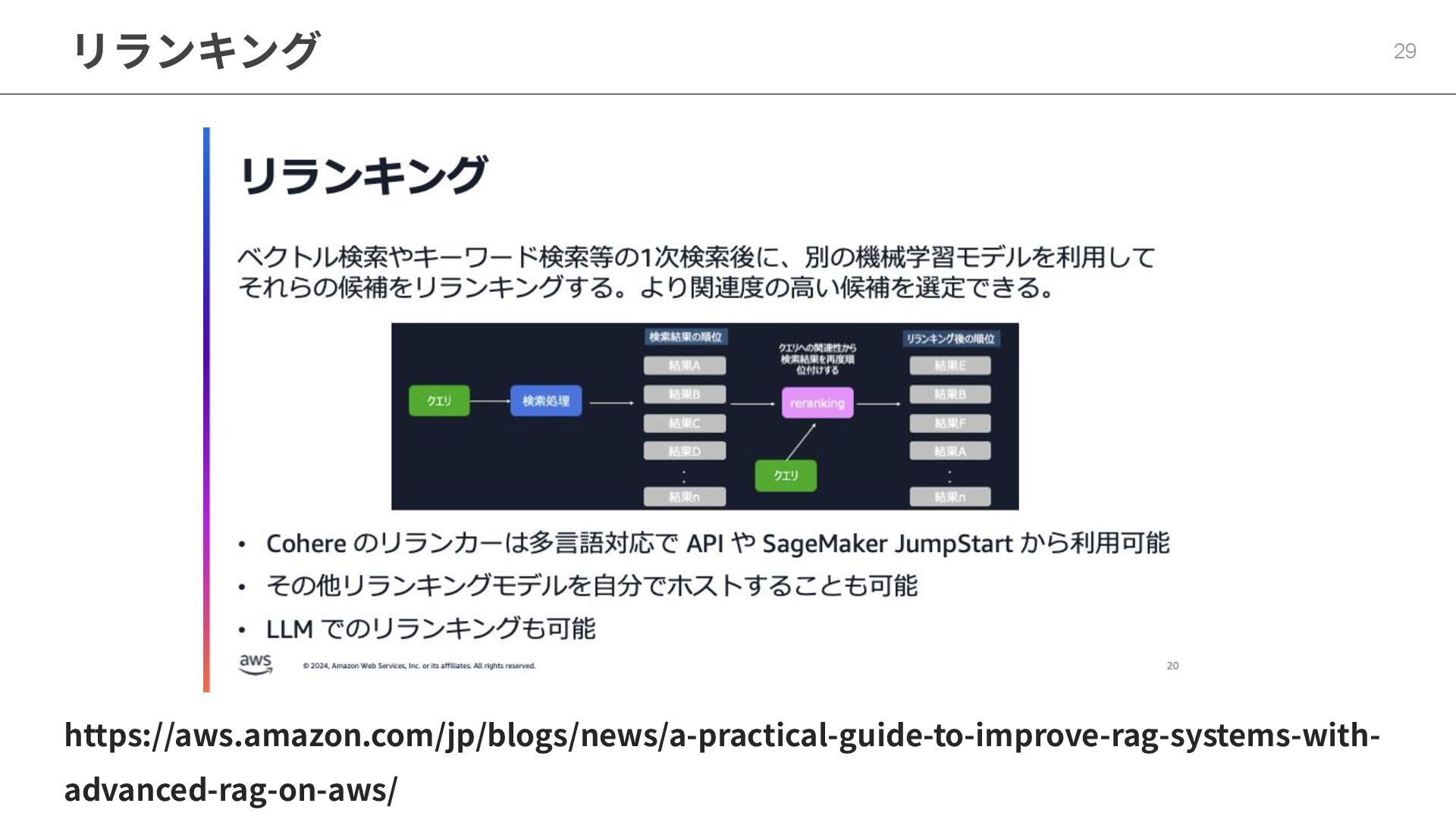 リランキング 29 https://aws.amazon.com/jp/blogs/news/a-practical-guide-to-improve-rag-systems-with- advanced-rag-on-aws/