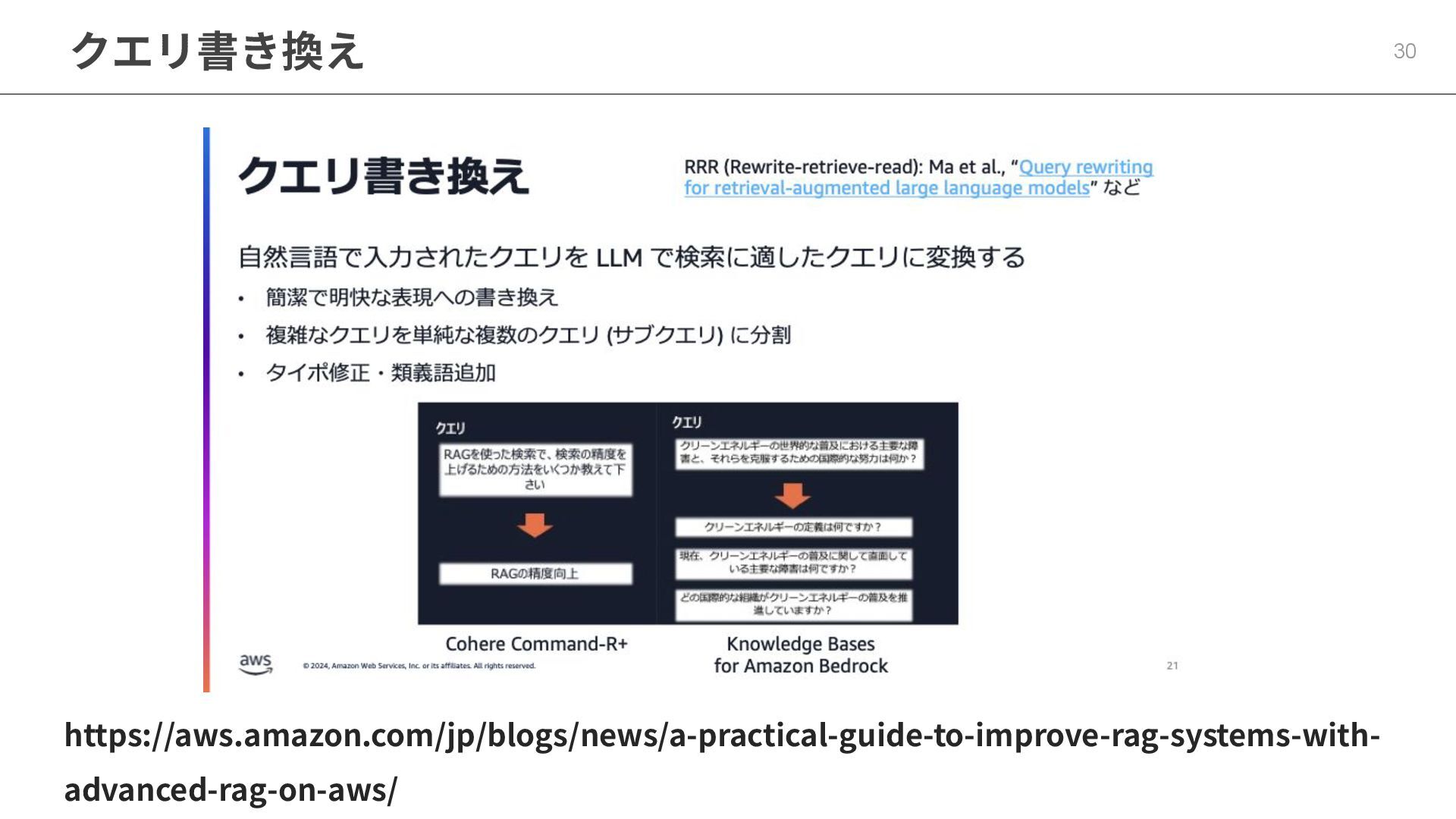 クエリ書き換え 30 https://aws.amazon.com/jp/blogs/news/a-practical-guide-to-improve-rag-systems-with- advanced-rag-on-aws/
