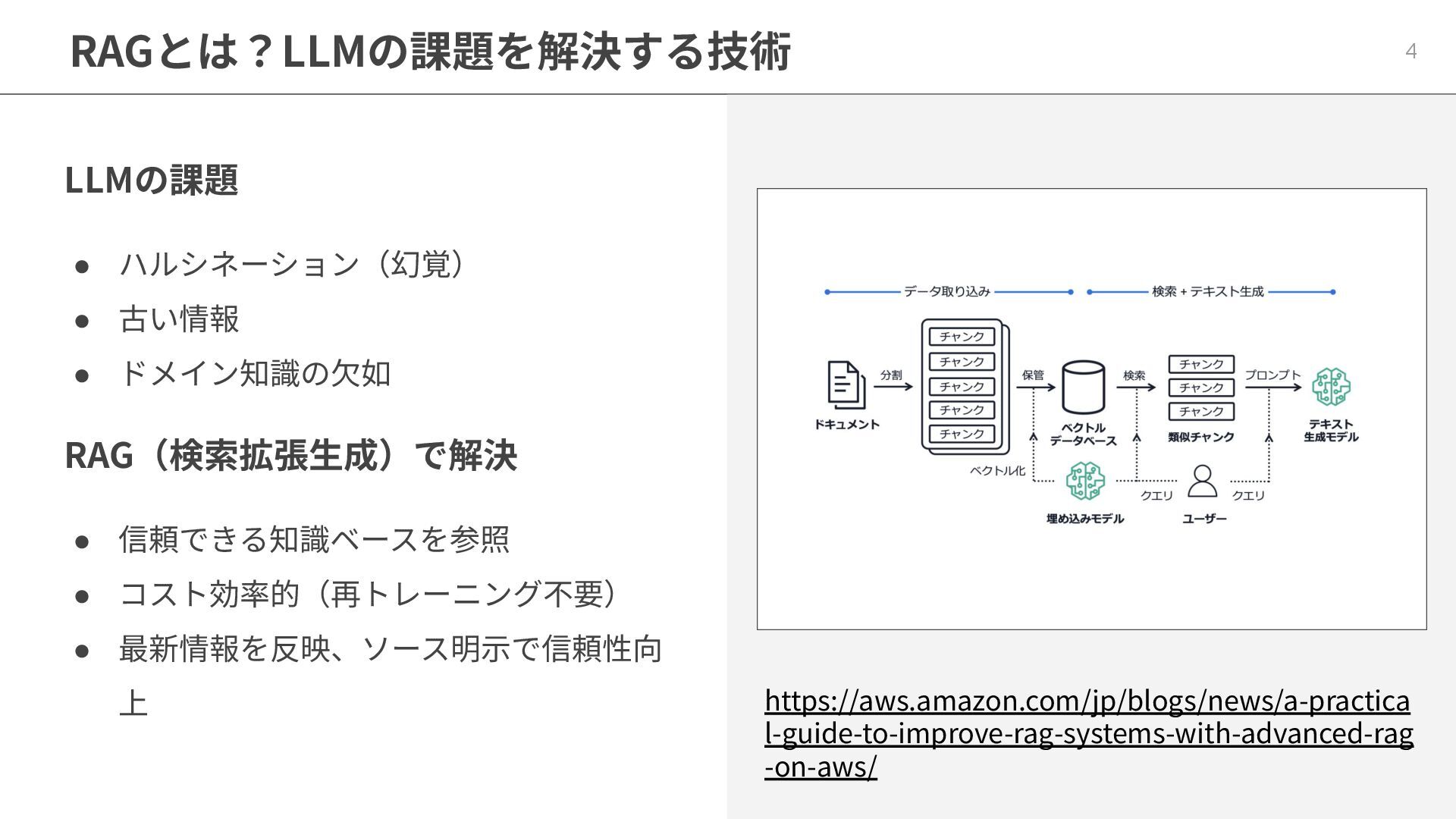 • 信頼できる知識ベースを参照 • コスト効率的(再トレーニング不要) • 最新情報を反映、ソース明⽰で信頼性向 上 https://aws.amazon.com/jp/blogs/news/a-practica l-guide-to-improve-rag-systems-with-advanced-rag -on-aws/