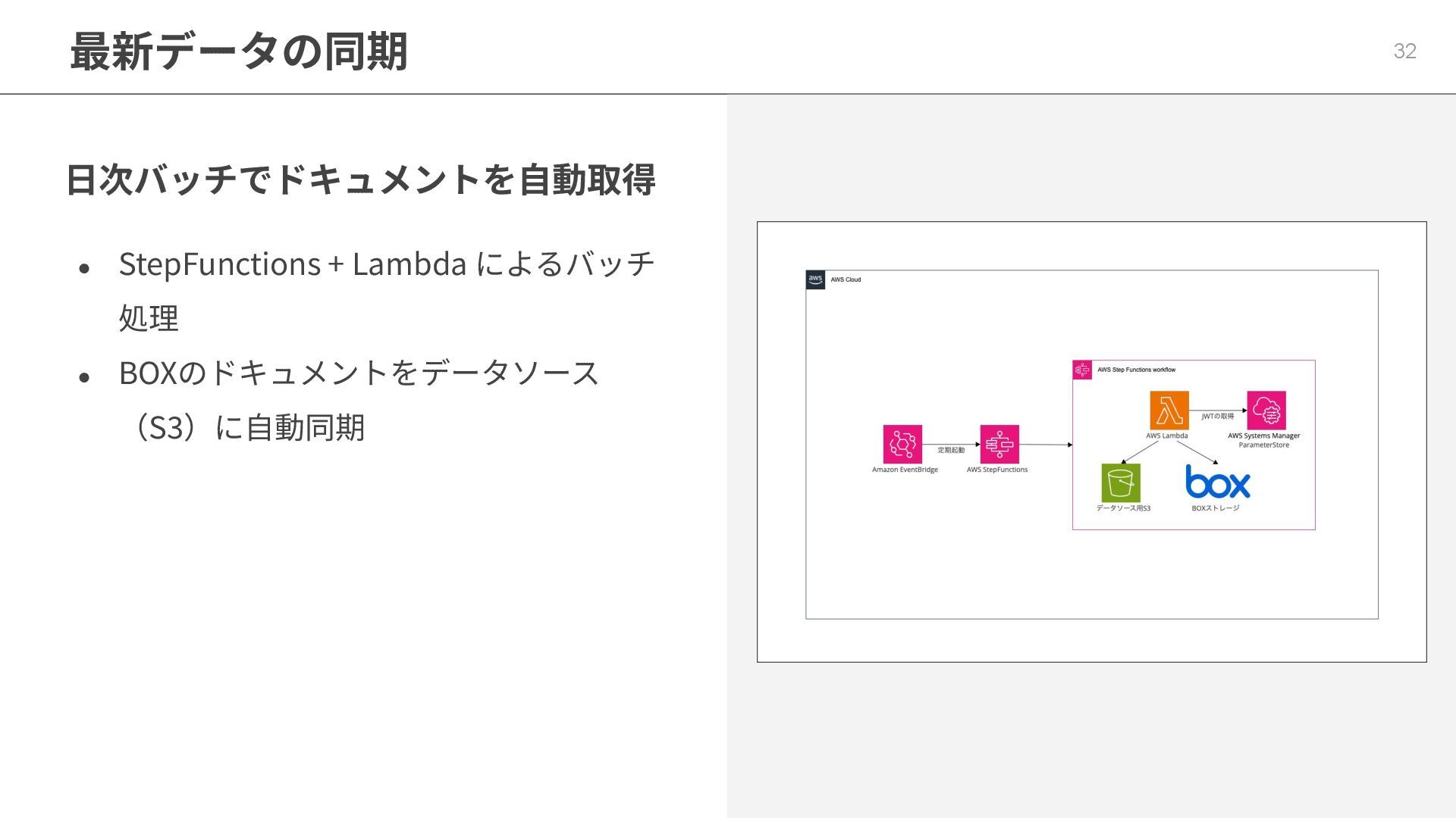 最新データの同期 32 ⽇次バッチでドキュメントを⾃動取得 • StepFunctions + Lambda によるバッチ 処理 •