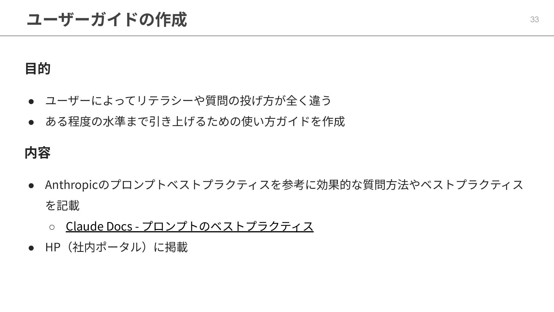 ユーザーガイドの作成 33 ⽬的 • ユーザーによってリテラシーや質問の投げ⽅が全く違う • ある程度の⽔準まで引き上げるための使い⽅ガイドを作成 内容 • Anthropicのプロンプトベストプラクティスを参考に効果的な質問⽅法やベストプラクティス