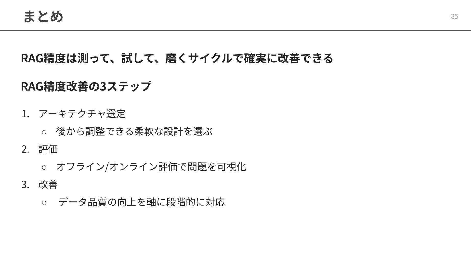 まとめ 35 RAG精度は測って、試して、磨くサイクルで確実に改善できる RAG精度改善の3ステップ 1. アーキテクチャ選定 ◦ 後から調整できる柔軟な設計を選ぶ 2. 評価
