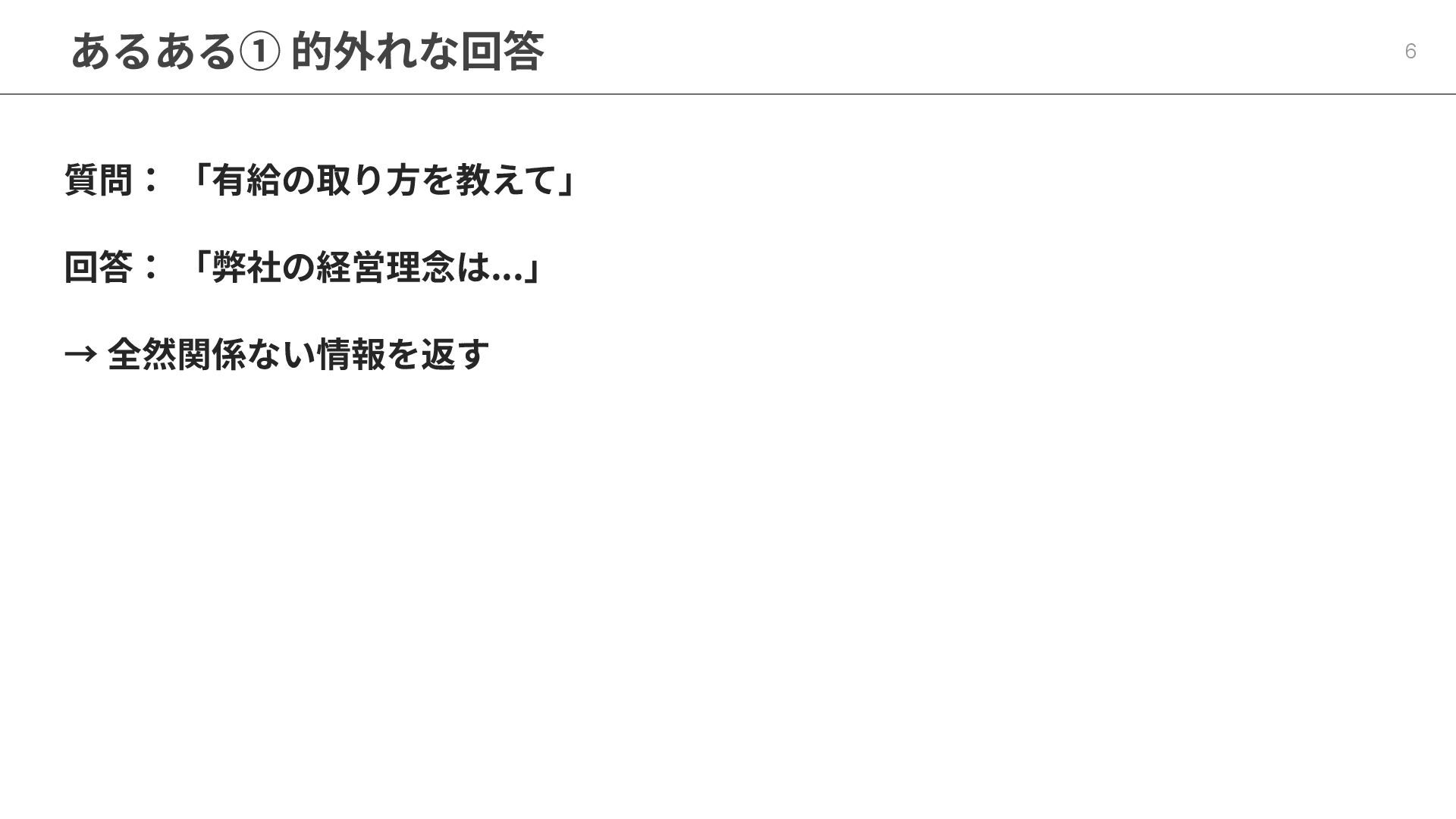 あるある① 的外れな回答 6 質問: 「有給の取り⽅を教えて」 回答: 「弊社の経営理念は...」 → 全然関係ない情報を返す