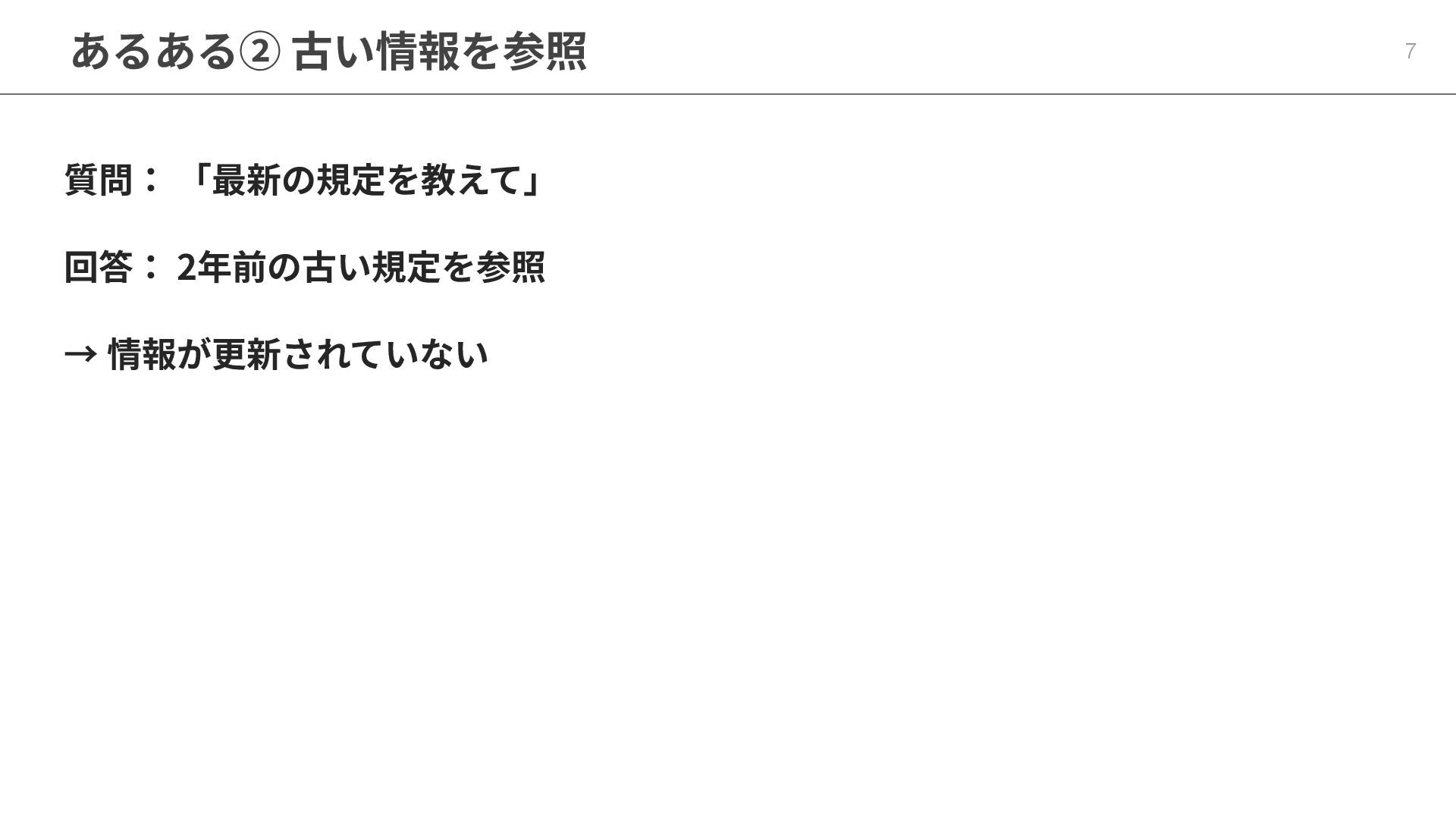 あるある② 古い情報を参照 7 質問: 「最新の規定を教えて」 回答: 2年前の古い規定を参照 → 情報が更新されていない