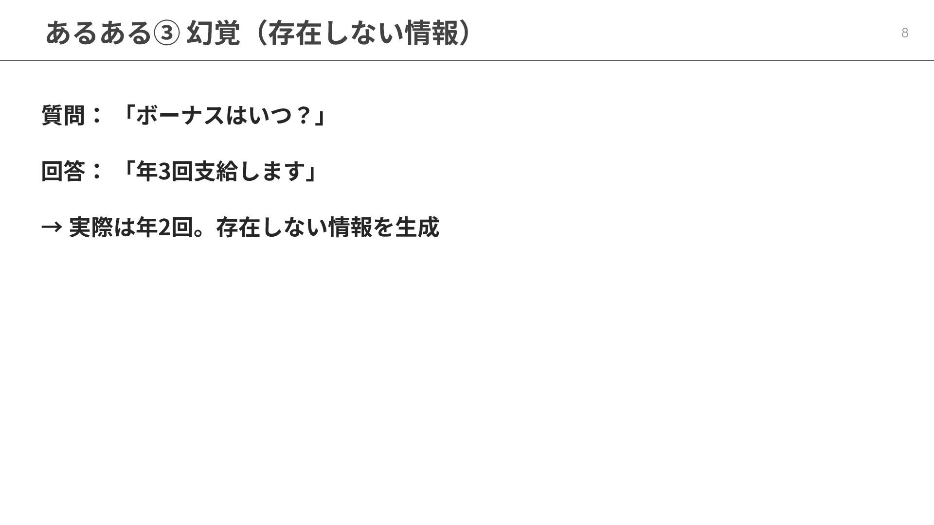 あるある③ 幻覚(存在しない情報) 8 質問: 「ボーナスはいつ?」 回答: 「年3回⽀給します」 → 実際は年2回。存在しない情報を⽣成