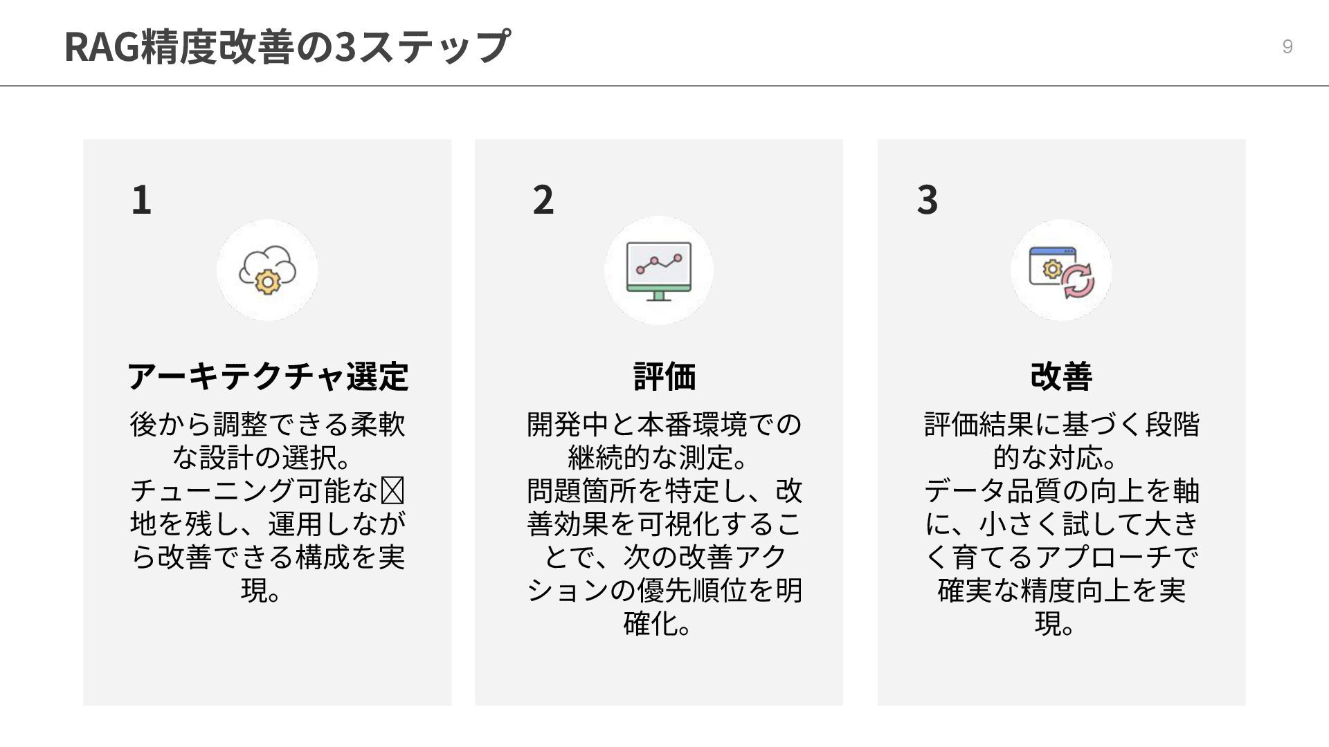 現。 1 2 3 開発中と本番環境での 継続的な測定。 問題箇所を特定し、改 善効果を可視化するこ とで、次の改善アク ションの優先順位を明 確化。 評価結果に基づく段階 的な対応。 データ品質の向上を軸 に、⼩さく試して⼤き く育てるアプローチで 確実な精度向上を実 現。