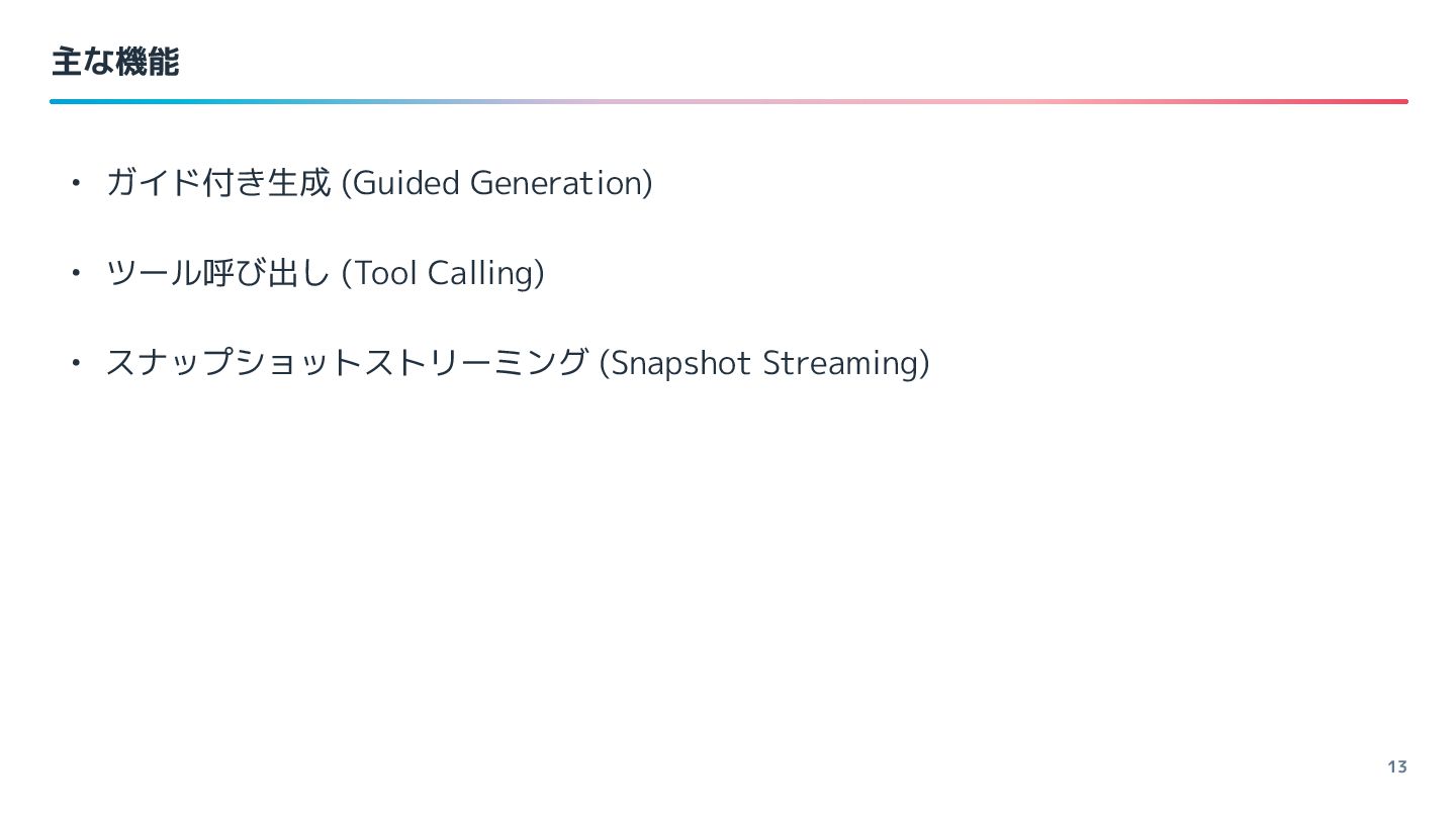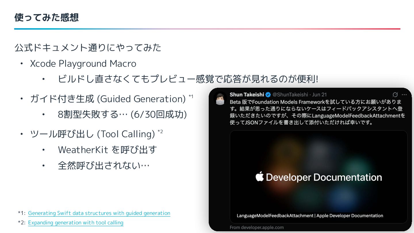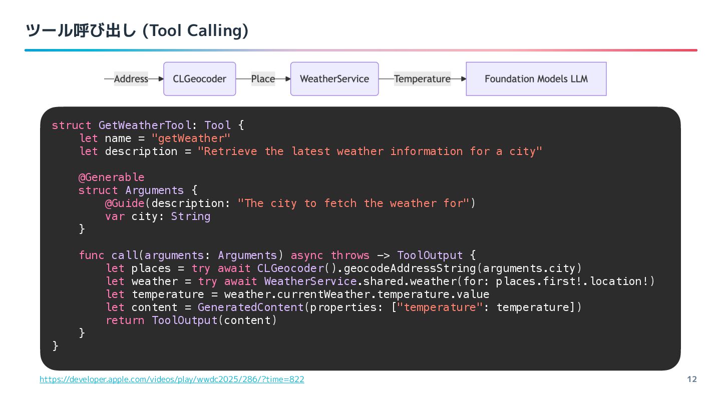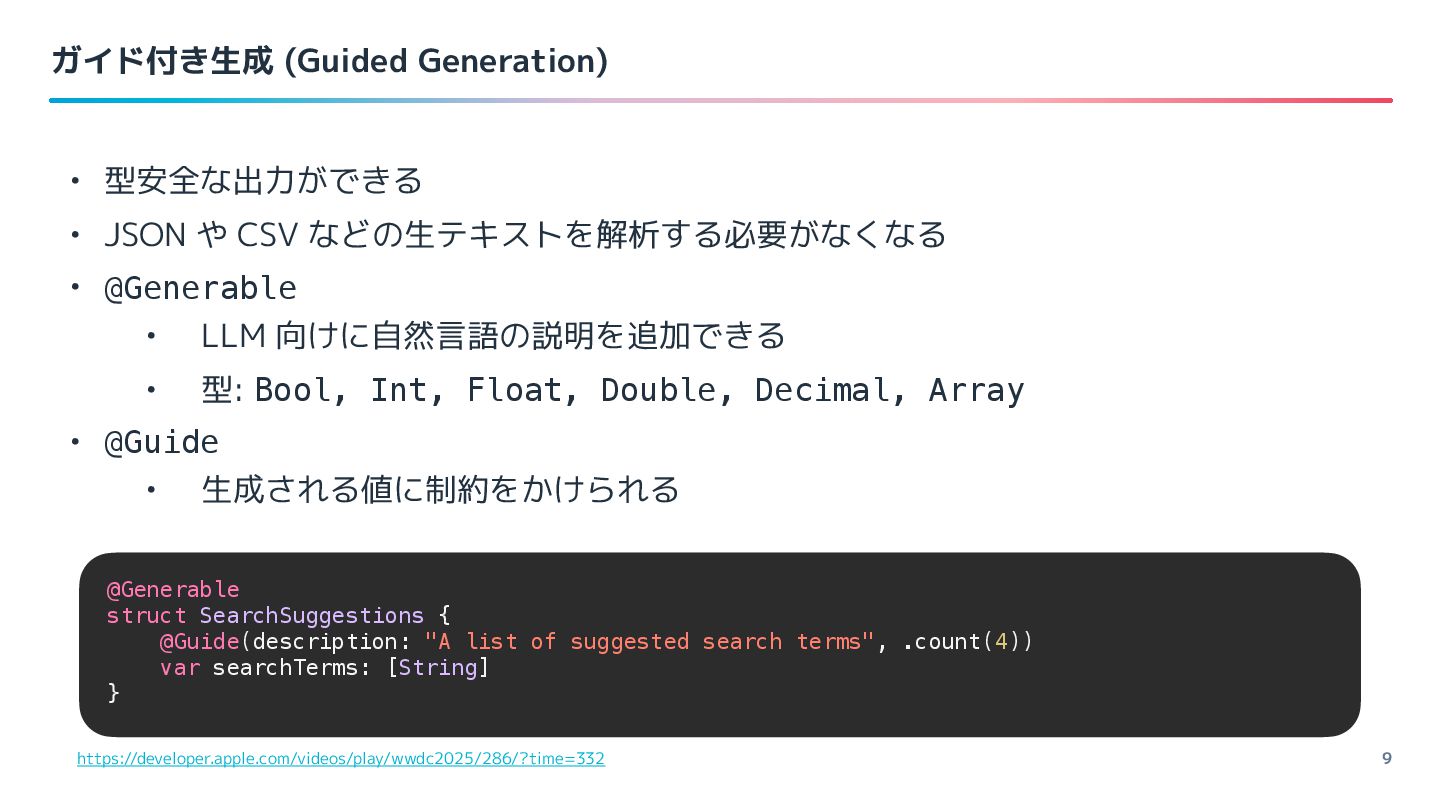 • @Generable • LLM 向けに自然言語の説明を追加できる • 型: Bool, Int, Float, Double, Decimal, Array • @Guide • 生成される値に制約をかけられる 9 @Generable struct SearchSuggestions { @Guide(description: "A list of suggested search terms", .count(4)) var searchTerms: [String] } https://developer.apple.com/videos/play/wwdc2025/286/?time=332