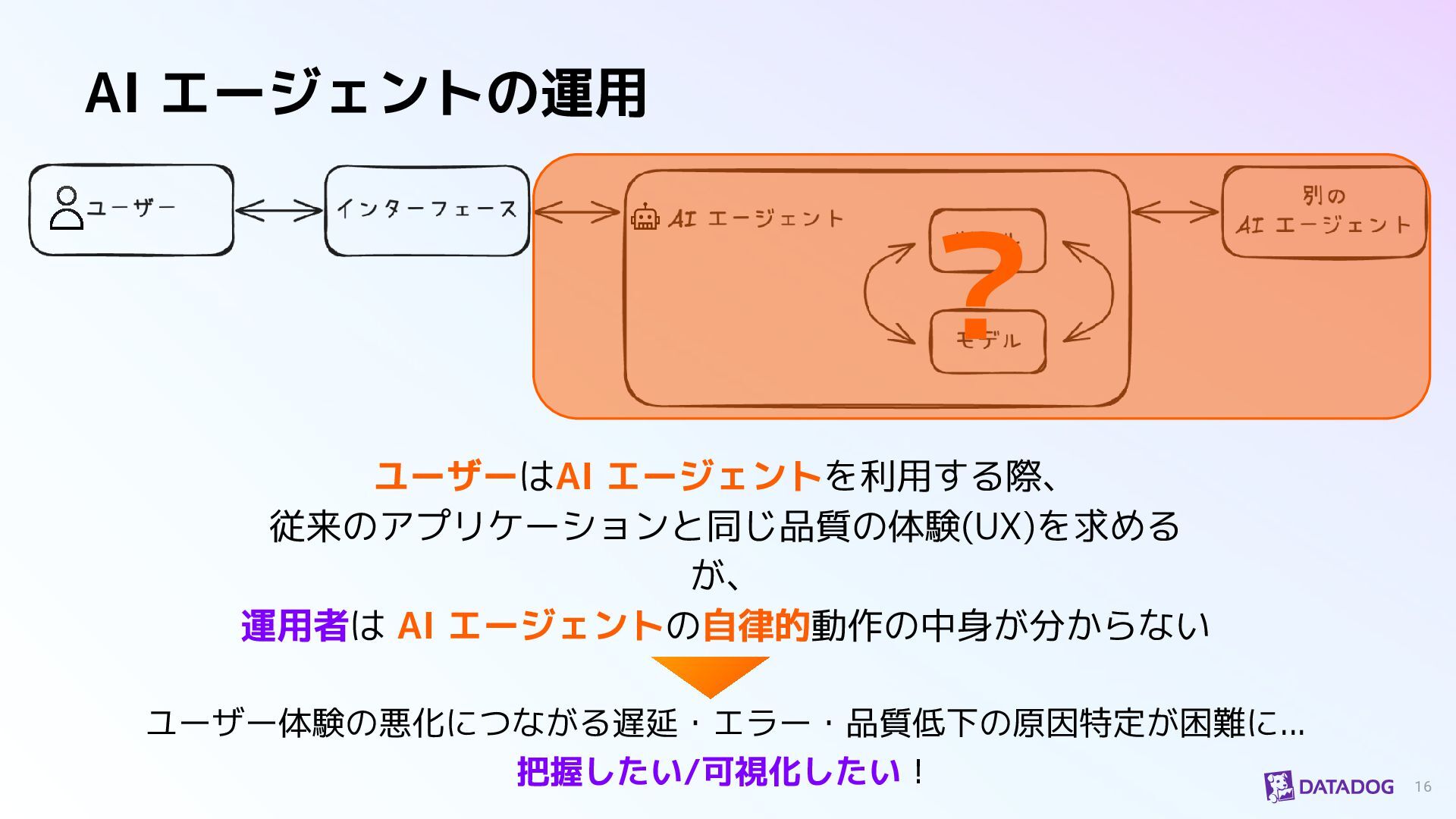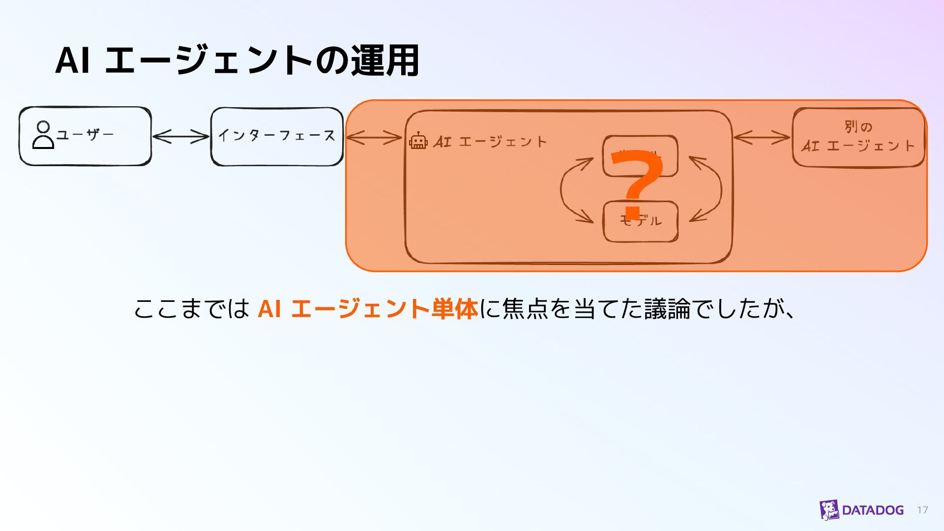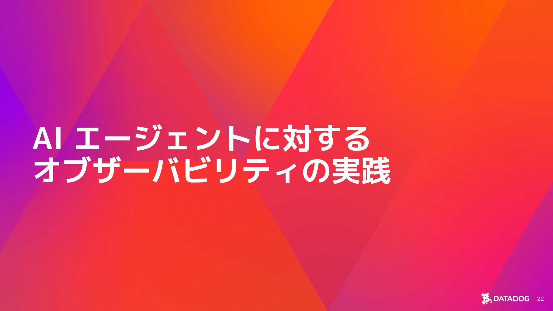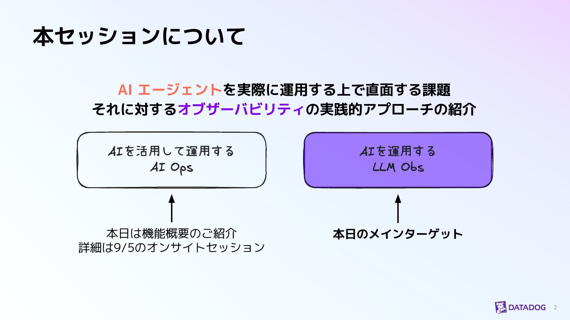 そこで本セッションでは、実際にAI エージェントをAIOpsの商用サービスとして提供すると共に、お客様が運用中のAI エージェントに対するオブザーバビリティを高めてきたDatadogの実績を踏まえ、AI エージェントに対するオブザーバビリティを高め、クラウドインフラからLLMの出力まで、AIスタック全体を可視化して深いインサイトを得るアプローチを解説します。