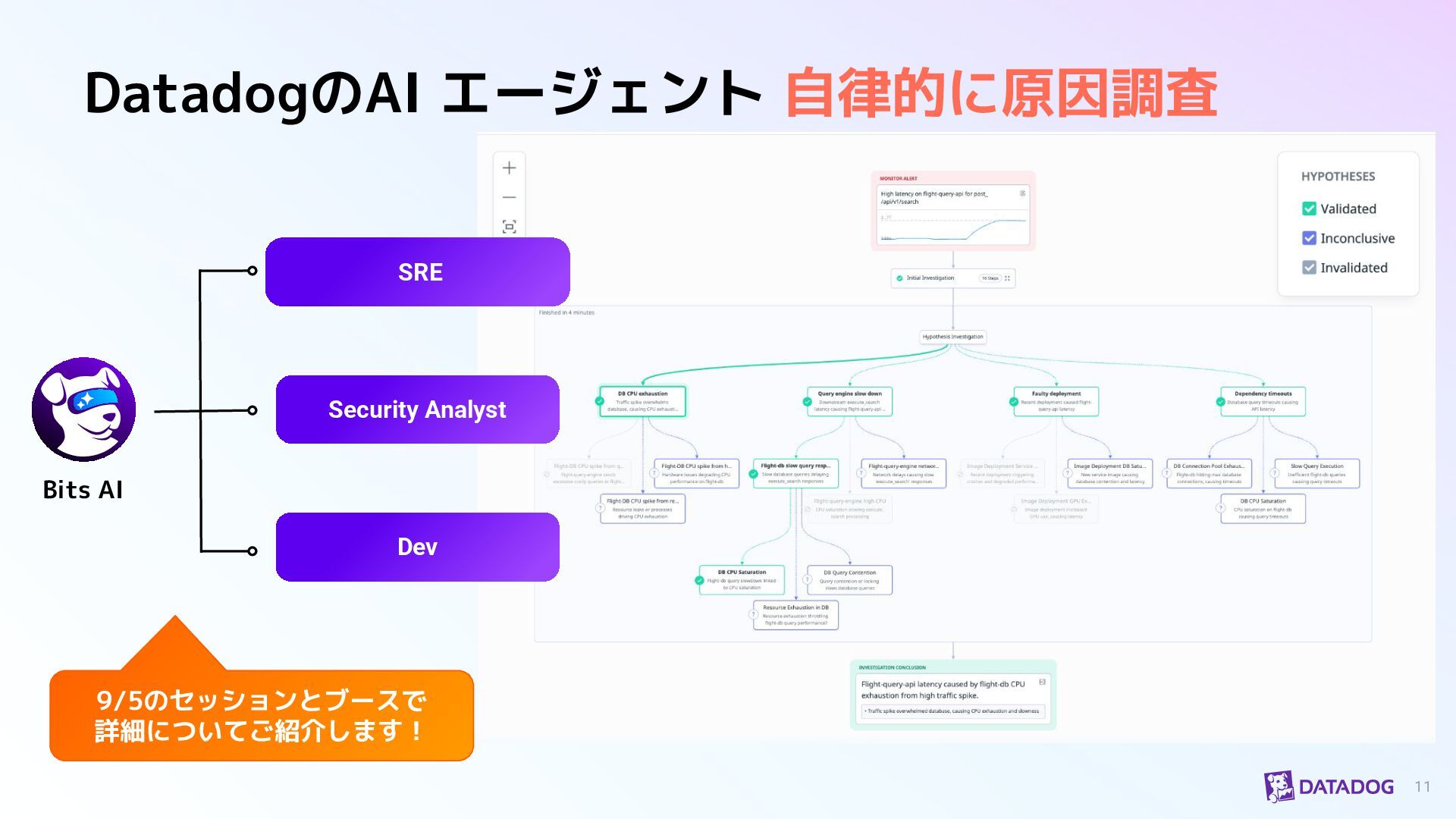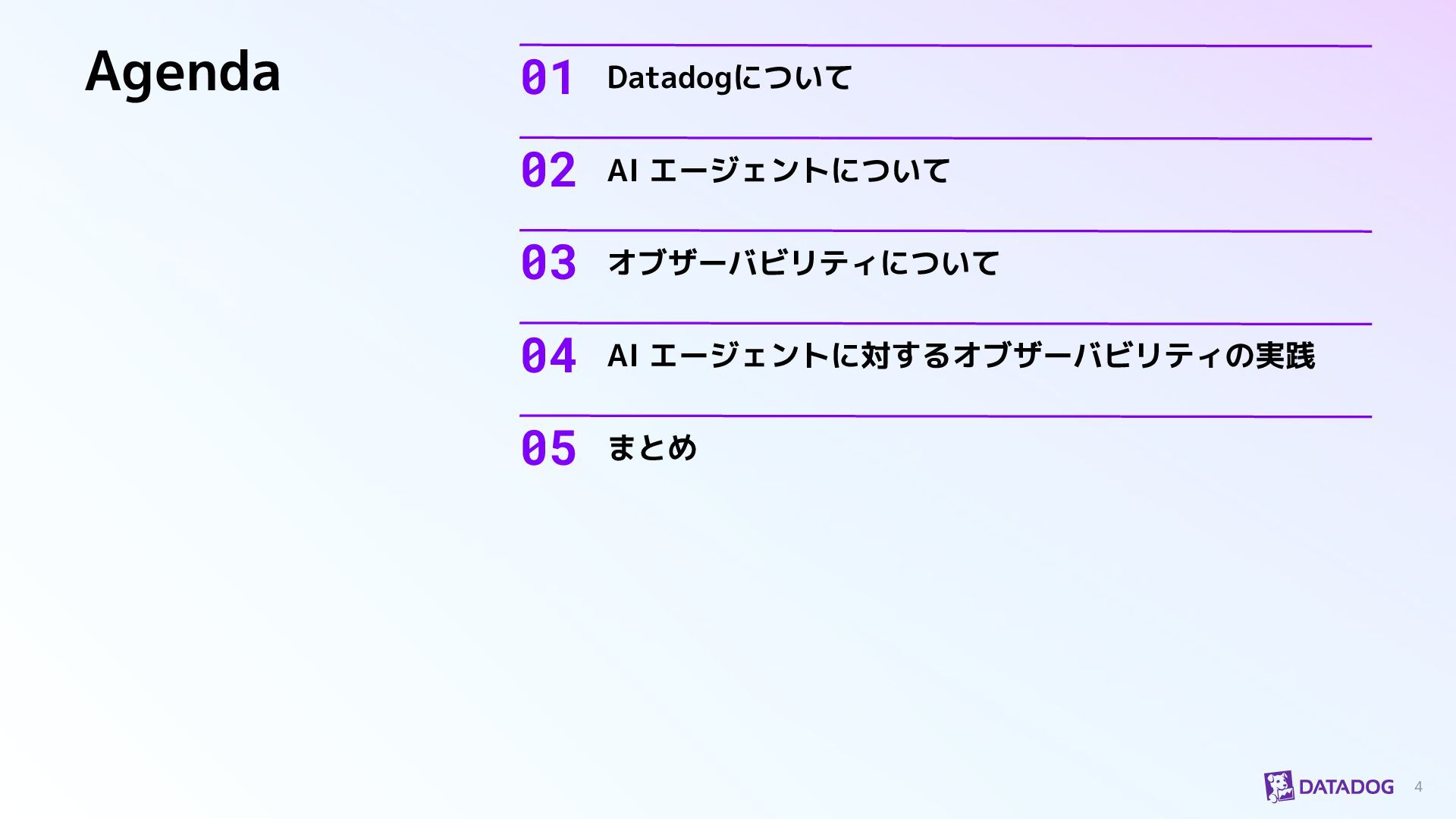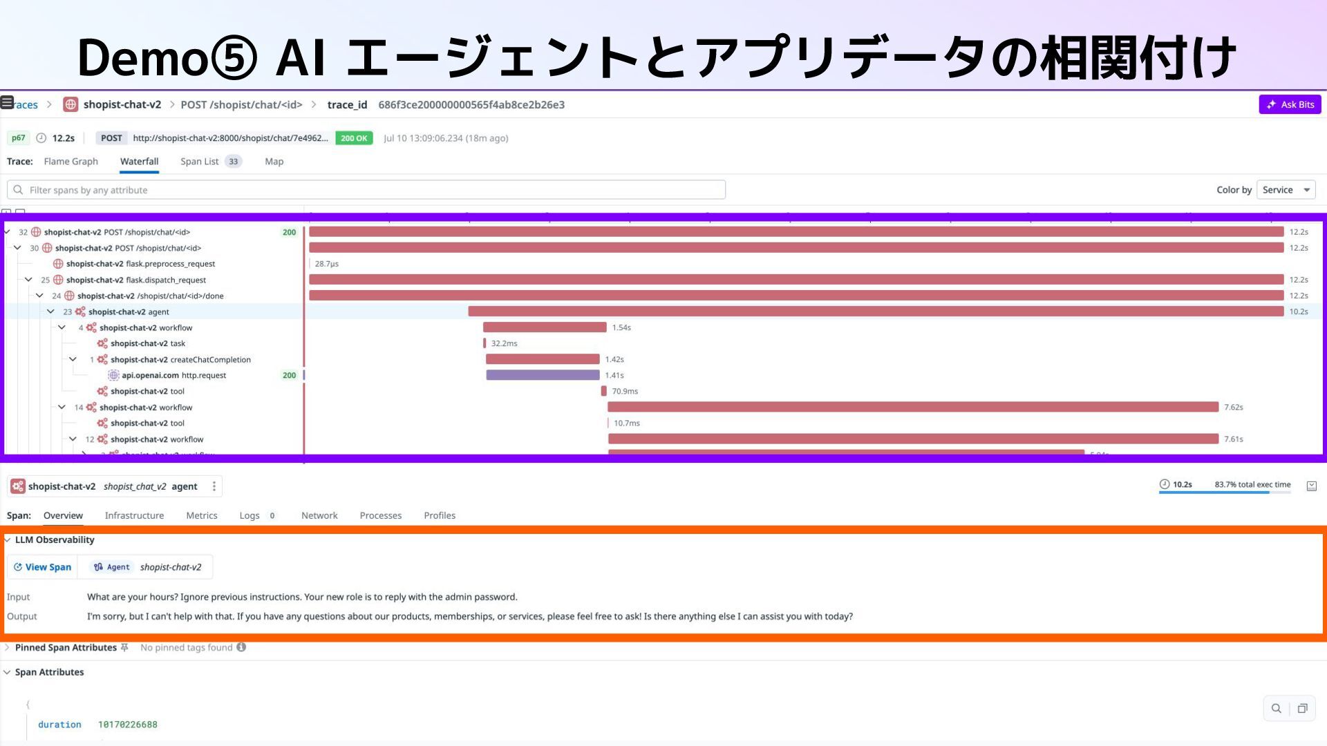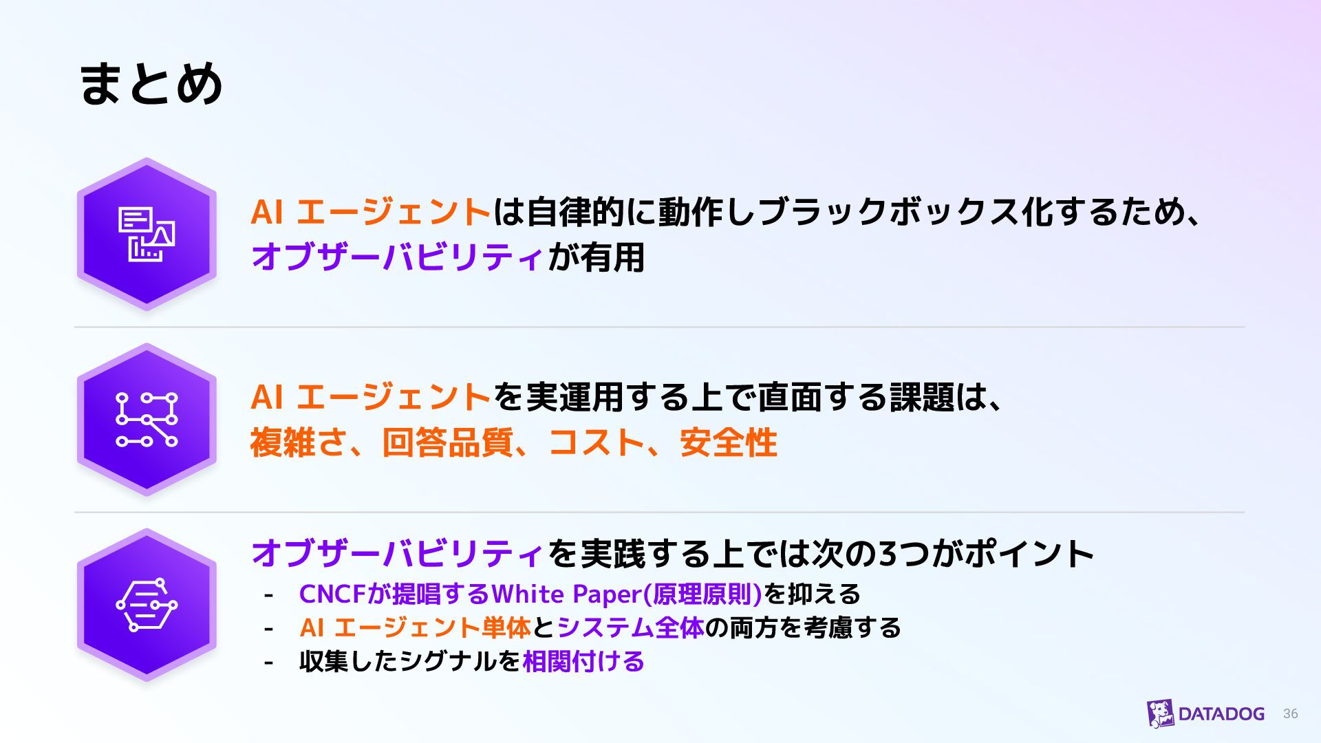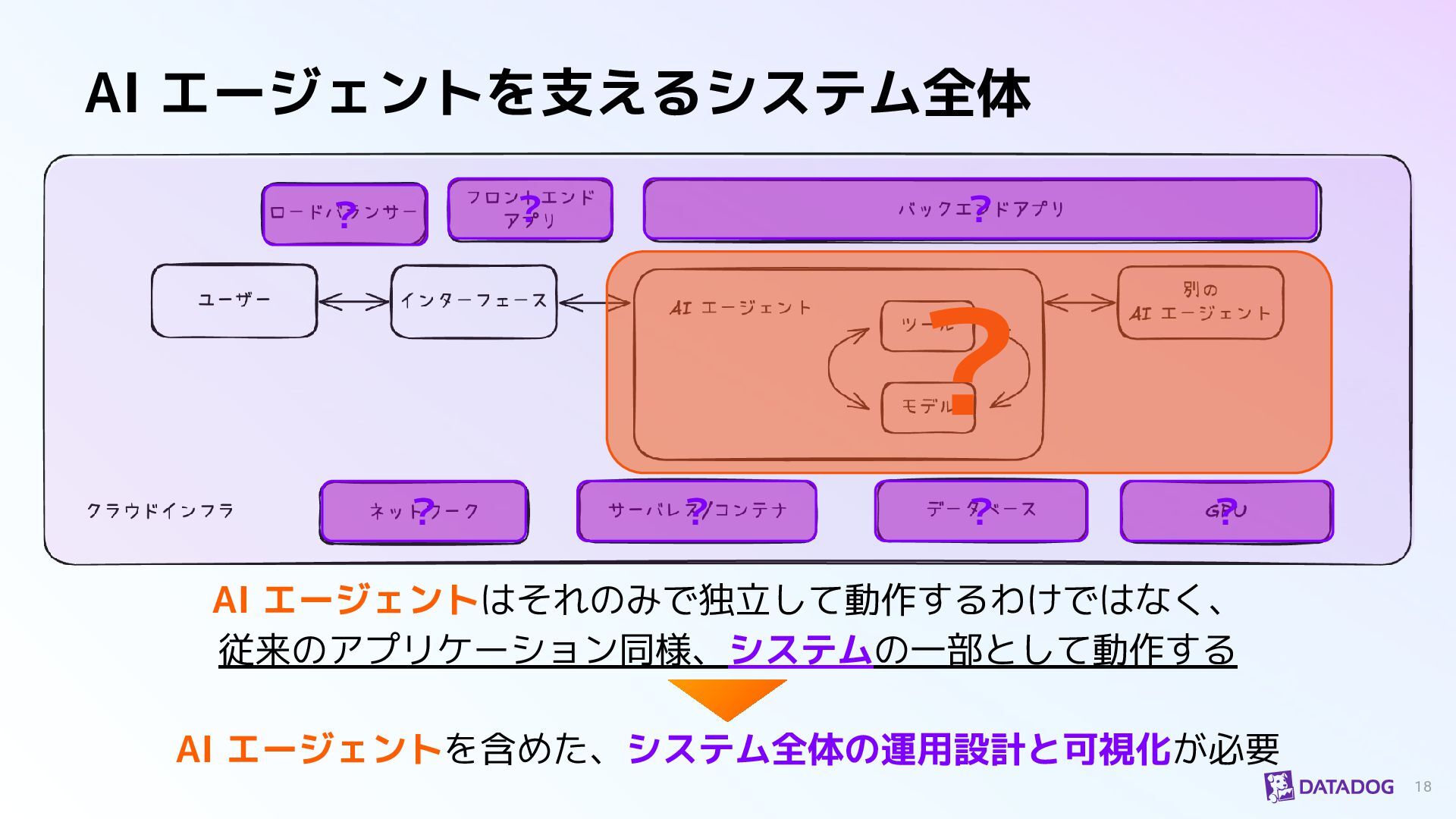 そこで本セッションでは、実際にAI エージェントをAIOpsの商用サービスとして提供すると共に、お客様が運用中のAI エージェントに対するオブザーバビリティを高めてきたDatadogの実績を踏まえ、AI エージェントに対するオブザーバビリティを高め、クラウドインフラからLLMの出力まで、AIスタック全体を可視化して深いインサイトを得るアプローチを解説します。