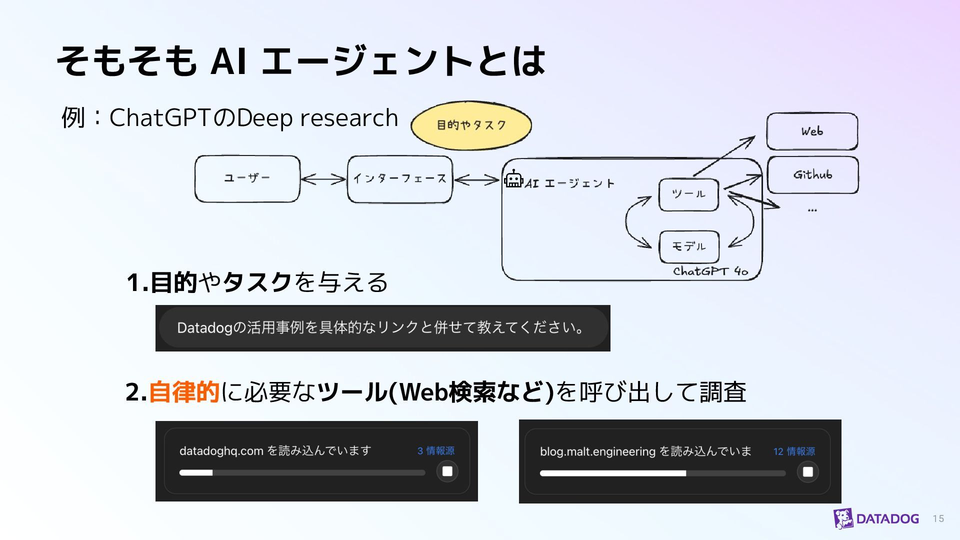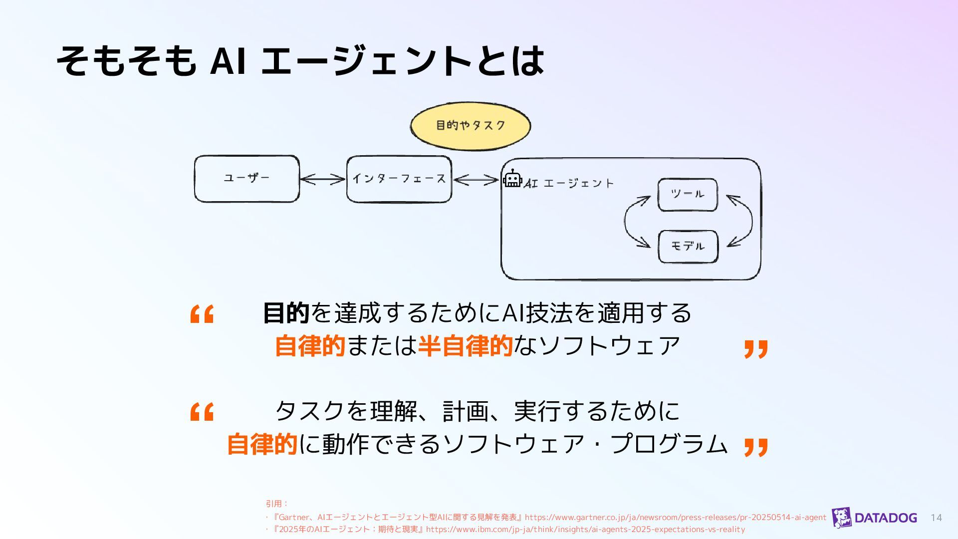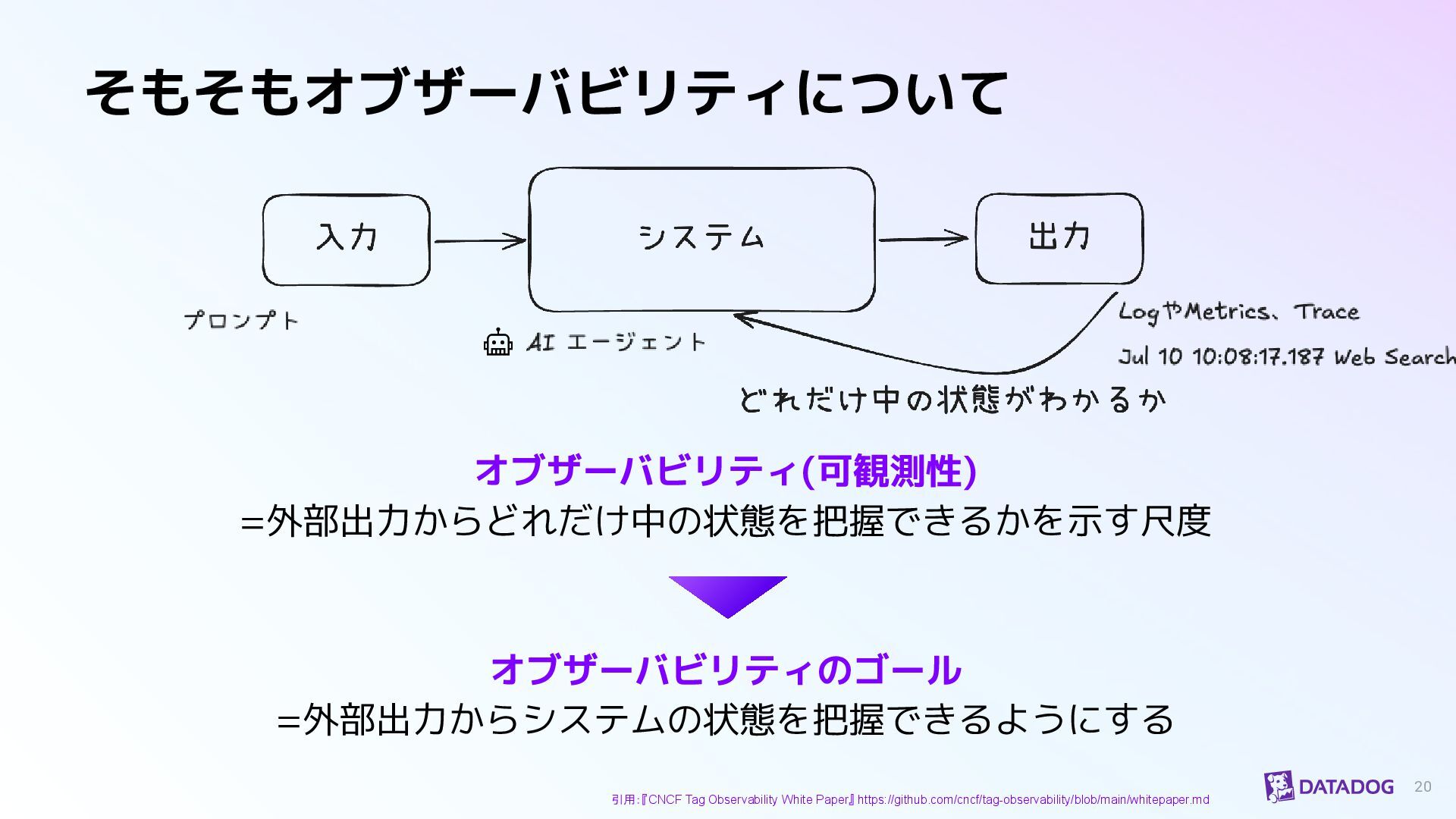 AI エージェントとは?オブザーバビリティとは?という概念の紹介から、AI エージェントを実運用する際のオブザーバビリティの実践について整理しています。