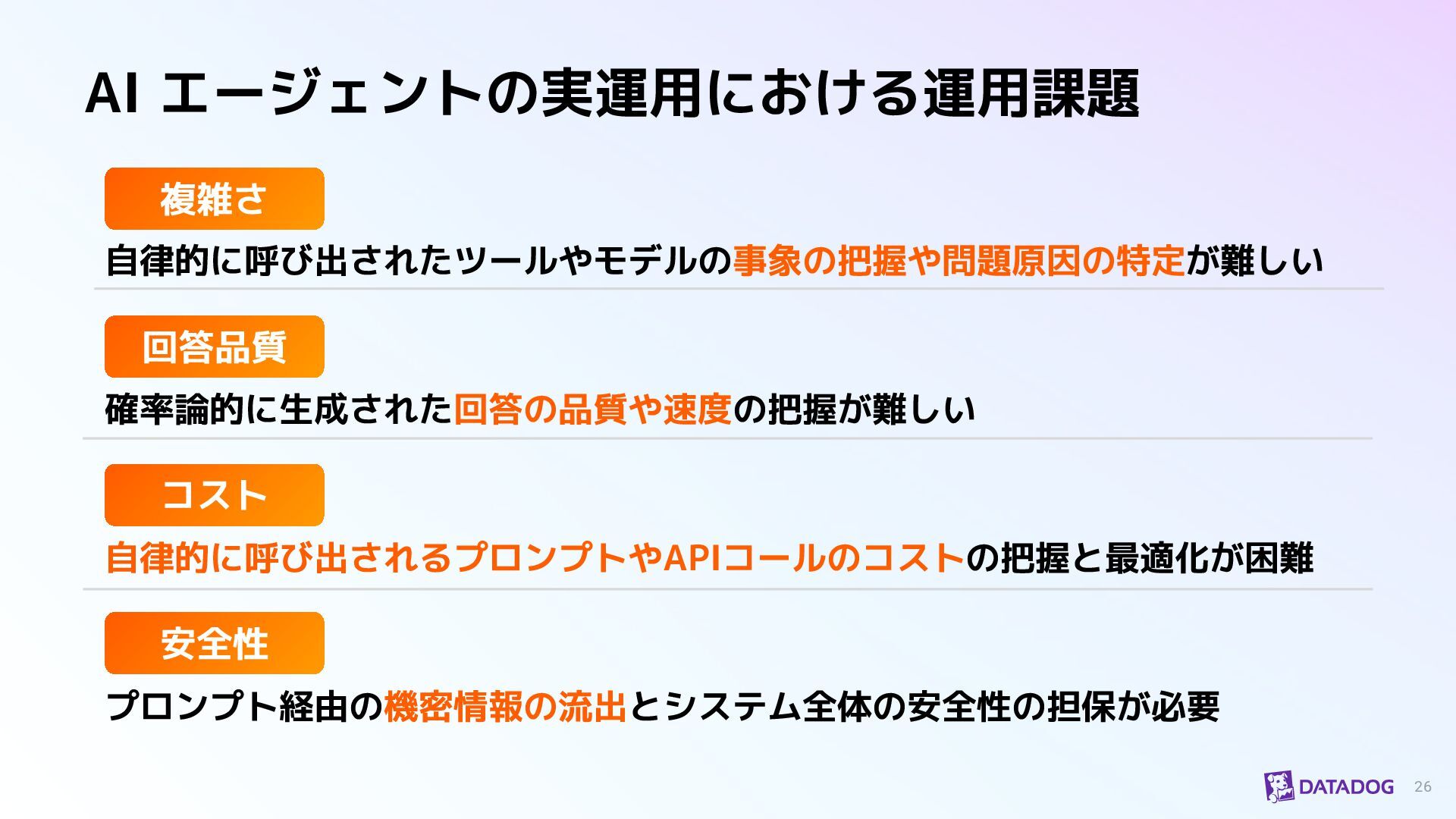 AI エージェントの複雑な構成やブラックボックス化された内部ロジックは監視やトラブルシュートを困難にし、結果としてパフォーマンスの低下やコストの増大、ユーザーの信頼性の低下といったリスクを引き起こしかねません。