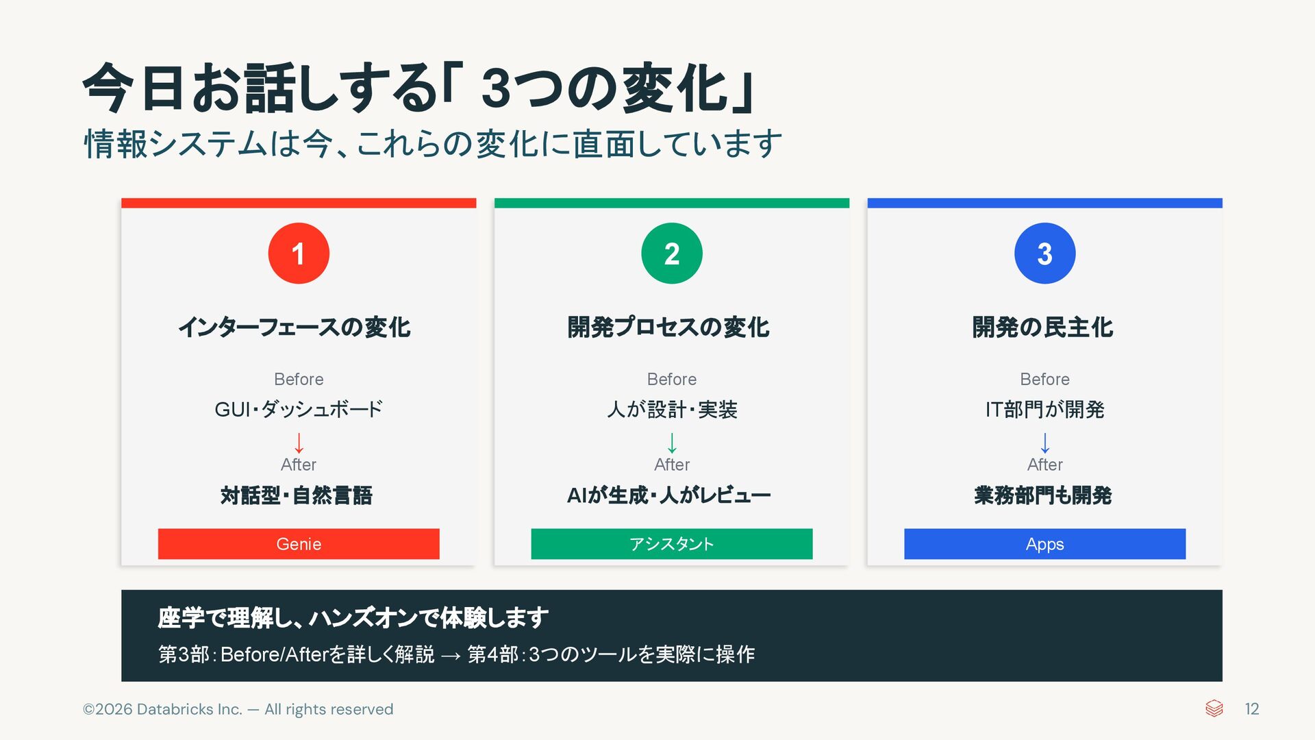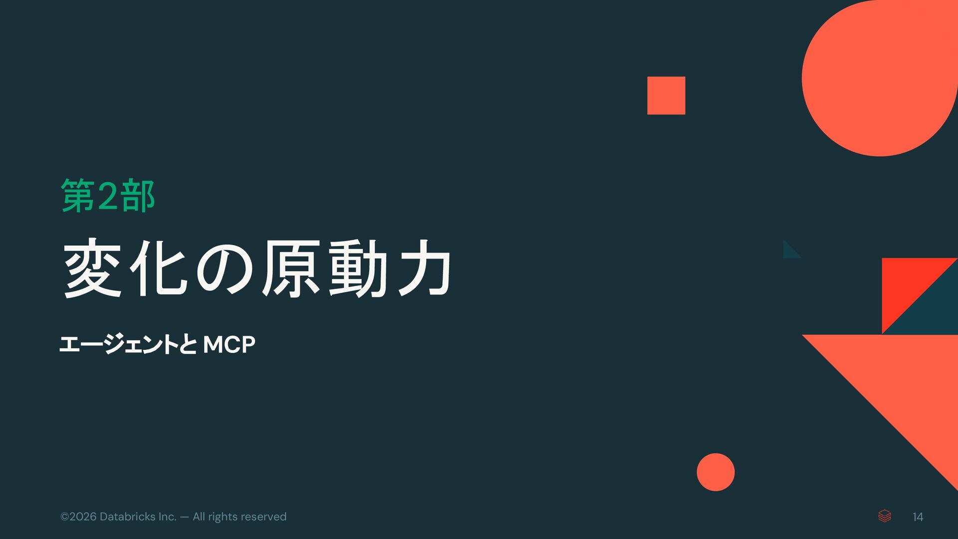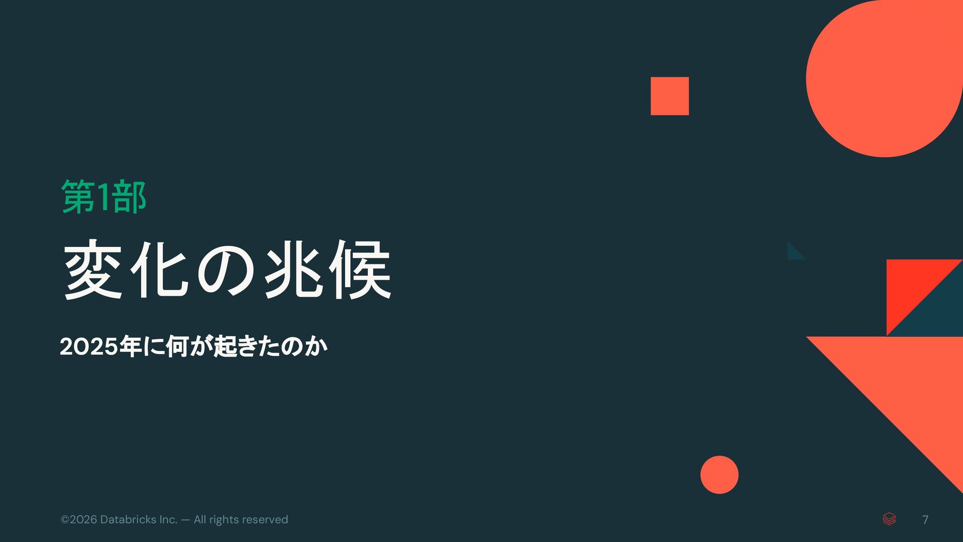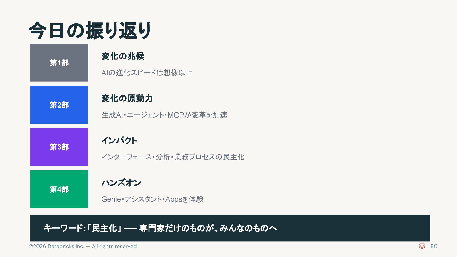変化の兆候 AIの進化スピードは想像以上 第2部 変化の原動力 生成AI・エージェント・MCPが変革を加速 第3部 インパクト インターフェース・分析・業務プロセスの民主化 第4部 ハンズオン Genie・アシスタント・Appsを体験 キーワード:「民主化」 ── 専門家だけのものが、みんなのものへ