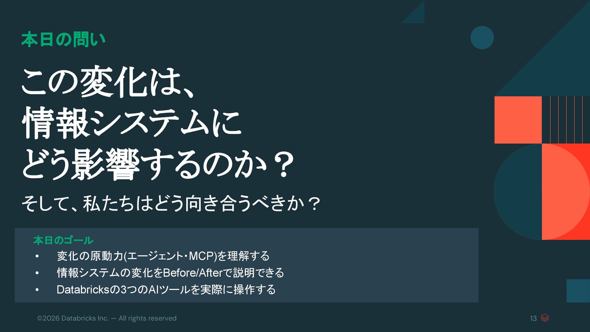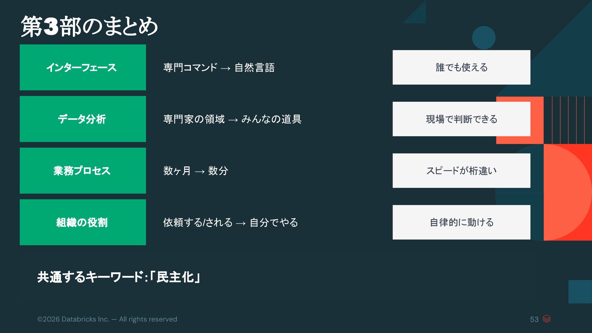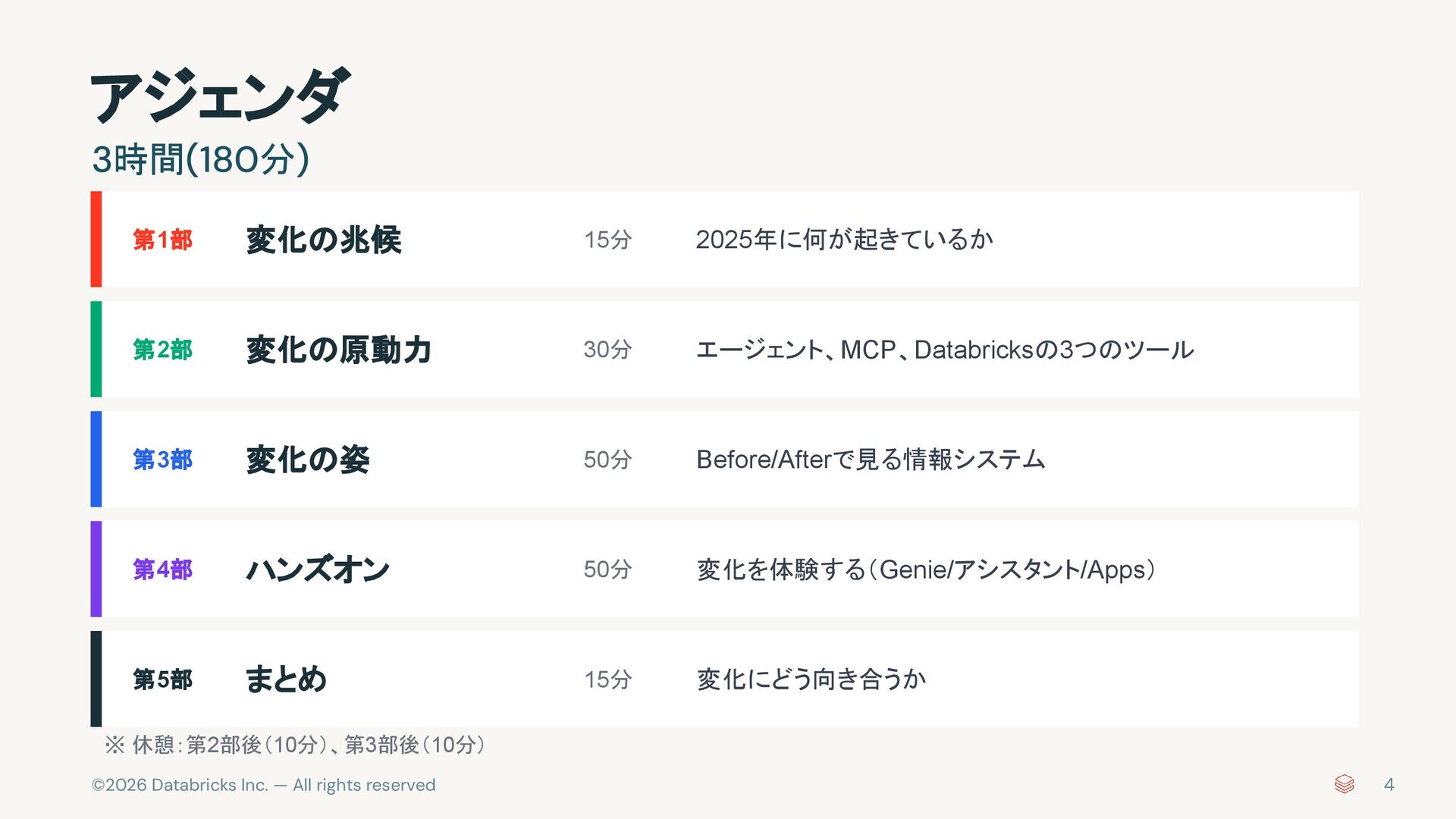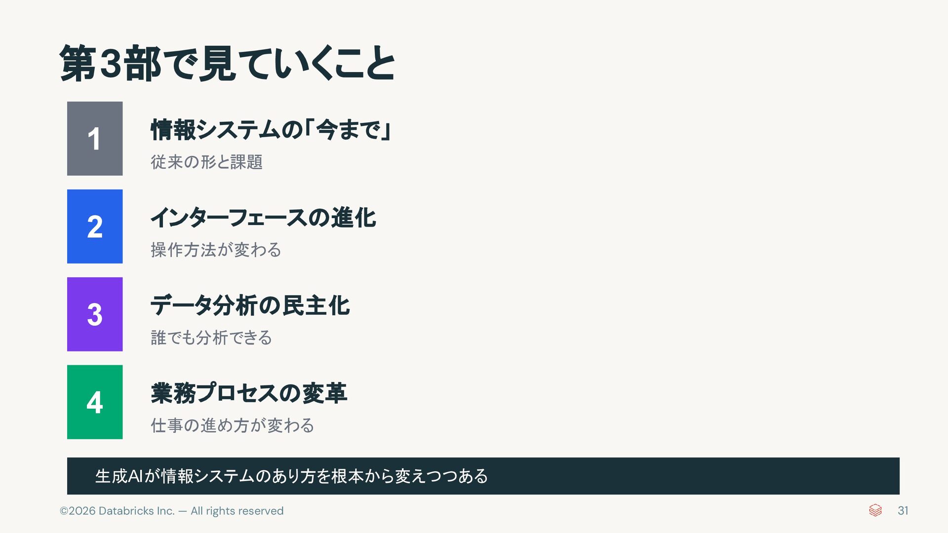 変化の兆候 AIの進化スピードは想像以上 第2部 変化の原動力 生成AI・エージェント・MCPが変革を加速 第3部 インパクト インターフェース・分析・業務プロセスの民主化 第4部 ハンズオン Genie・アシスタント・Appsを体験 キーワード:「民主化」 ── 専門家だけのものが、みんなのものへ