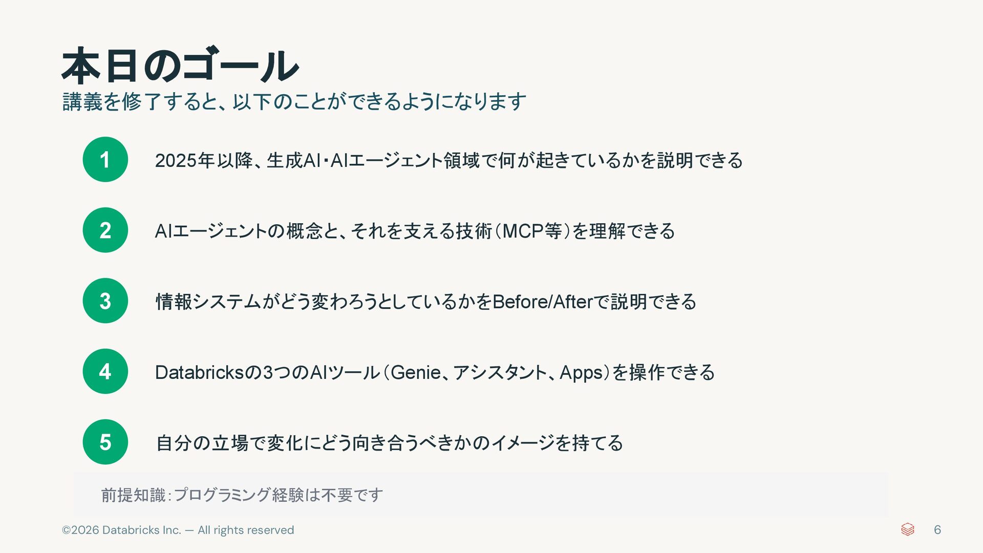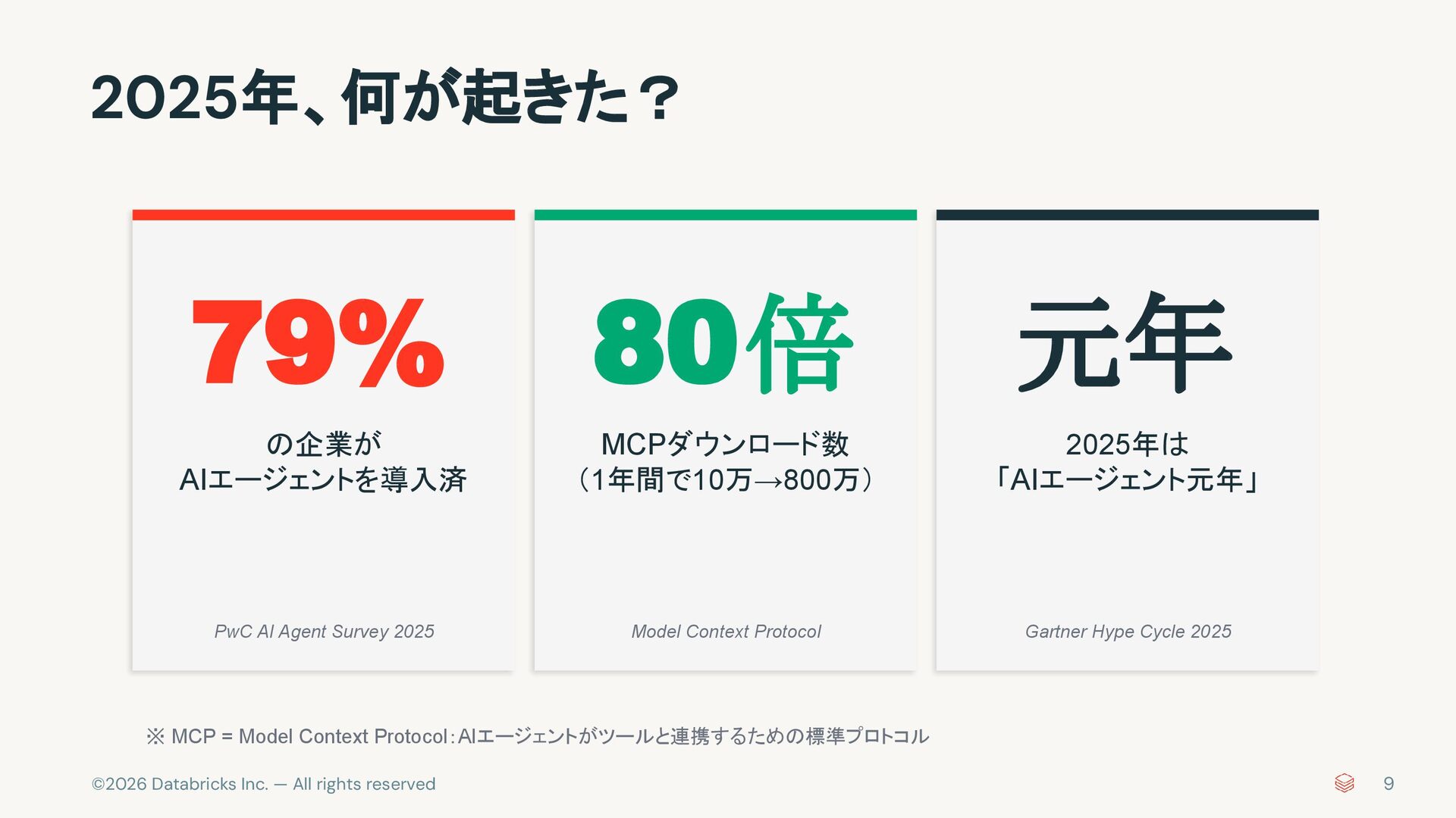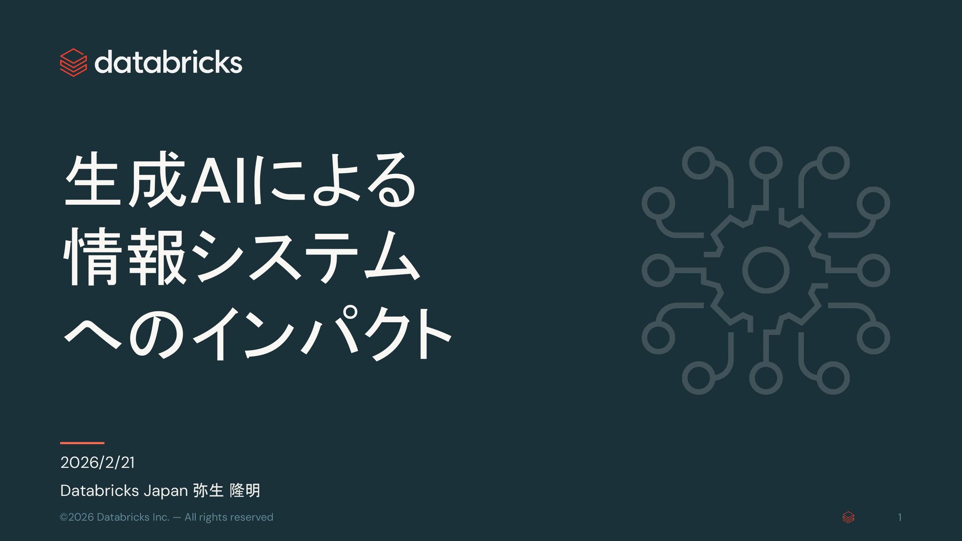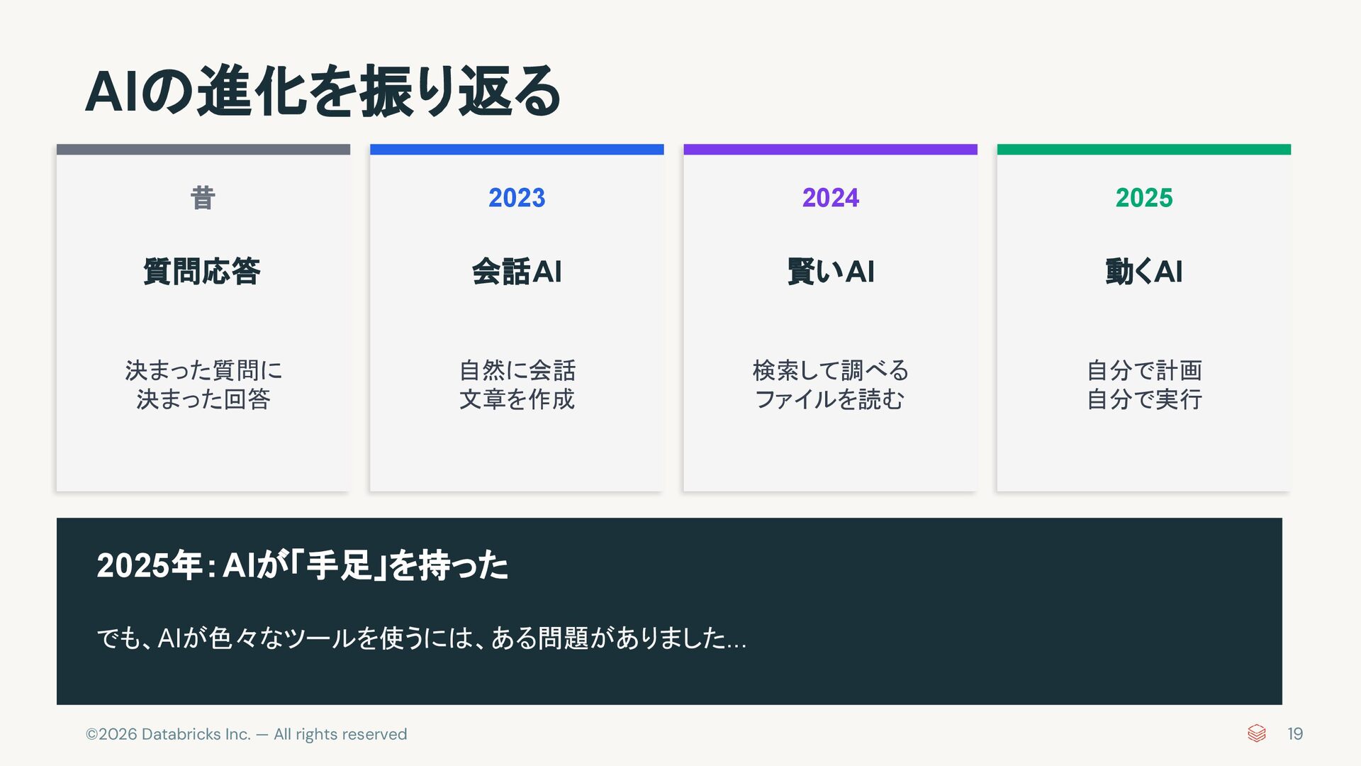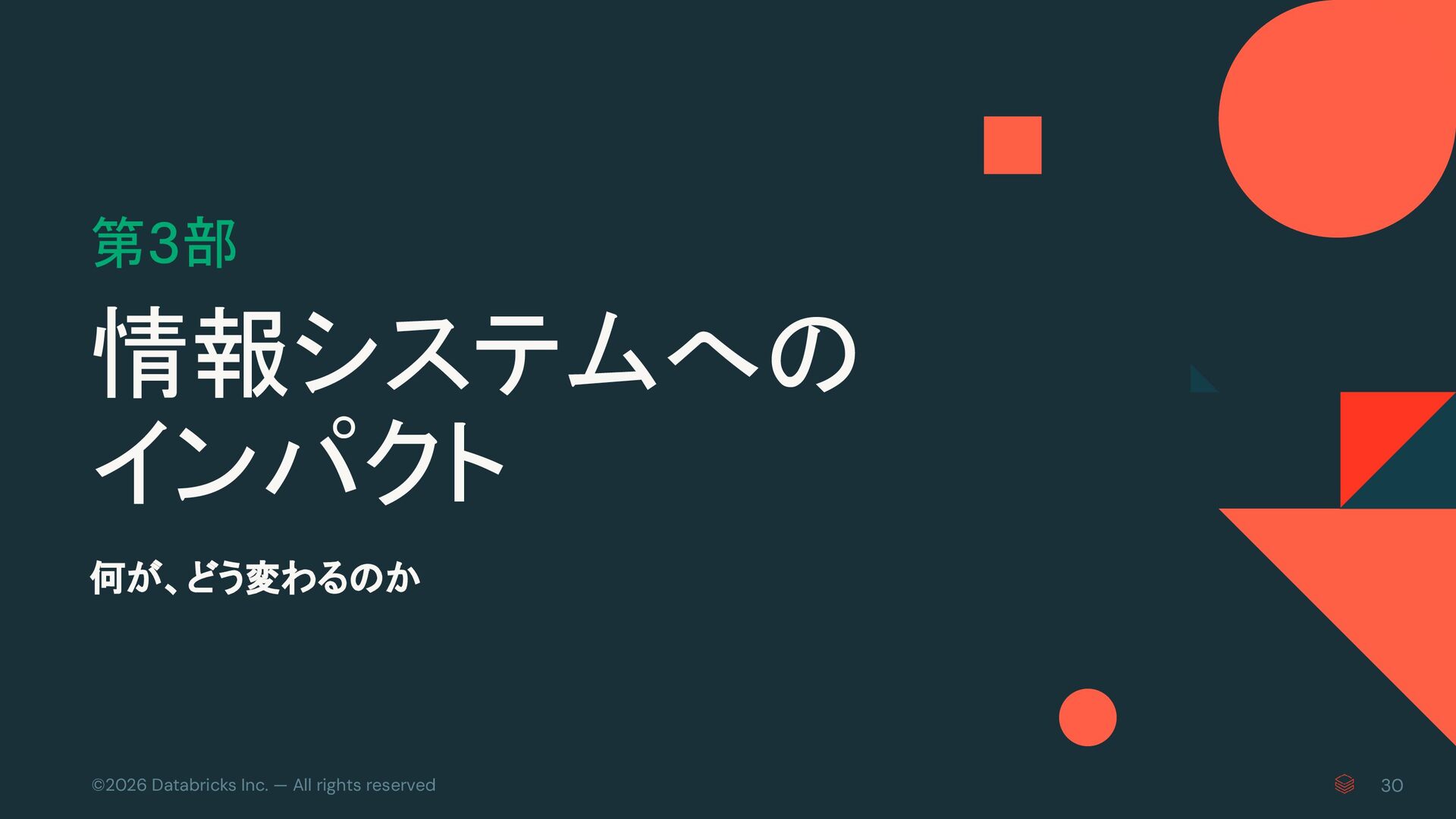 変化の兆候 AIの進化スピードは想像以上 第2部 変化の原動力 生成AI・エージェント・MCPが変革を加速 第3部 インパクト インターフェース・分析・業務プロセスの民主化 第4部 ハンズオン Genie・アシスタント・Appsを体験 キーワード:「民主化」 ── 専門家だけのものが、みんなのものへ