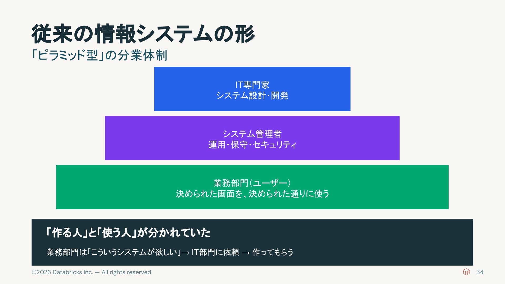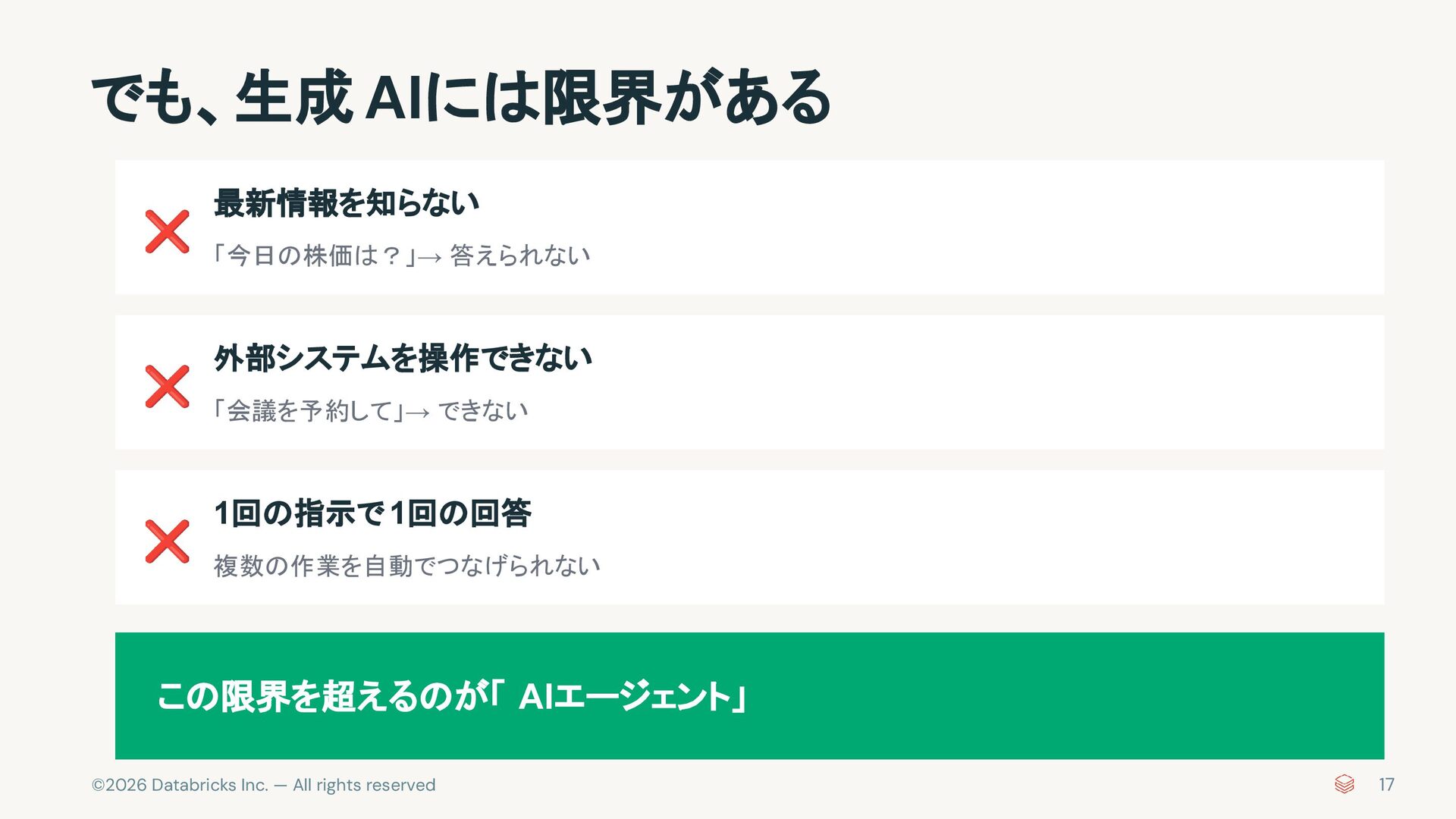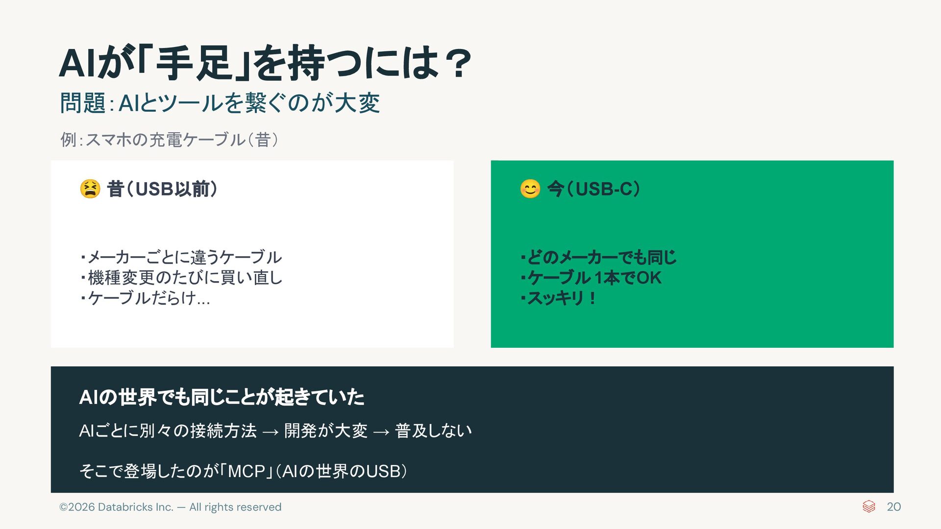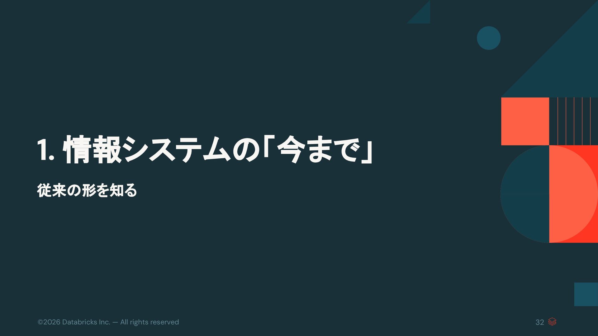 変化の兆候 AIの進化スピードは想像以上 第2部 変化の原動力 生成AI・エージェント・MCPが変革を加速 第3部 インパクト インターフェース・分析・業務プロセスの民主化 第4部 ハンズオン Genie・アシスタント・Appsを体験 キーワード:「民主化」 ── 専門家だけのものが、みんなのものへ