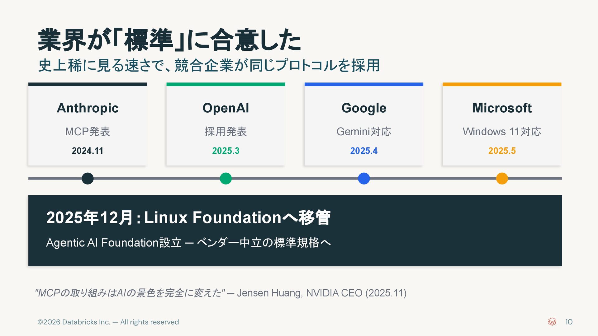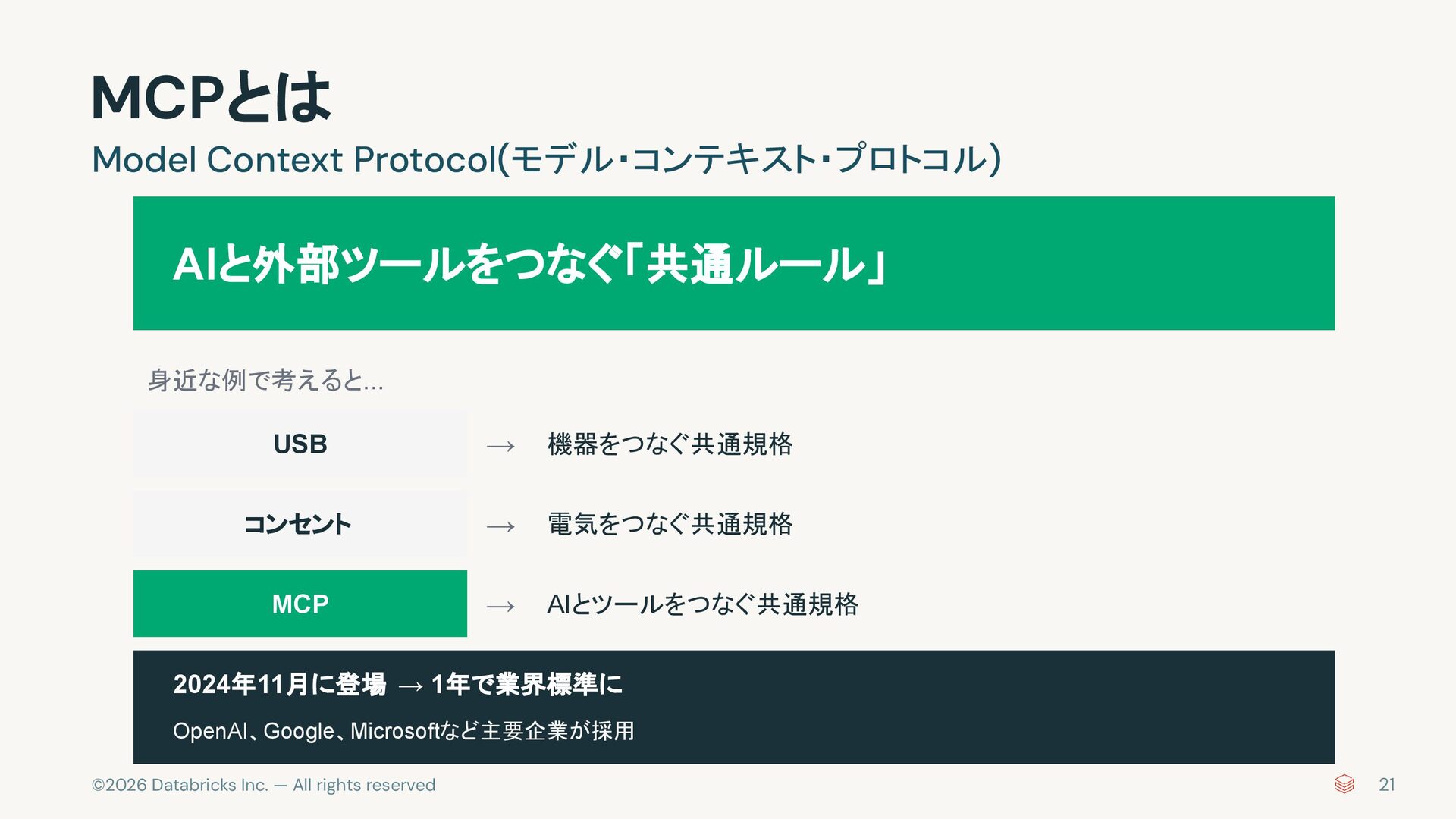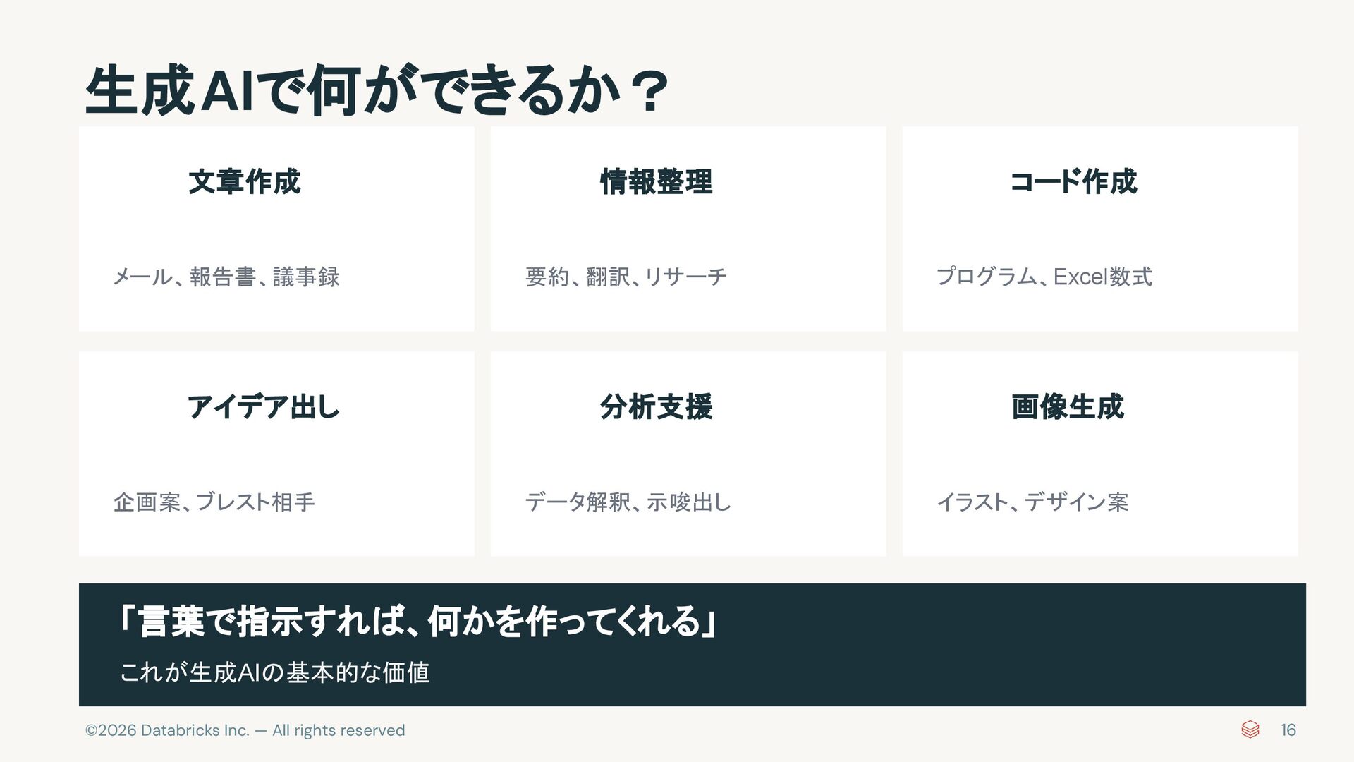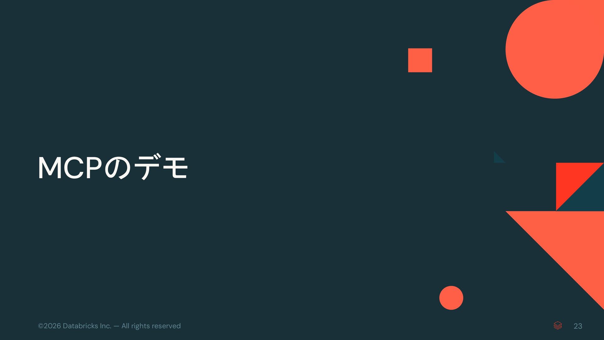 変化の兆候 AIの進化スピードは想像以上 第2部 変化の原動力 生成AI・エージェント・MCPが変革を加速 第3部 インパクト インターフェース・分析・業務プロセスの民主化 第4部 ハンズオン Genie・アシスタント・Appsを体験 キーワード:「民主化」 ── 専門家だけのものが、みんなのものへ