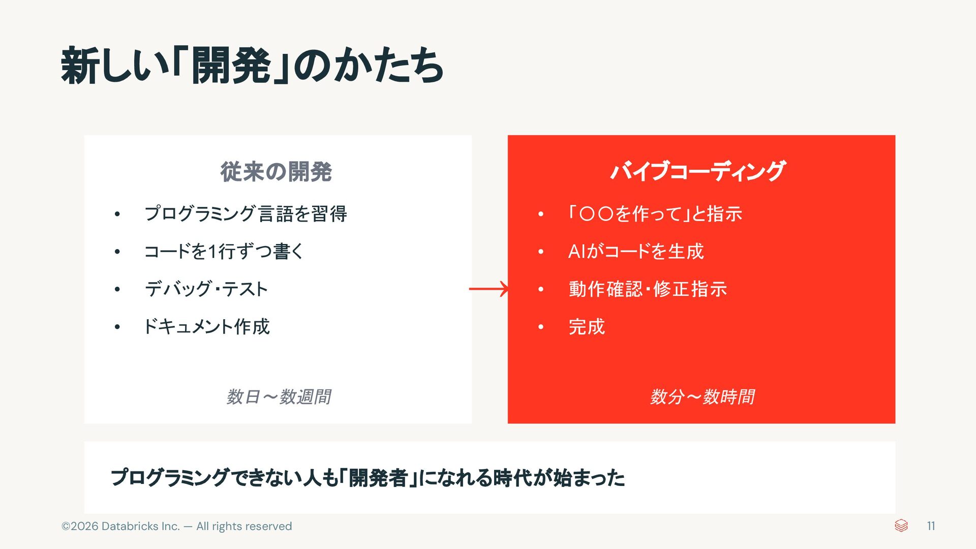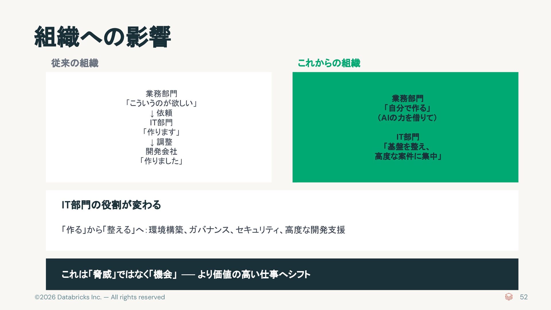 ©2026 Databricks Inc. — All rights reserved 開発の民主化 51 「専門家だけが作れる」から「誰でも作れる」へ