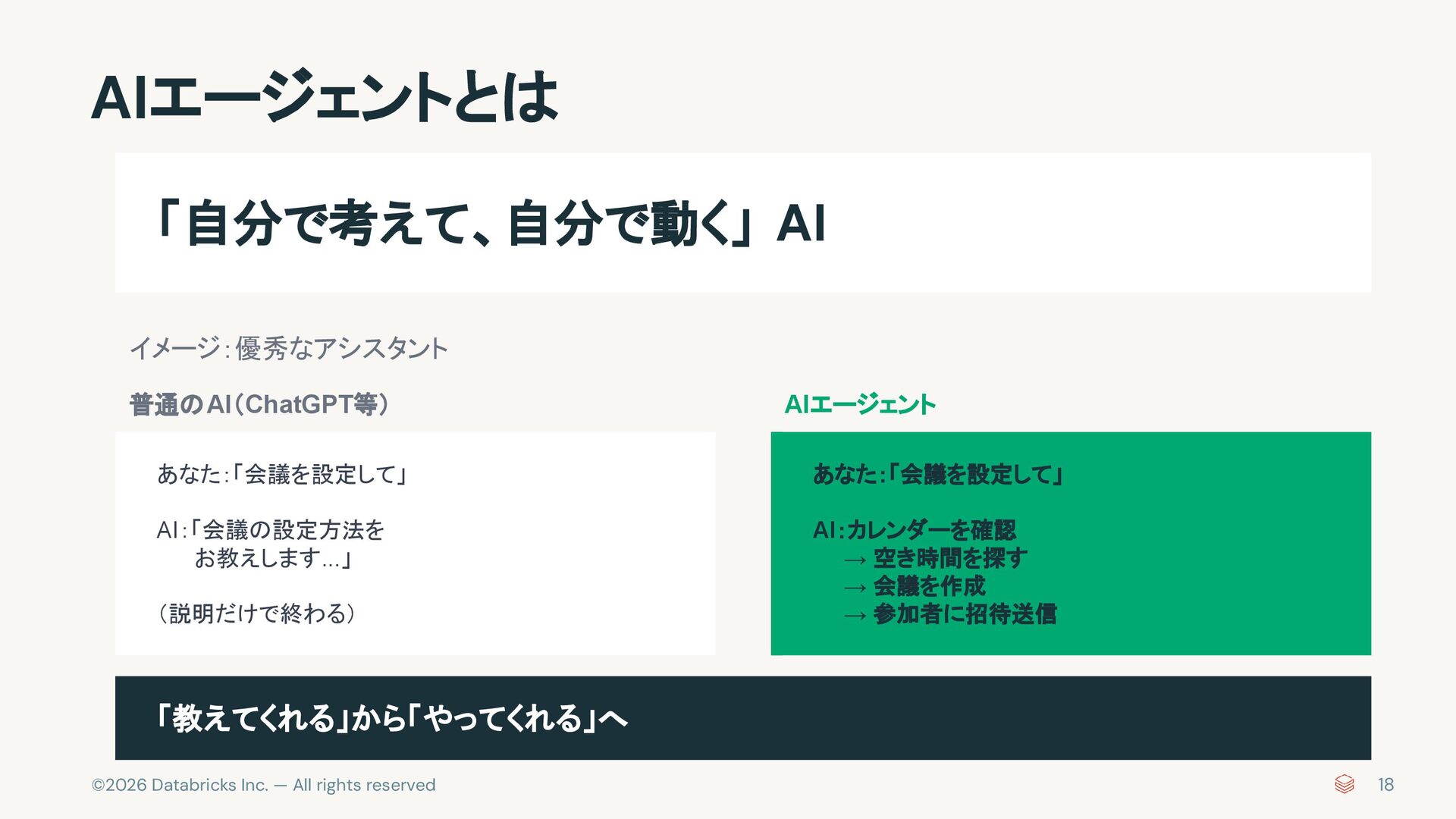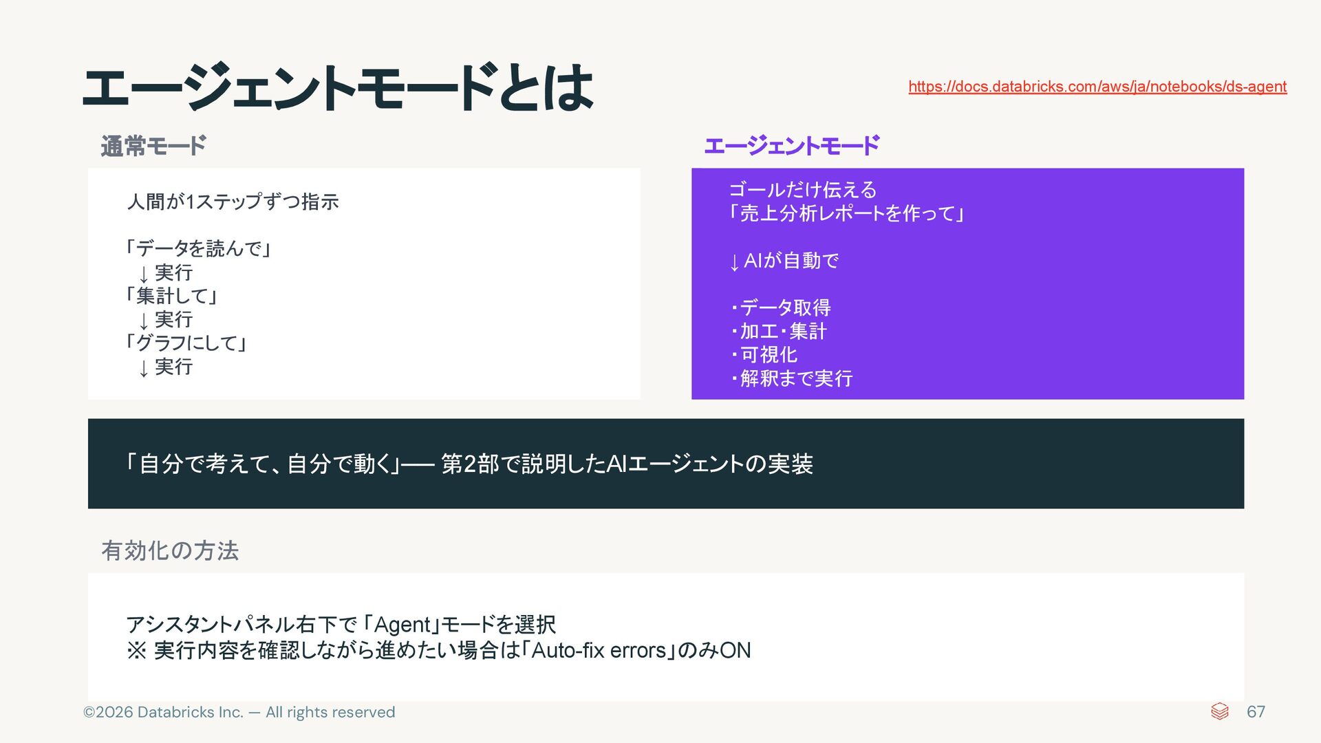 人間が1ステップずつ指示 「データを読んで」 ↓ 実行 「集計して」 ↓ 実行 「グラフにして」 ↓ 実行 エージェントモード ゴールだけ伝える 「売上分析レポートを作って」 ↓ AIが自動で ・データ取得 ・加工・集計 ・可視化 ・解釈まで実行 「自分で考えて、自分で動く」── 第2部で説明したAIエージェントの実装 有効化の方法 アシスタントパネル右下で 「Agent」モードを選択 ※ 実行内容を確認しながら進めたい場合は「Auto-fix errors」のみON https://docs.databricks.com/aws/ja/notebooks/ds-agent