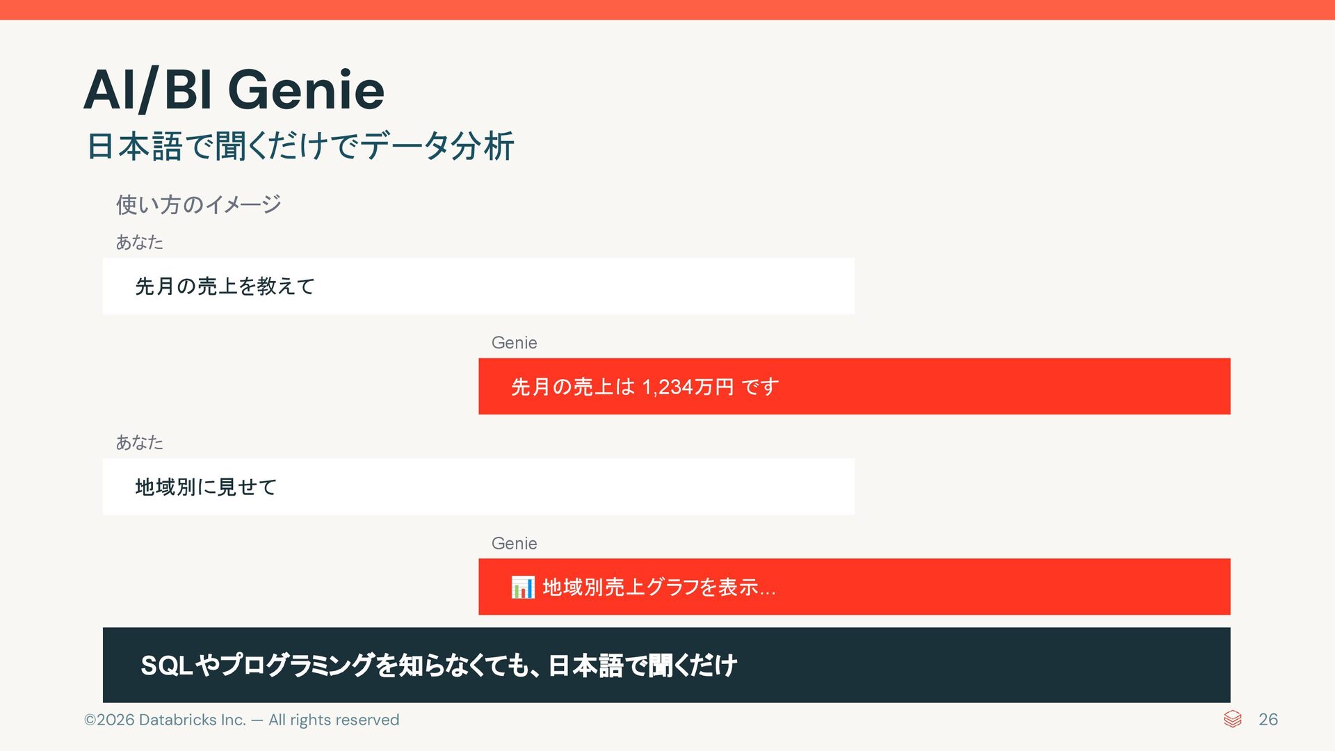 データ分析をしたい ↓ SQLを覚える Excelの関数を覚える 専門ツールの使い方を覚える これから データ分析をしたい ↓ 「先月の売上を 地域別に見せて」 これが意味すること ・学習コストが劇的に下がる(覚えることがほぼない) ・「できる人」の定義が変わる(専門知識 → 何をしたいかの明確さ) ・業務部門が自分で分析できるようになる Databricks Genieは、この「自然言語インターフェース」を実現している