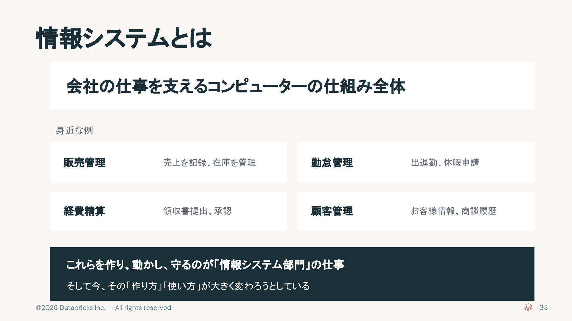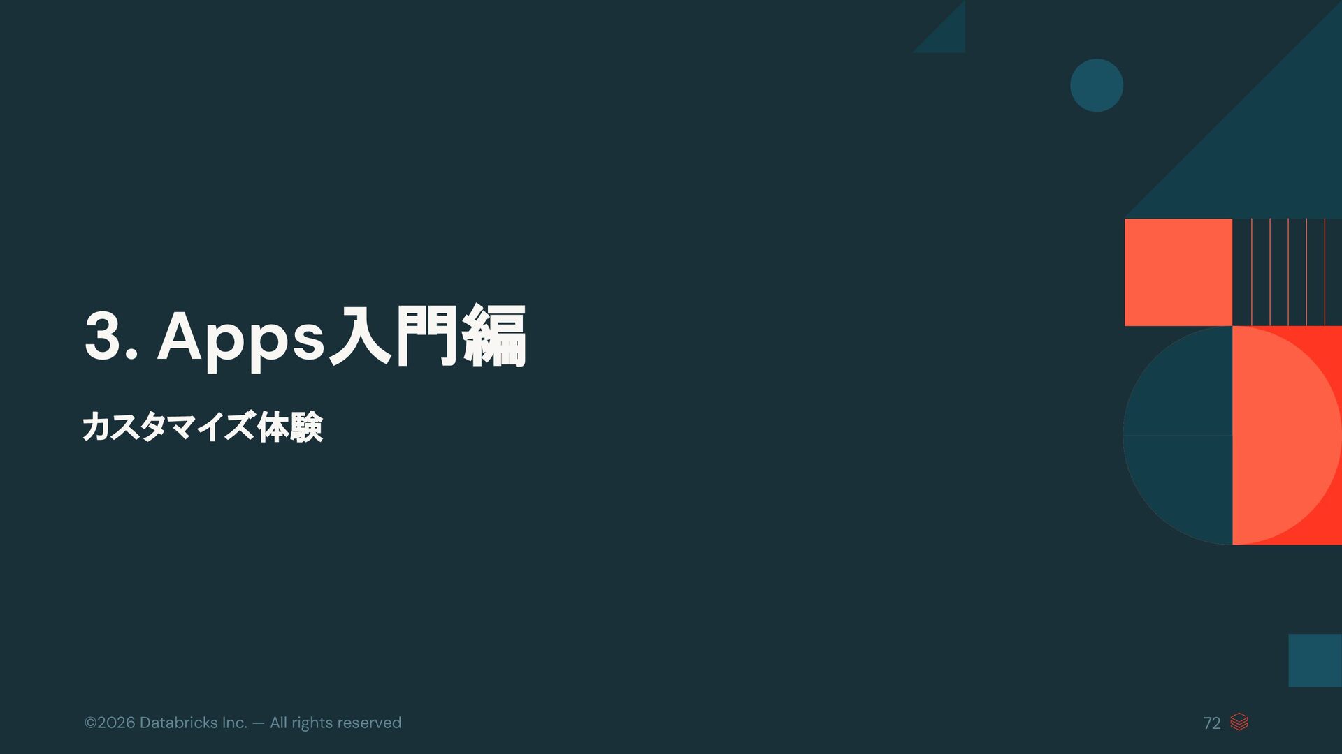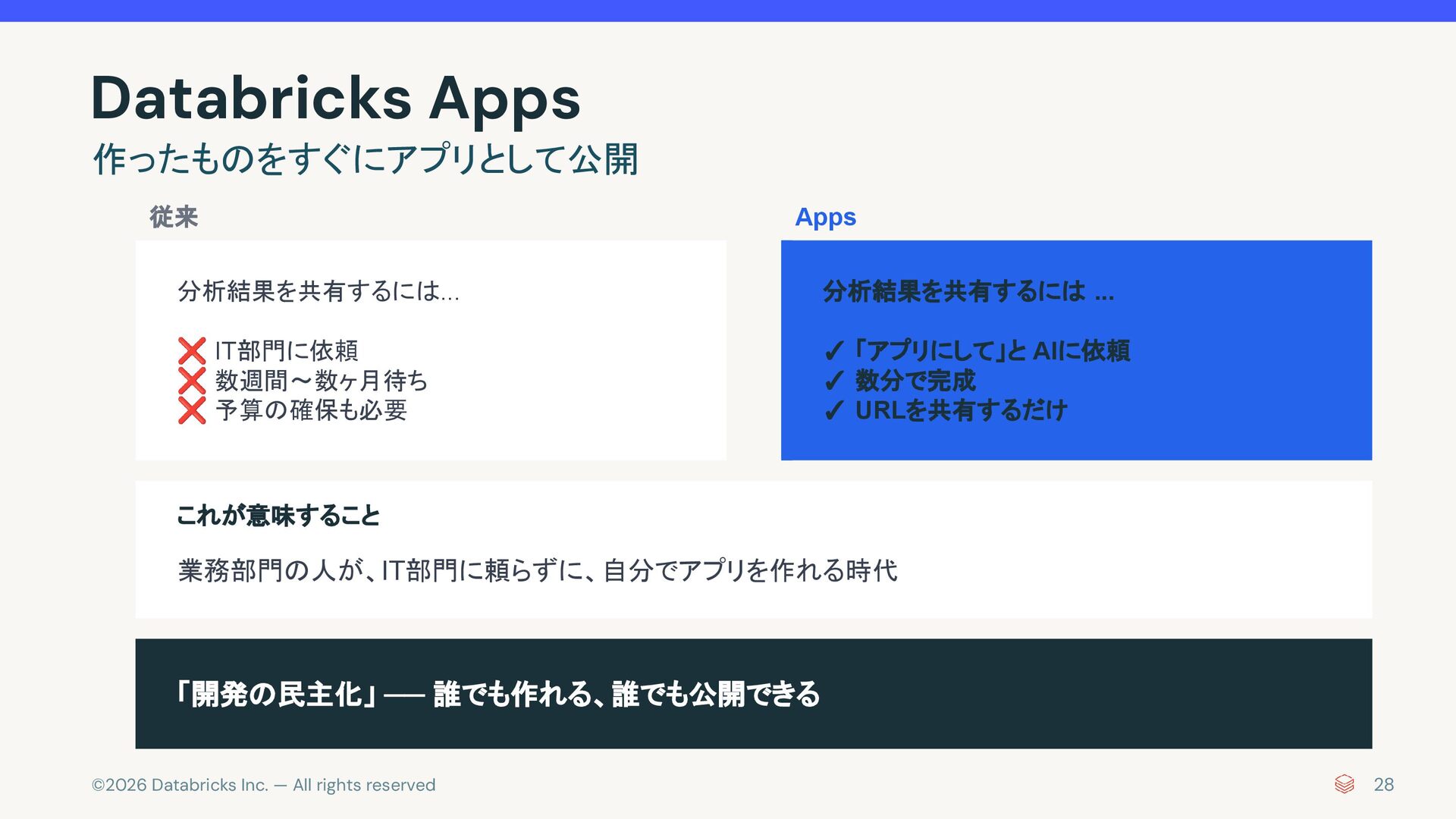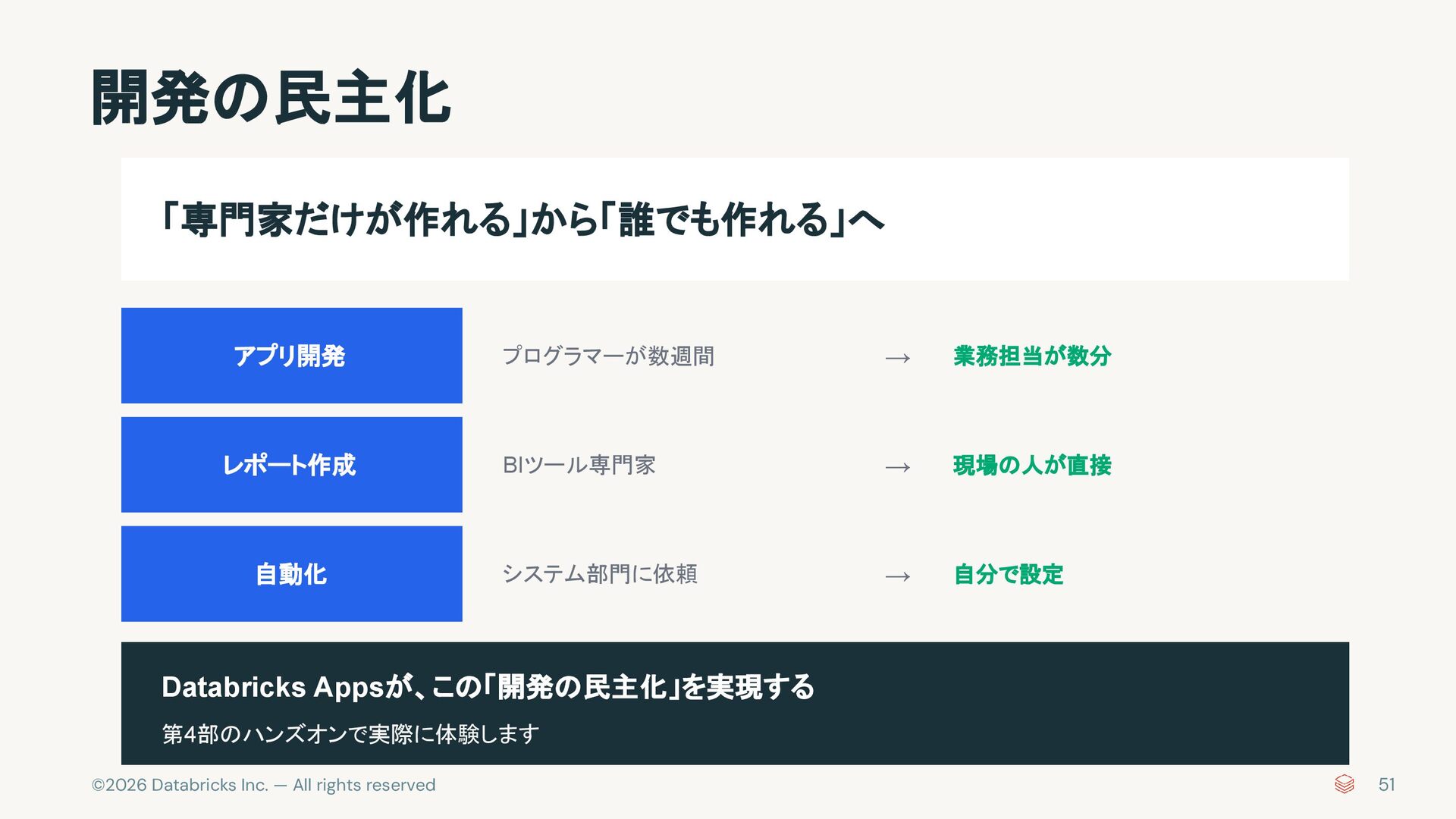 アプリ開発 プログラマーが数週間 → 業務担当が数分 レポート作成 BIツール専門家 → 現場の人が直接 自動化 システム部門に依頼 → 自分で設定 Databricks Appsが、この「開発の民主化」を実現する 第4部のハンズオンで実際に体験します