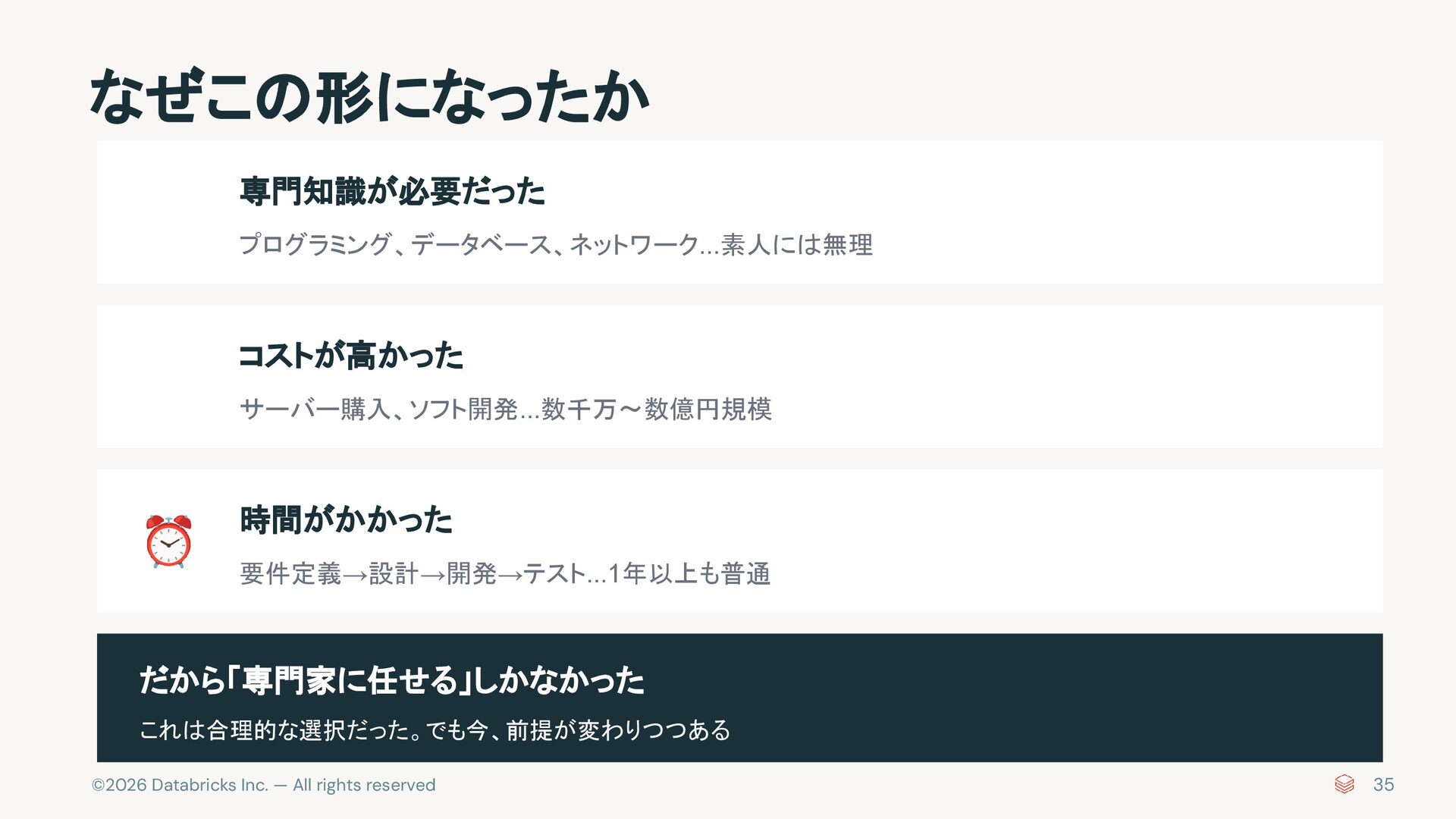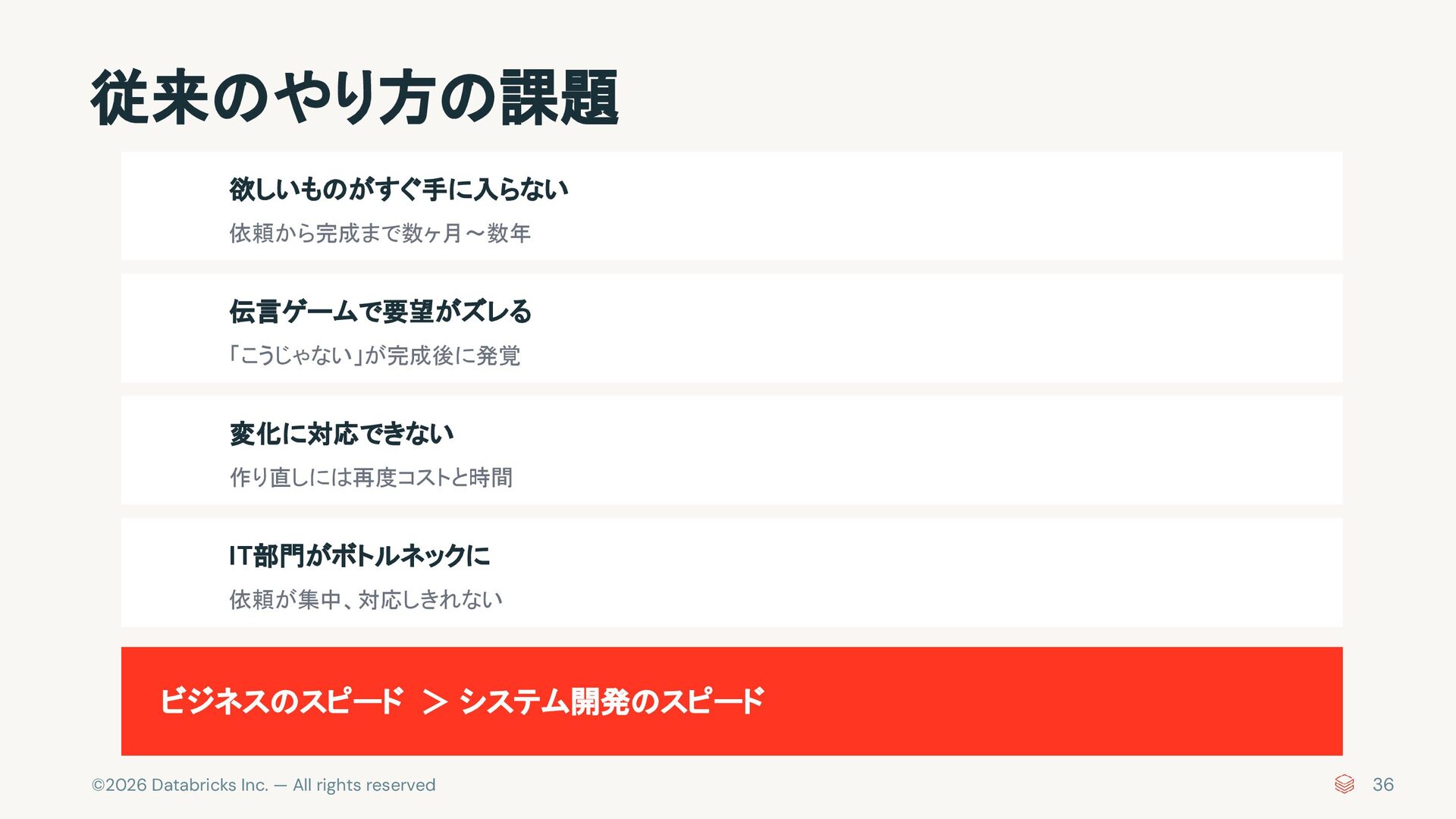 ©2026 Databricks Inc. — All rights reserved 従来のやり方の課題 36 欲しいものがすぐ手に入らない