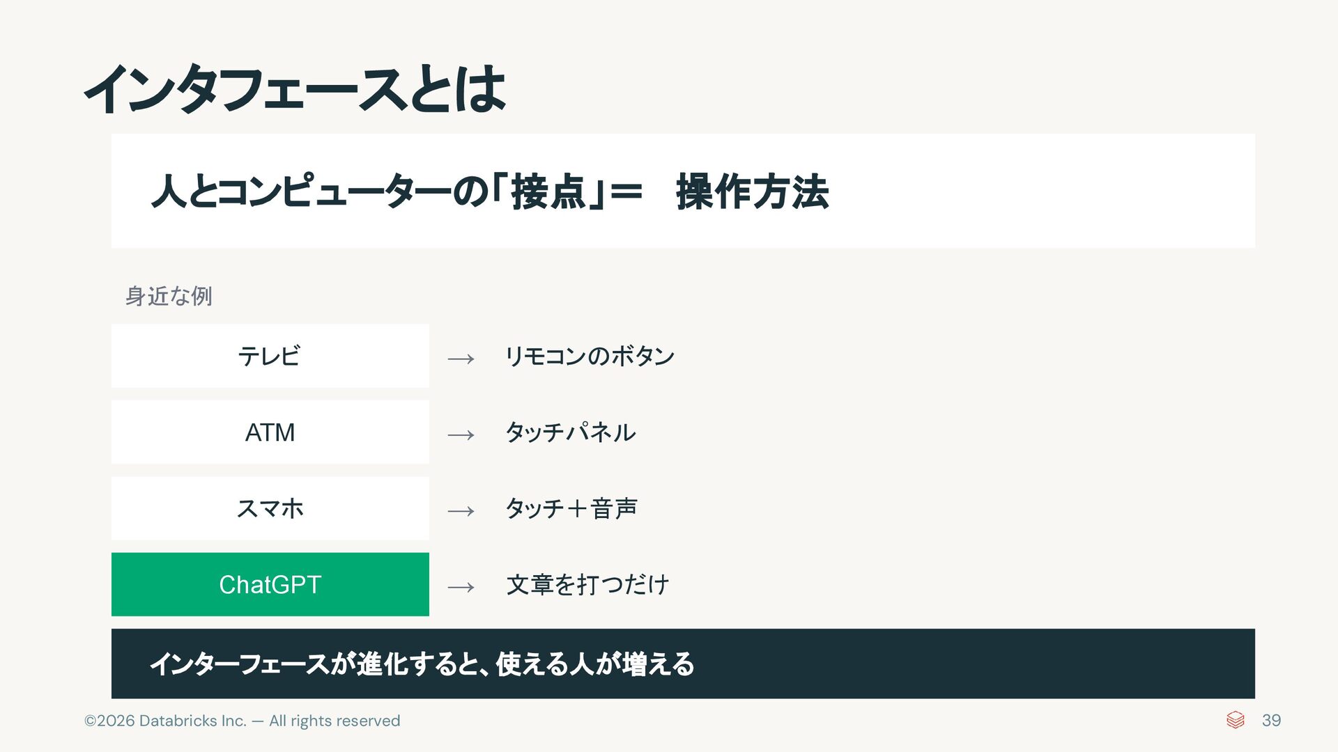 ©2026 Databricks Inc. — All rights reserved インタフェースとは 39 人とコンピューターの「接点」=