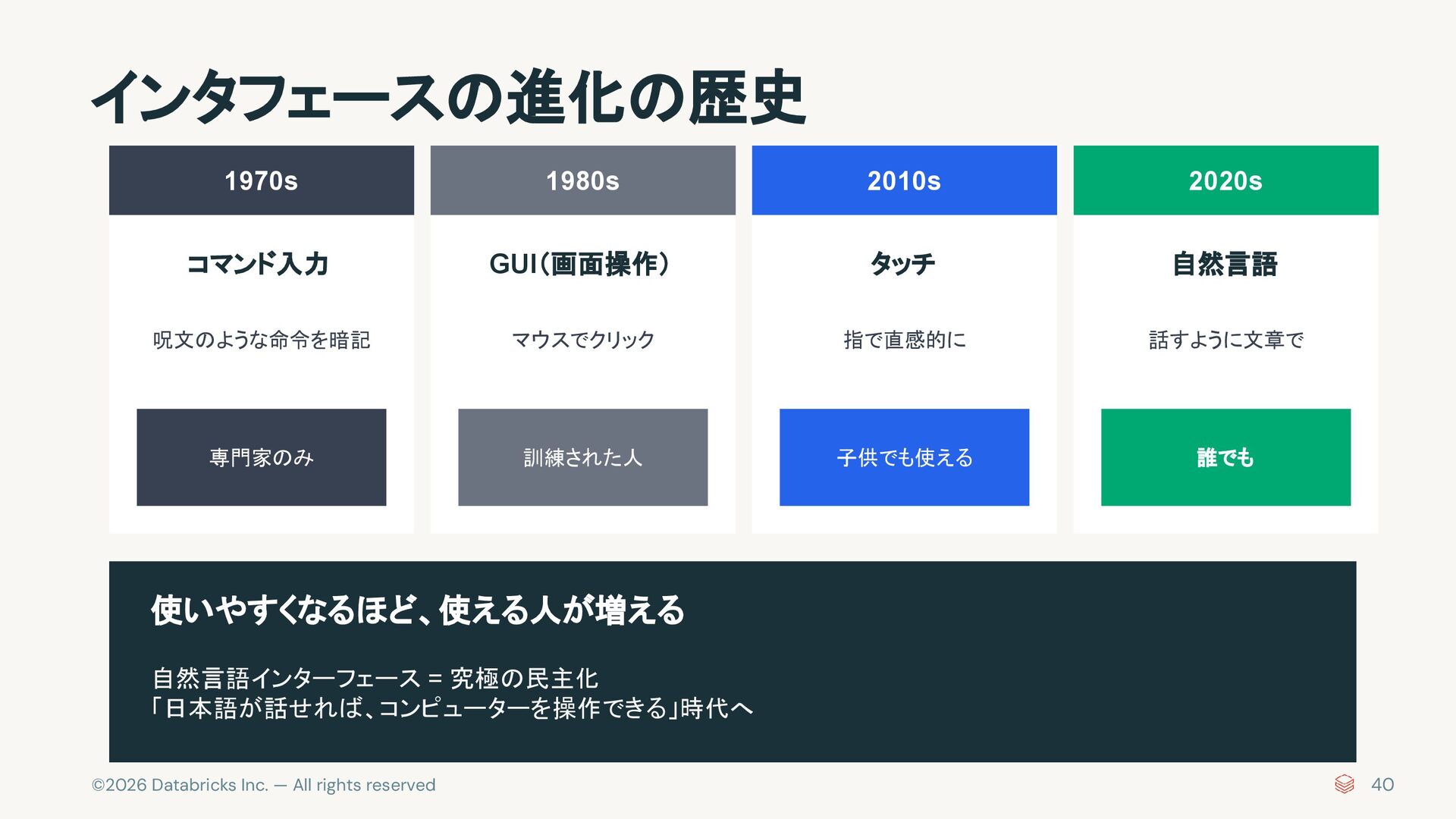 ©2026 Databricks Inc. — All rights reserved インタフェースの進化の歴史 40 1970s