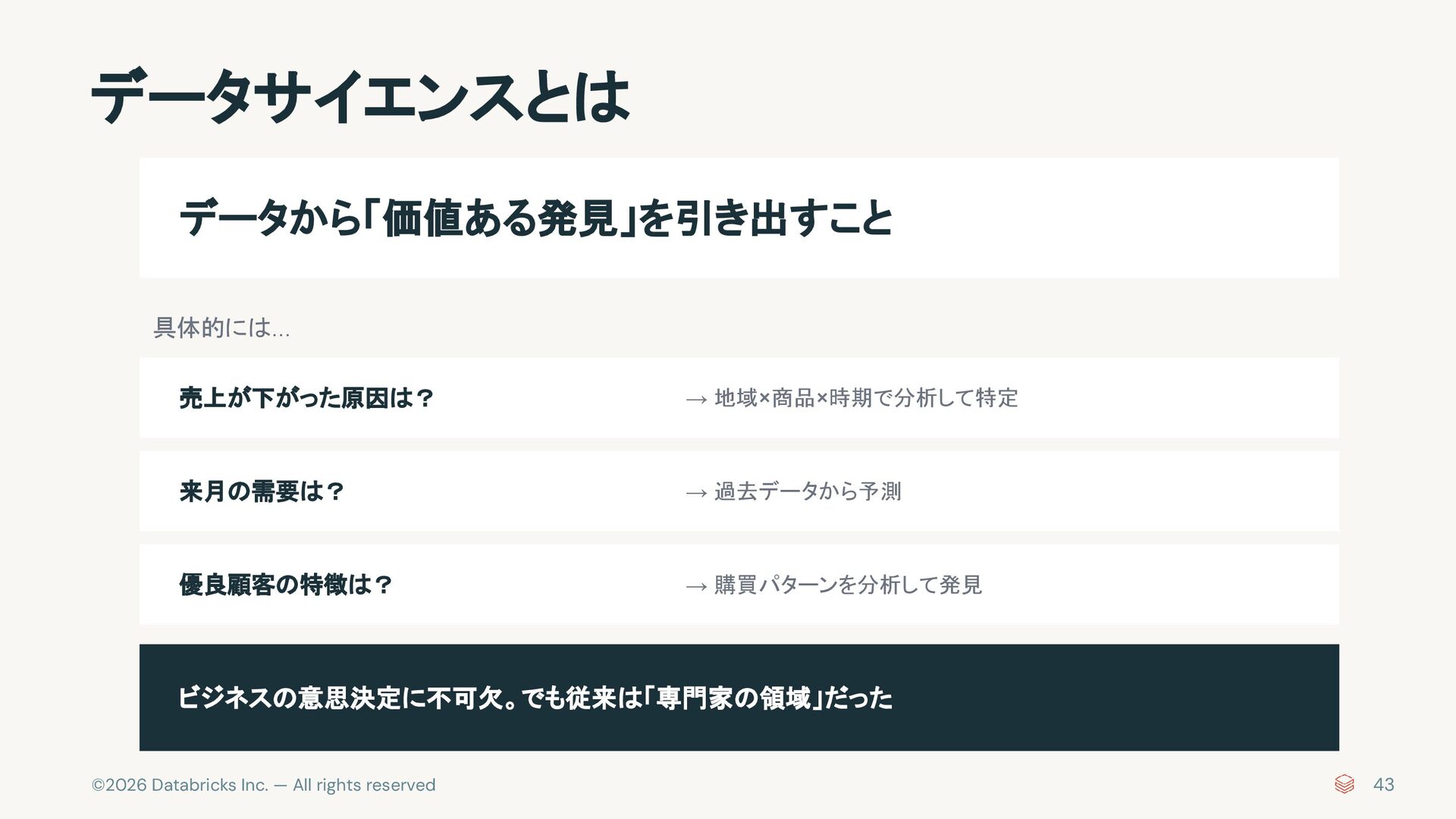 ©2026 Databricks Inc. — All rights reserved データサイエンスとは 43 データから「価値ある発見」を引き出すこと