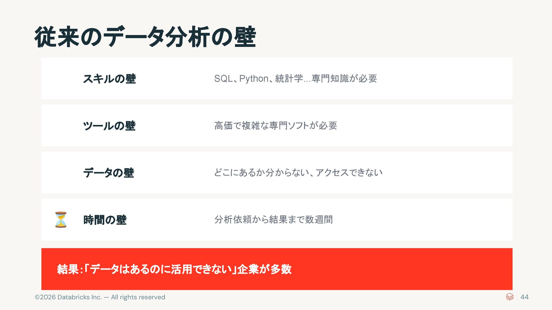 ©2026 Databricks Inc. — All rights reserved 従来のデータ分析の壁 44 スキルの壁
