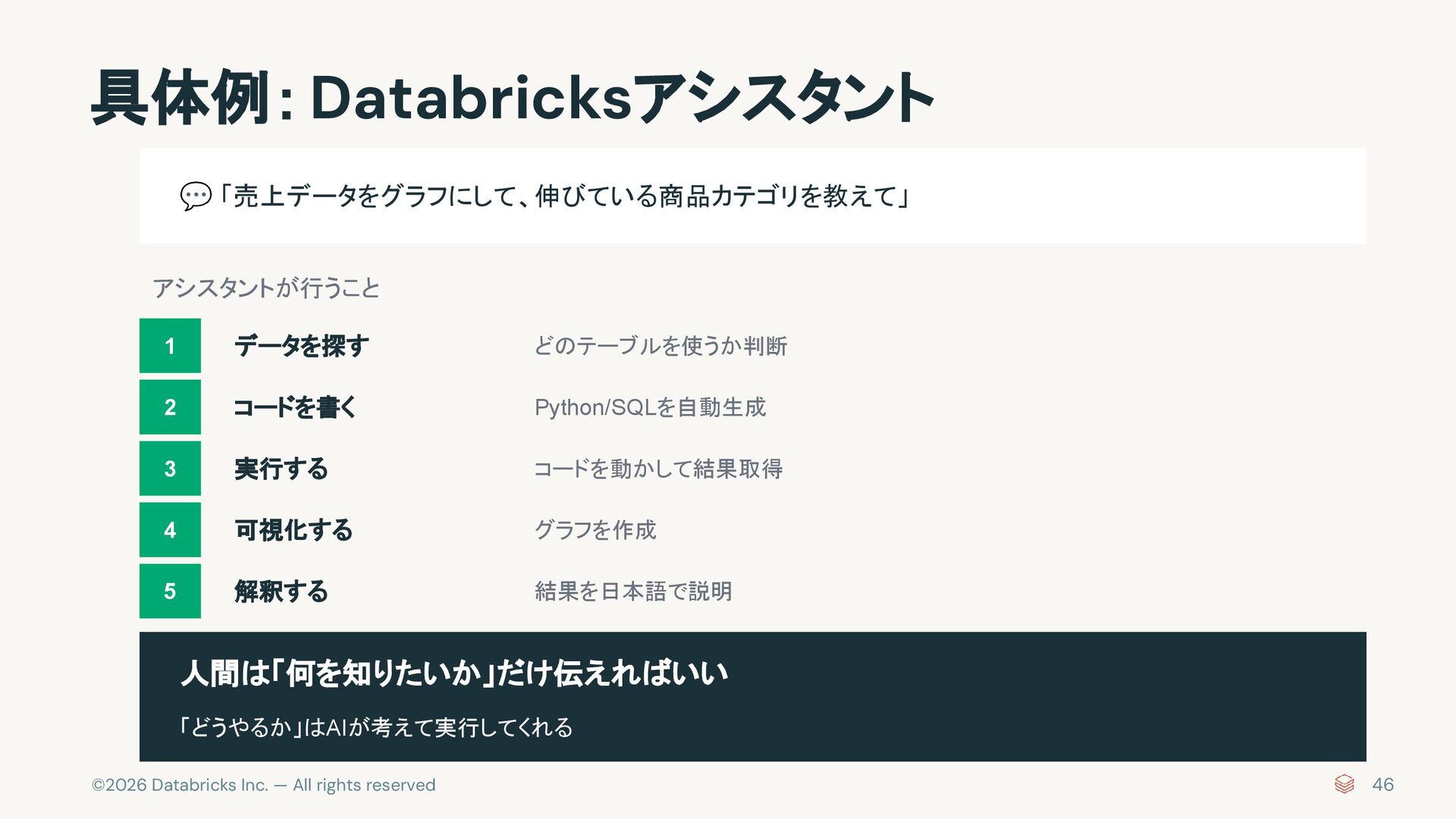 「売上データをグラフにして、伸びている商品カテゴリを教えて」 アシスタントが行うこと 1 データを探す どのテーブルを使うか判断 2 コードを書く Python/SQLを自動生成 3 実行する コードを動かして結果取得 4 可視化する グラフを作成 5 解釈する 結果を日本語で説明 人間は「何を知りたいか」だけ伝えればいい 「どうやるか」はAIが考えて実行してくれる