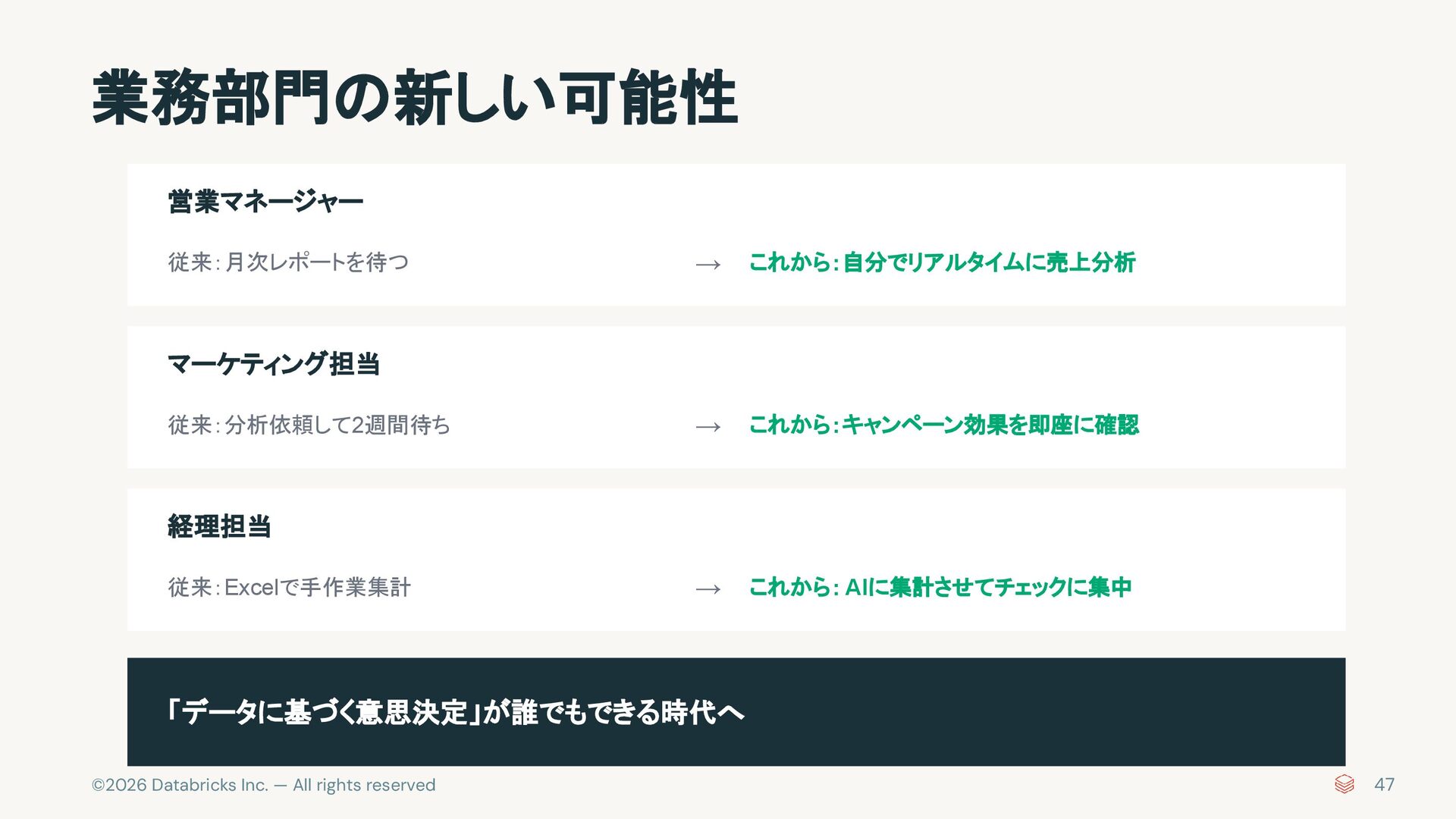 ©2026 Databricks Inc. — All rights reserved 3. データ分析の民主化 「誰でも分析できる」時代へ