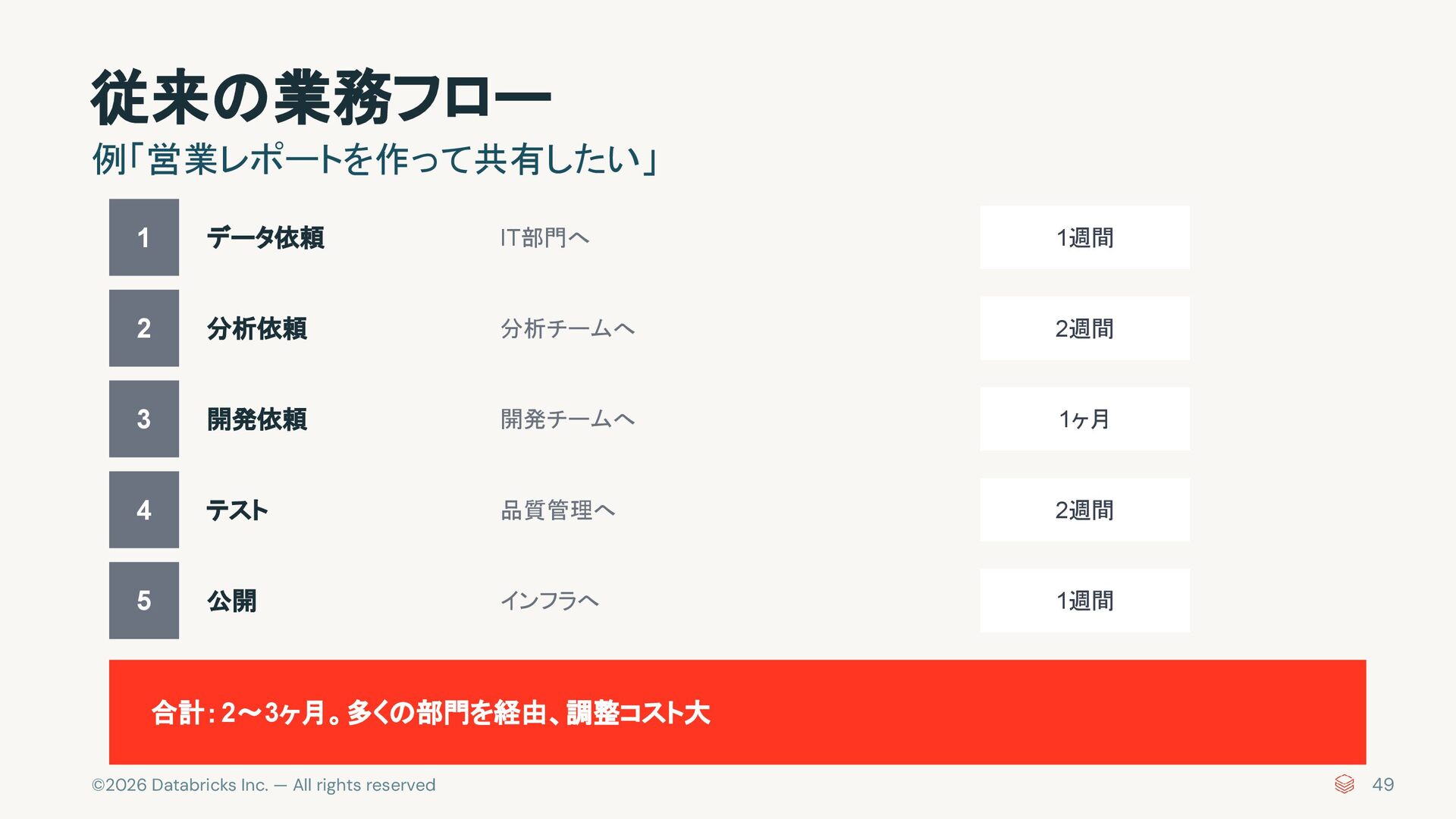 ©2026 Databricks Inc. — All rights reserved 従来の業務フロー 49 例「営業レポートを作って共有したい」