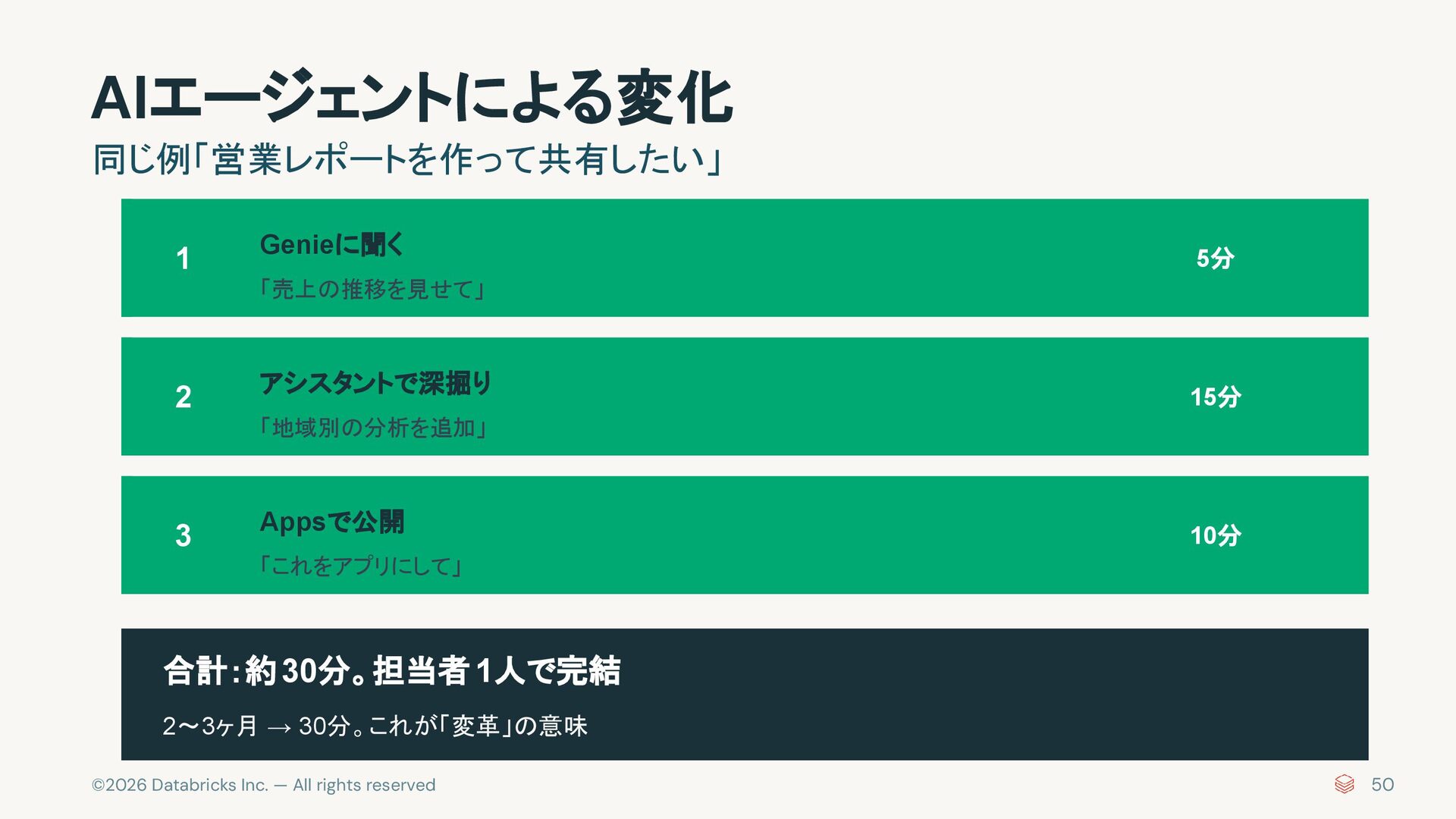 ©2026 Databricks Inc. — All rights reserved AIエージェントによる変化 50 同じ例「営業レポートを作って共有したい」