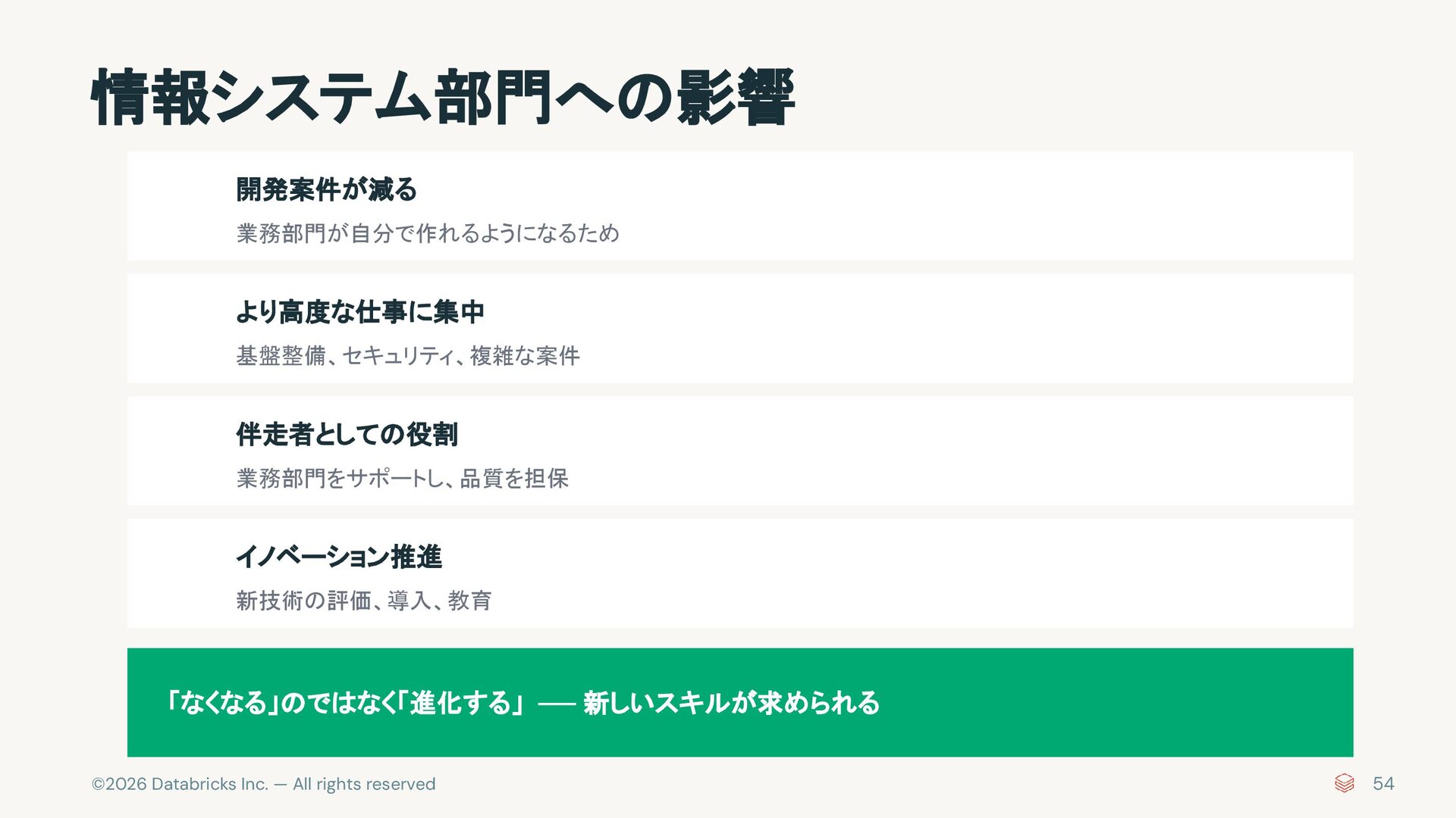 ©2026 Databricks Inc. — All rights reserved 情報システム部門への影響 54 開発案件が減る