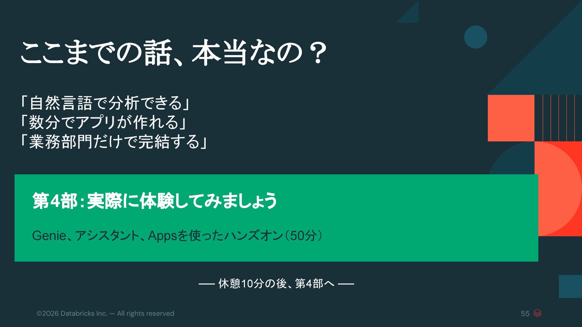 「数分でアプリが作れる」 「業務部門だけで完結する」 第4部:実際に体験してみましょう Genie、アシスタント、Appsを使ったハンズオン(50分) ── 休憩10分の後、第4部へ ──
