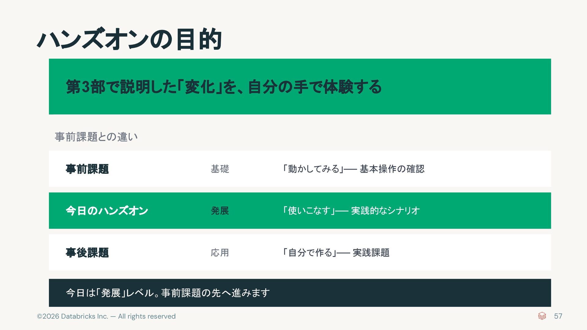 ©2026 Databricks Inc. — All rights reserved ハンズオンの目的 57 第3部で説明した「変化」を、自分の手で体験する