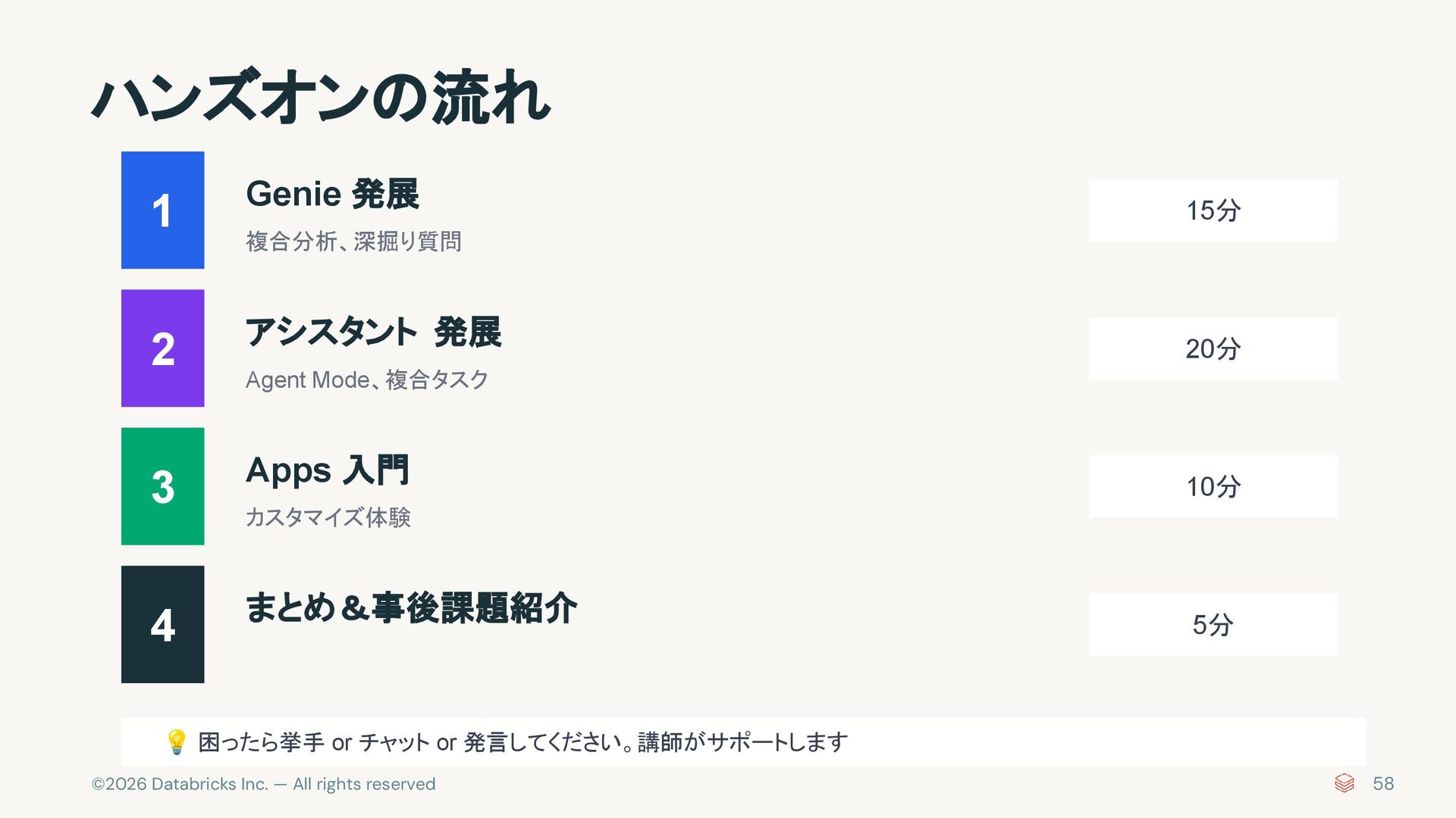 Genie 発展 複合分析、深掘り質問 15分 2 アシスタント 発展 Agent Mode、複合タスク 20分 3 Apps 入門 カスタマイズ体験 10分 4 まとめ&事後課題紹介 5分 💡 困ったら挙手 or チャット or 発言してください。講師がサポートします