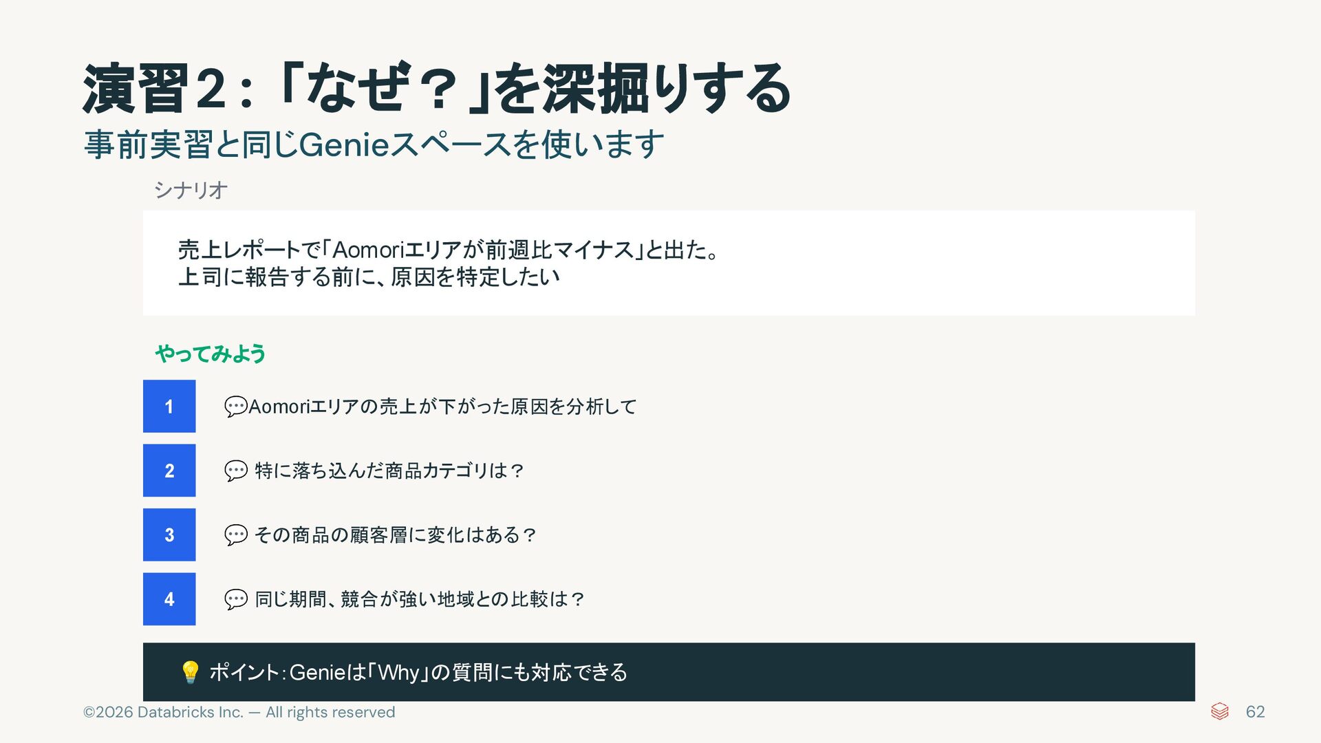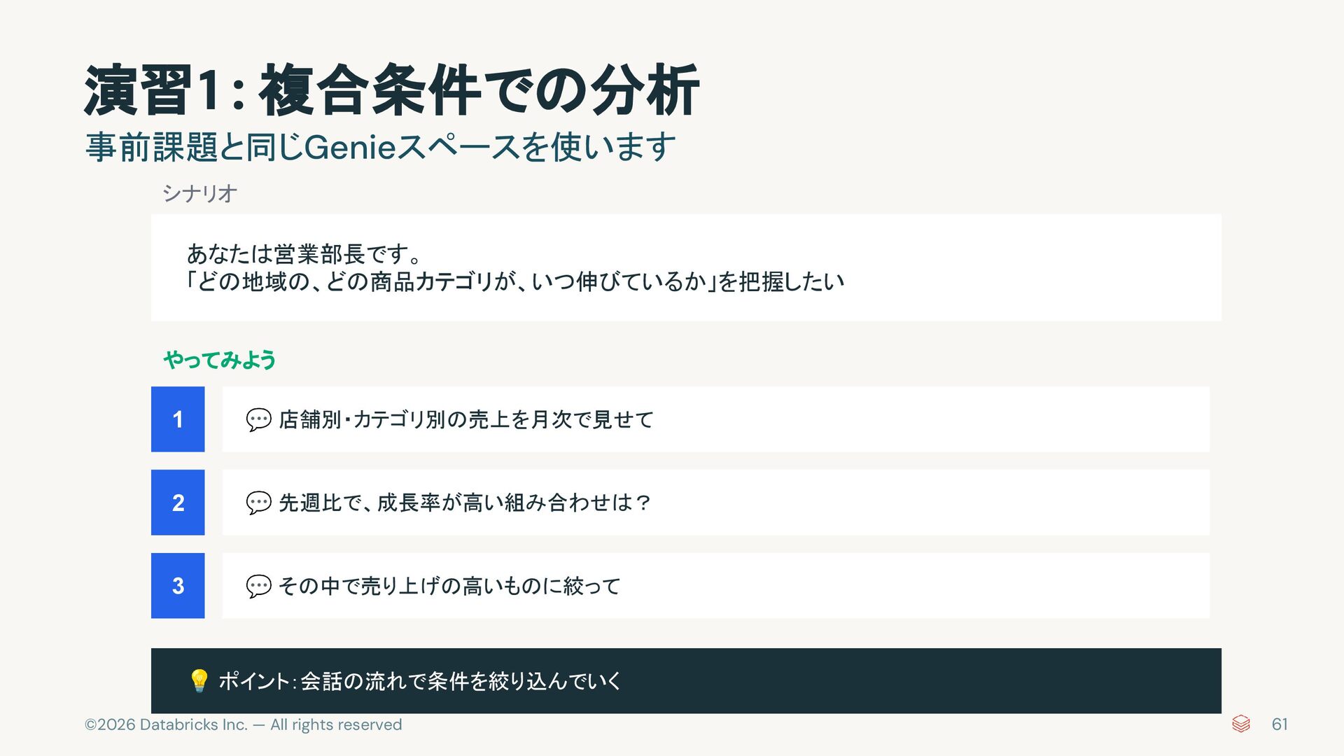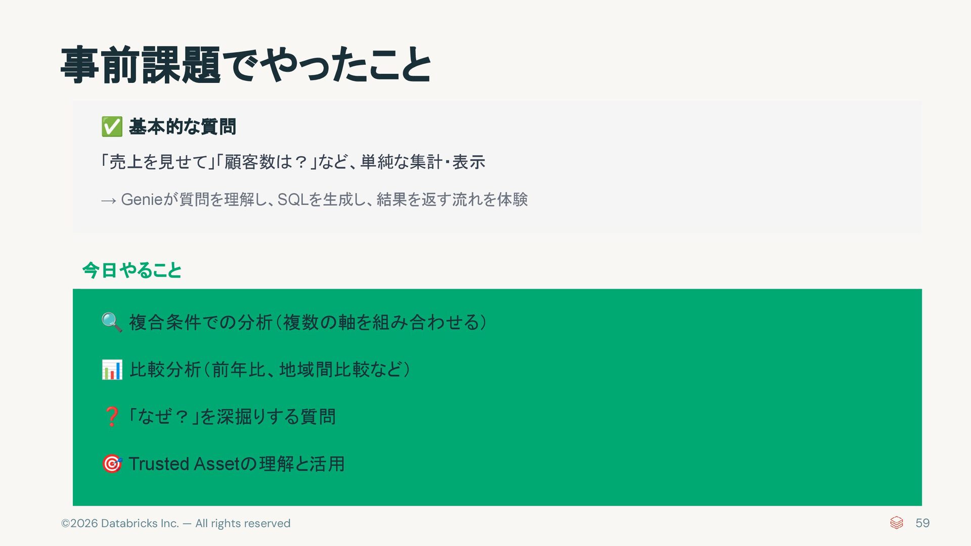 基本的な質問 「売上を見せて」「顧客数は?」など、単純な集計・表示 → Genieが質問を理解し、SQLを生成し、結果を返す流れを体験 今日やること 🔍 複合条件での分析(複数の軸を組み合わせる) 📊 比較分析(前年比、地域間比較など) ❓ 「なぜ?」を深掘りする質問 🎯 Trusted Assetの理解と活用