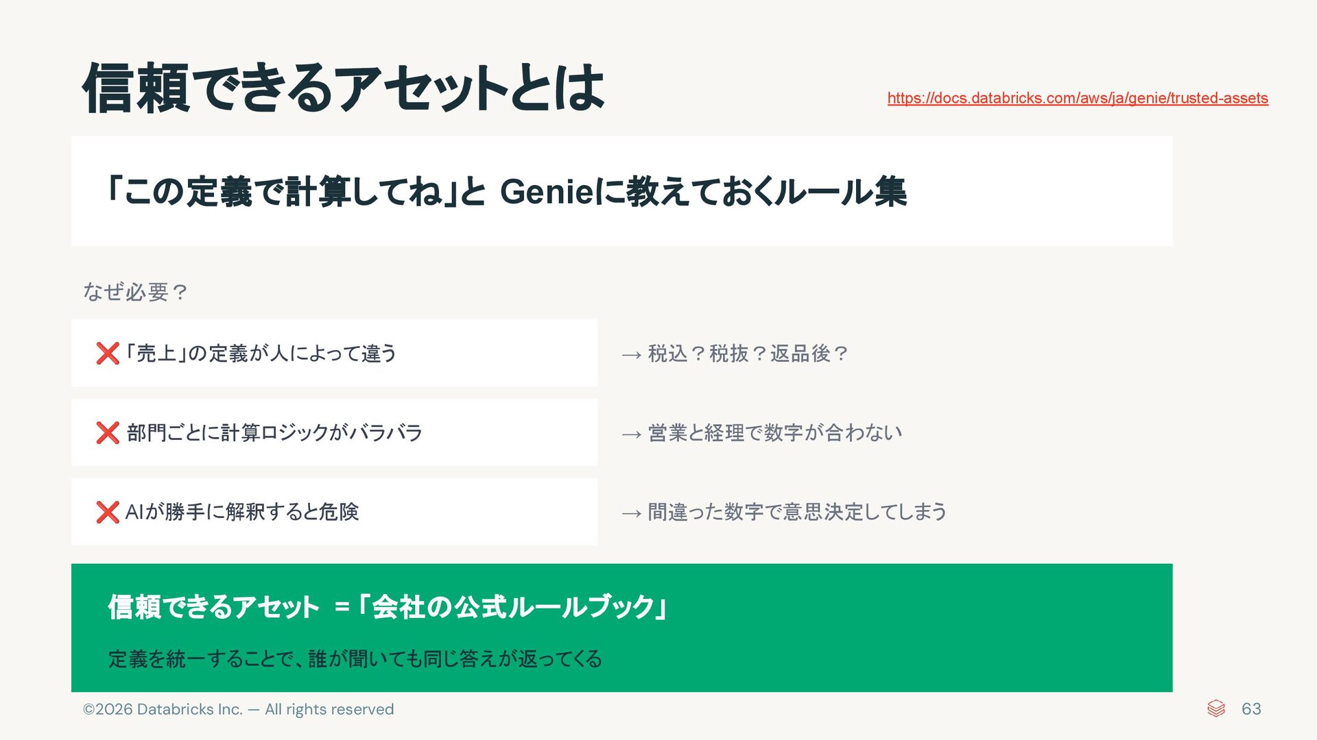 Genieに教えておくルール集 なぜ必要? ❌ 「売上」の定義が人によって違う → 税込?税抜?返品後? ❌ 部門ごとに計算ロジックがバラバラ → 営業と経理で数字が合わない ❌ AIが勝手に解釈すると危険 → 間違った数字で意思決定してしまう 信頼できるアセット = 「会社の公式ルールブック」 定義を統一することで、誰が聞いても同じ答えが返ってくる https://docs.databricks.com/aws/ja/genie/trusted-assets