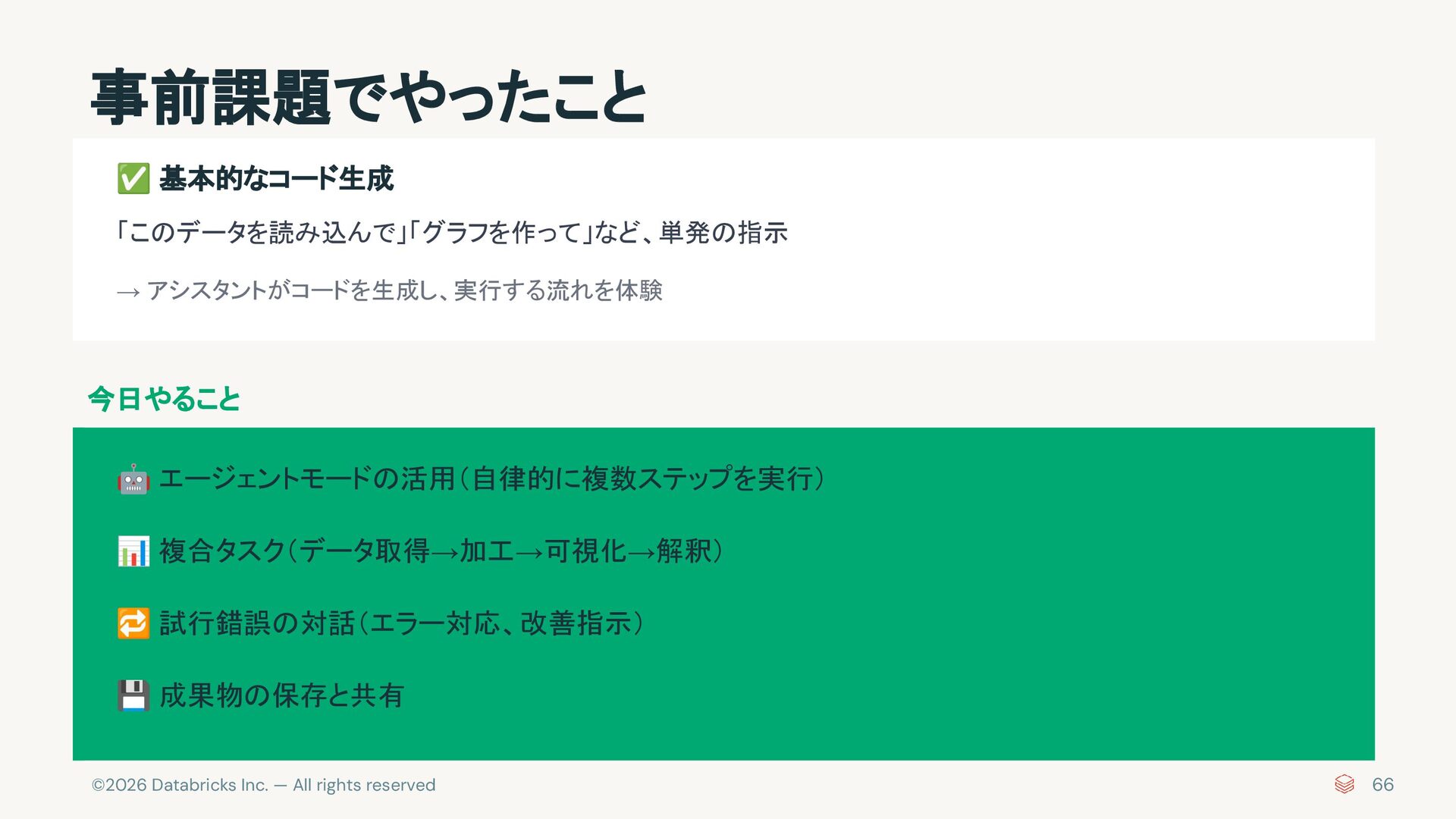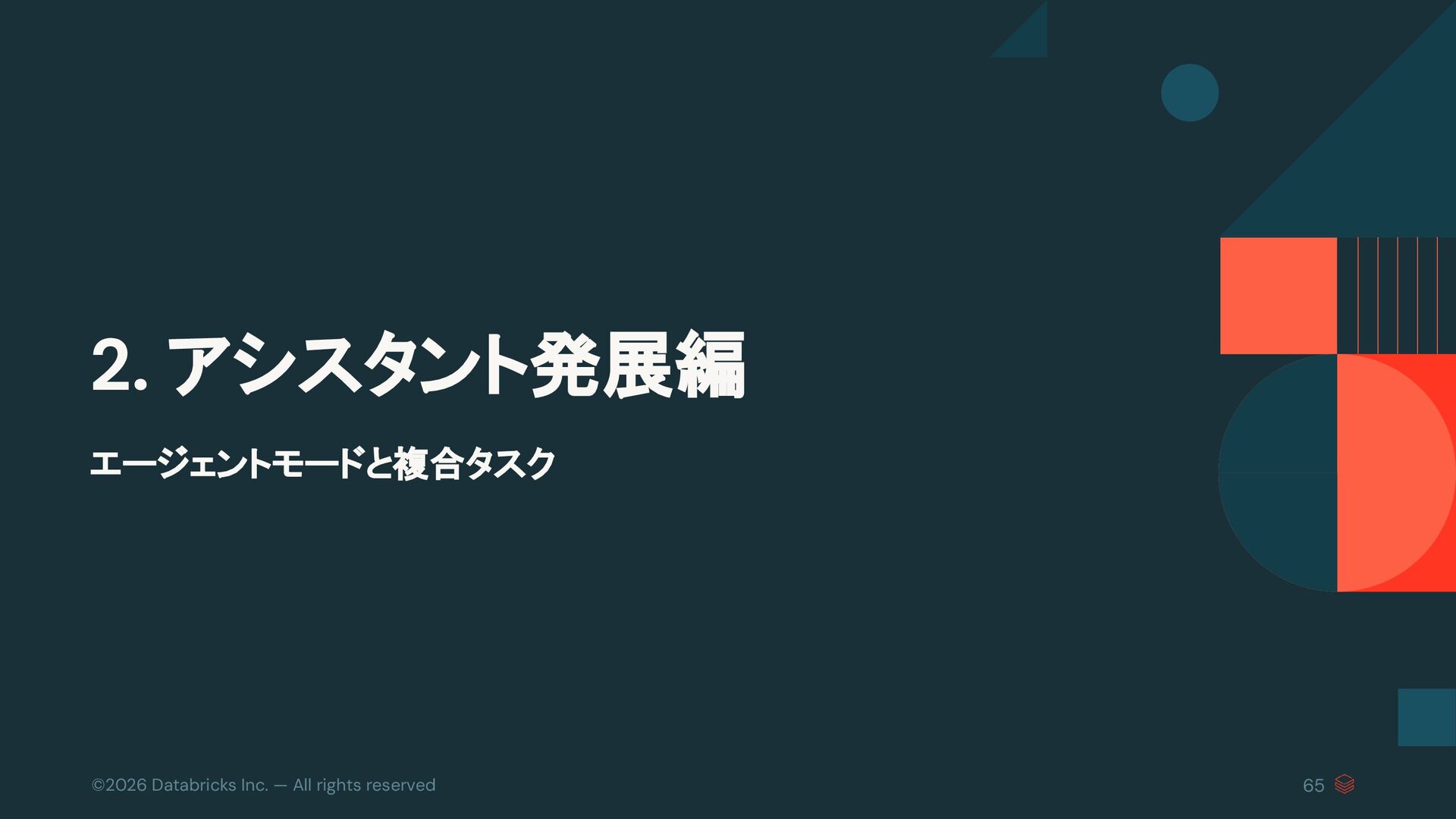 ©2026 Databricks Inc. — All rights reserved 2. アシスタント発展編 エージェントモードと複合タスク