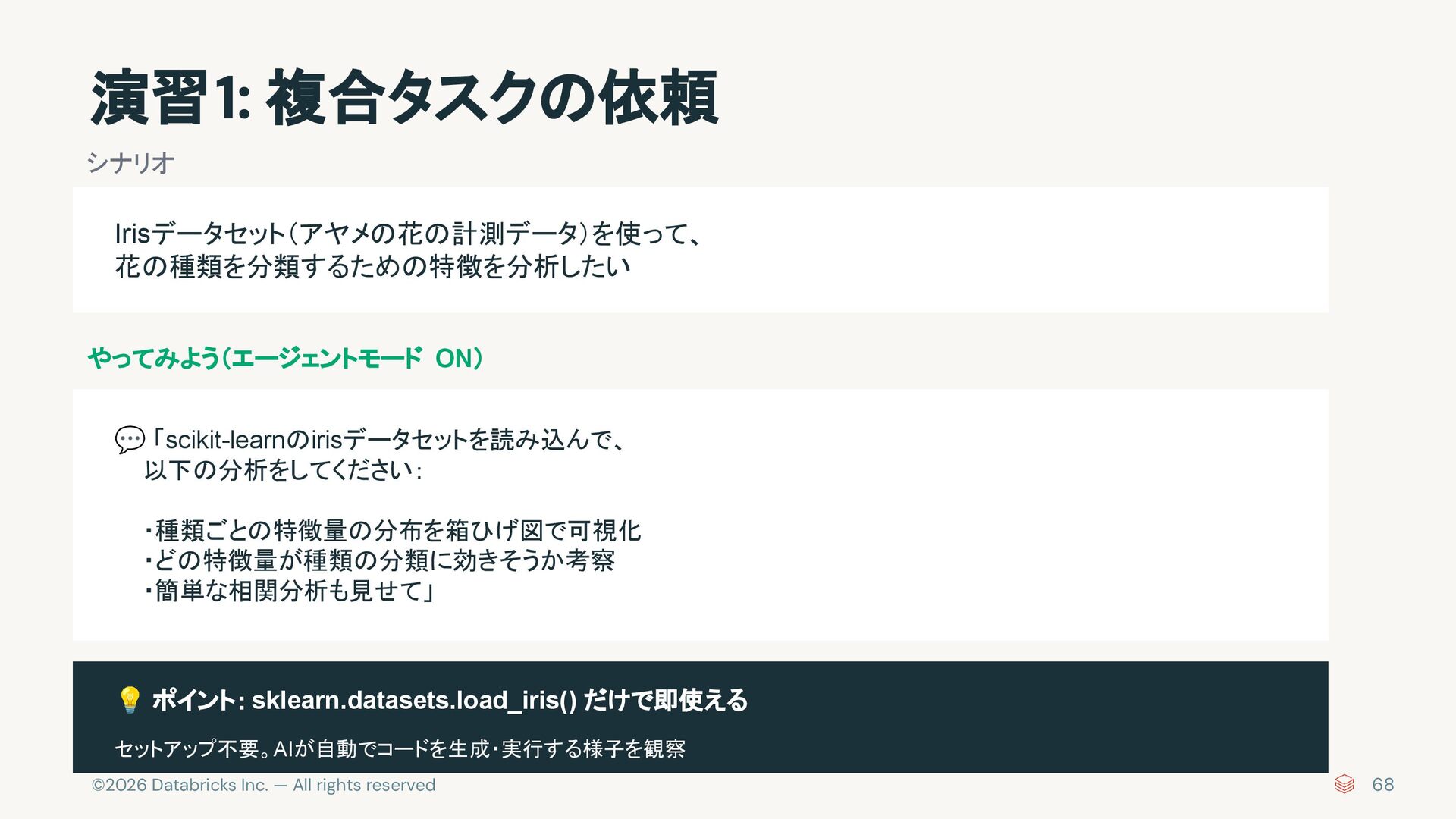 ©2026 Databricks Inc. — All rights reserved 演習1: 複合タスクの依頼 68