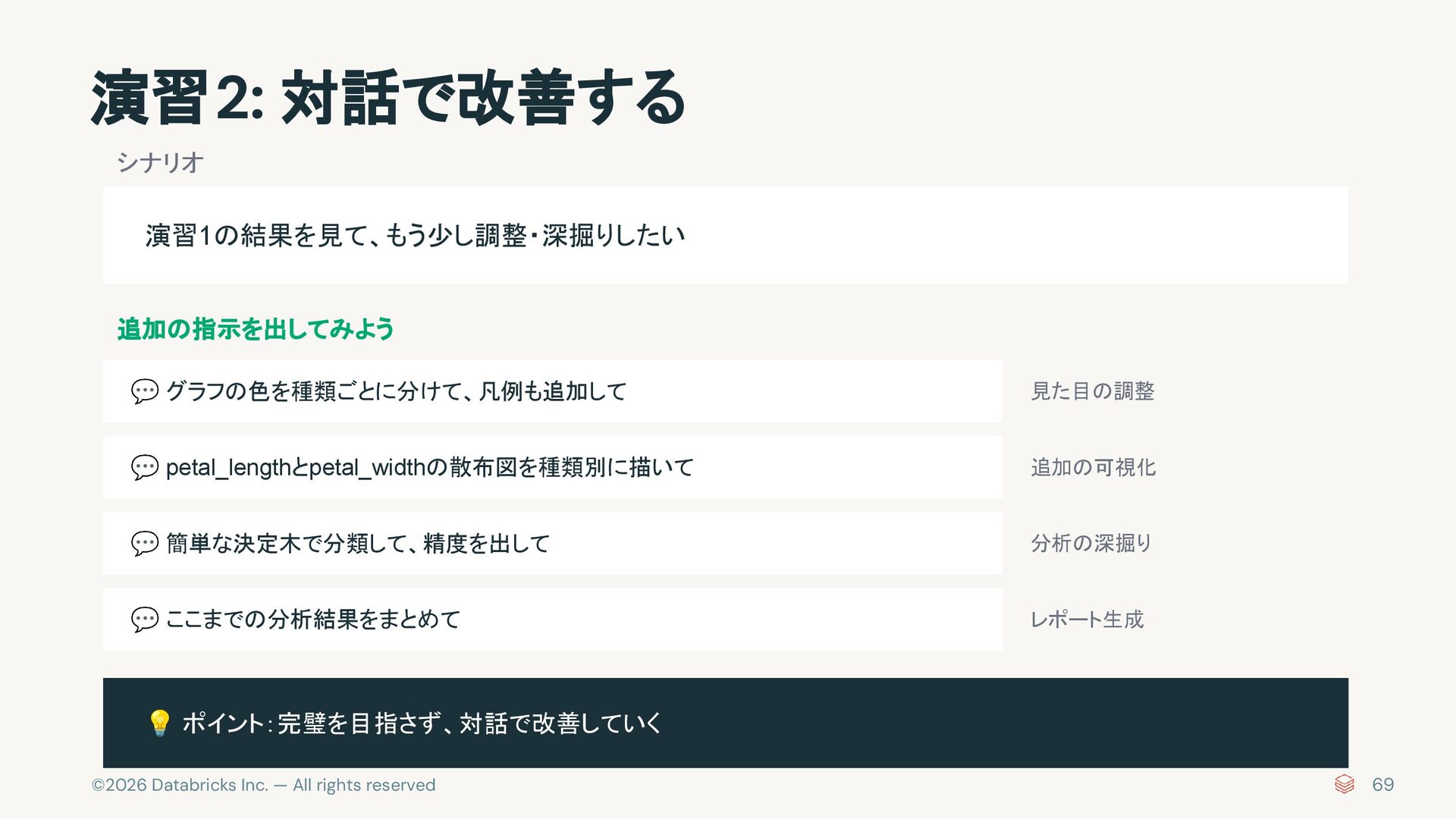 ©2026 Databricks Inc. — All rights reserved 演習2: 対話で改善する 69