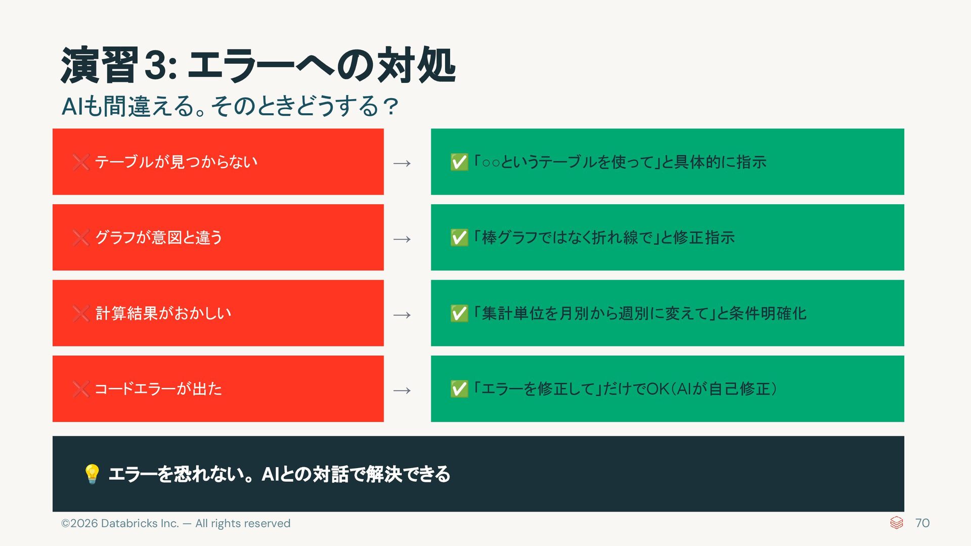 AIも間違える。そのときどうする? ❌ テーブルが見つからない → ✅ 「◦◦というテーブルを使って」と具体的に指示 ❌ グラフが意図と違う → ✅ 「棒グラフではなく折れ線で」と修正指示 ❌ 計算結果がおかしい → ✅ 「集計単位を月別から週別に変えて」と条件明確化 ❌ コードエラーが出た → ✅ 「エラーを修正して」だけでOK(AIが自己修正) 💡 エラーを恐れない。 AIとの対話で解決できる
