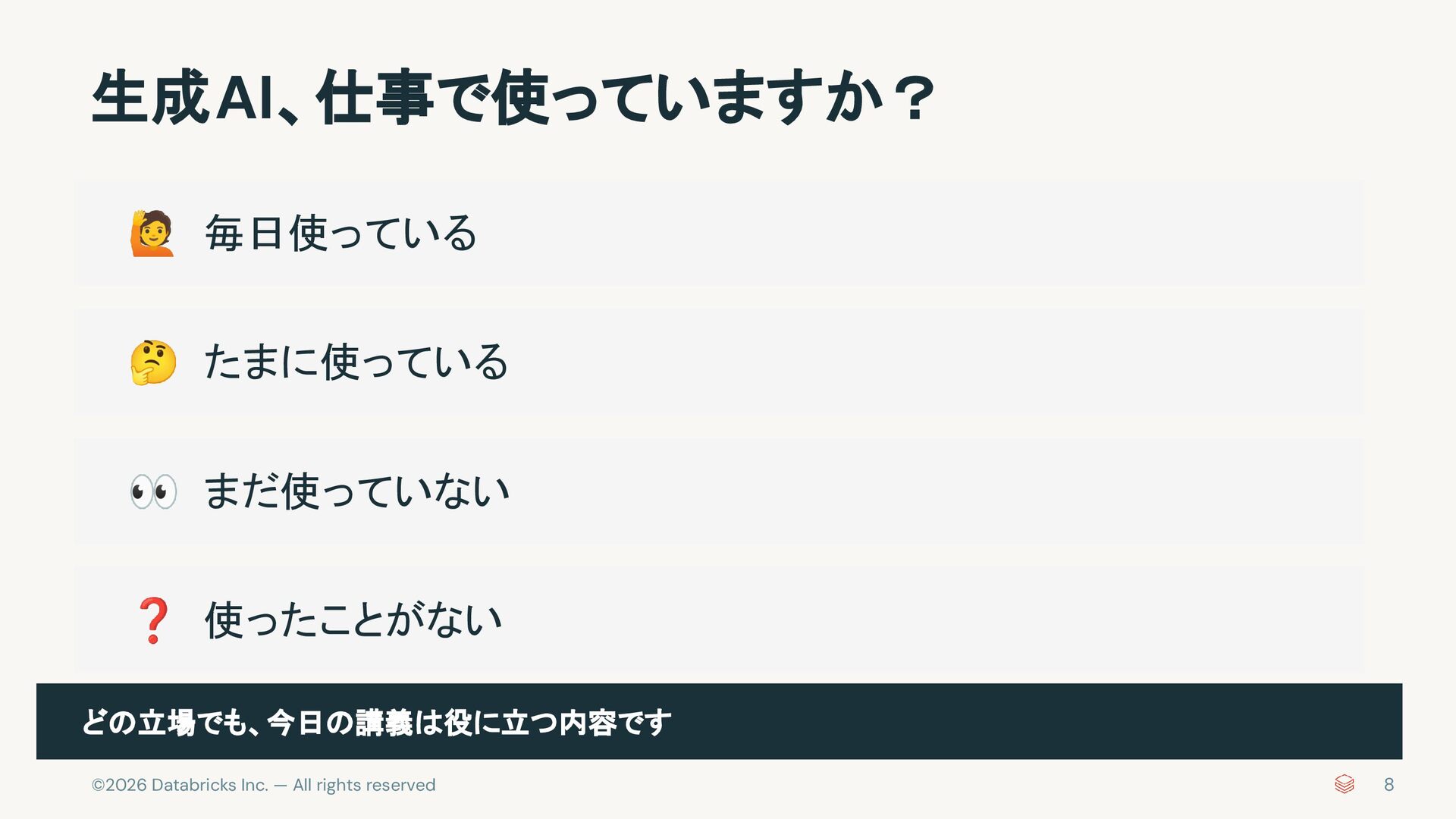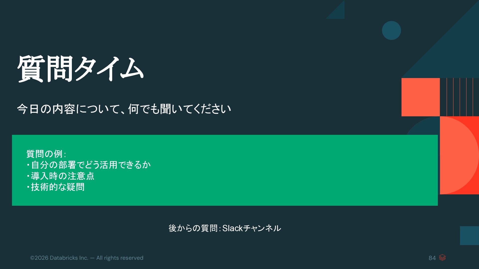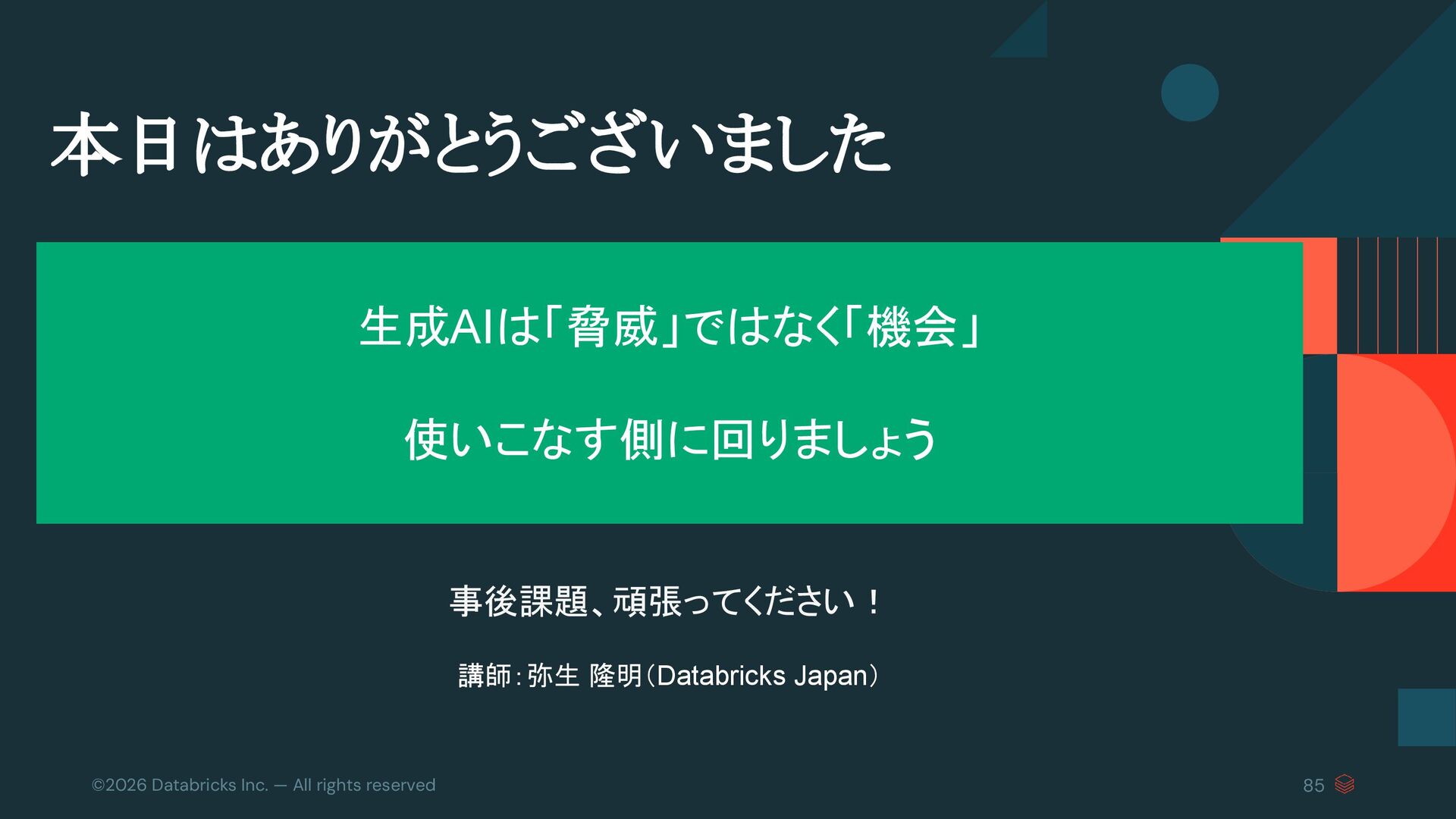 ©2026 Databricks Inc. — All rights reserved 85 本日はありがとうございました 生成AIは「脅威」ではなく「機会」