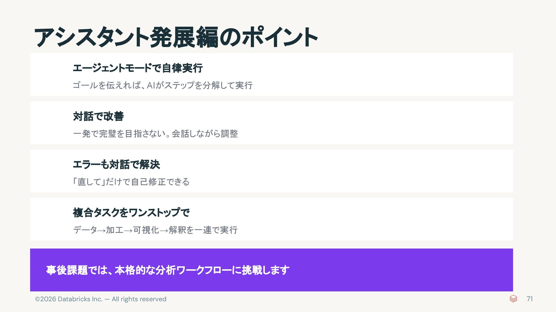 ©2026 Databricks Inc. — All rights reserved アシスタント発展編のポイント 71 エージェントモードで自律実行