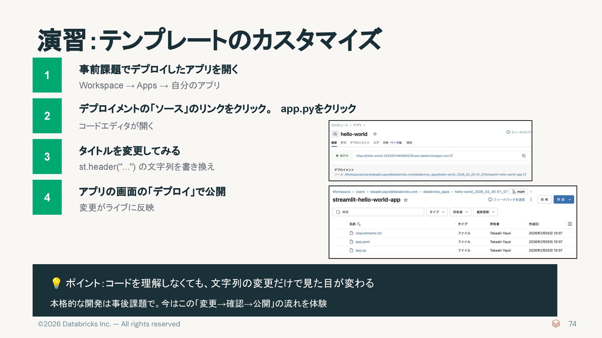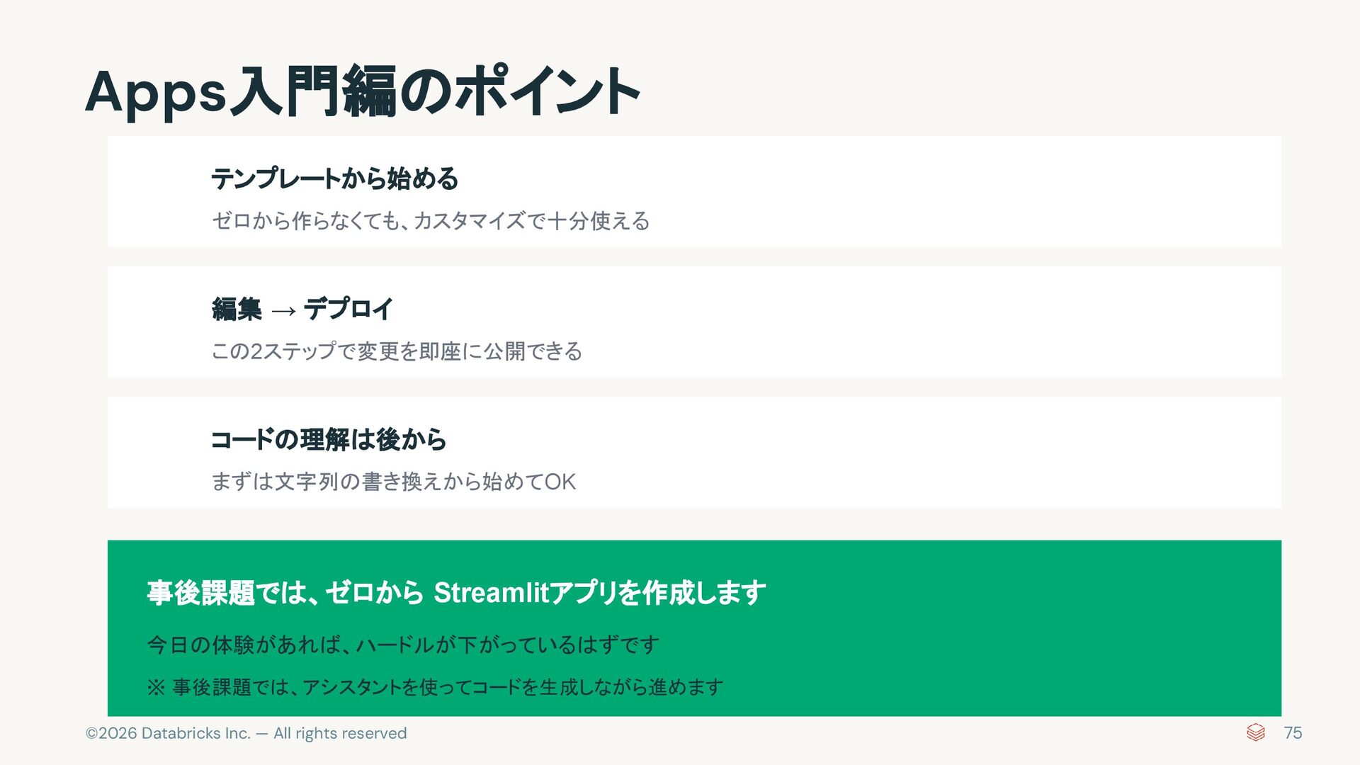 事前課題でデプロイしたアプリを開く Workspace → Apps → 自分のアプリ 2 デプロイメントの「ソース」のリンクをクリック。 app.pyをクリック コードエディタが開く 3 タイトルを変更してみる st.header("...") の文字列を書き換え 4 アプリの画面の「デプロイ」で公開 変更がライブに反映 💡 ポイント:コードを理解しなくても、文字列の変更だけで見た目が変わる 本格的な開発は事後課題で。今はこの「変更→確認→公開」の流れを体験